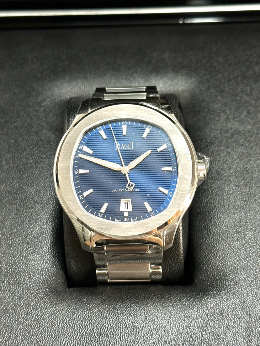伯爵/Piaget Piaget Polo Date腕錶 G0A41002 自动上链机械 精钢 42毫米 专柜价112000 蓝色横向格纹表盘 棒状夜光时标 蓝宝石玻璃 背透100米防水 日历显示 国行展示试戴品近新品相24年国行全套 好价~