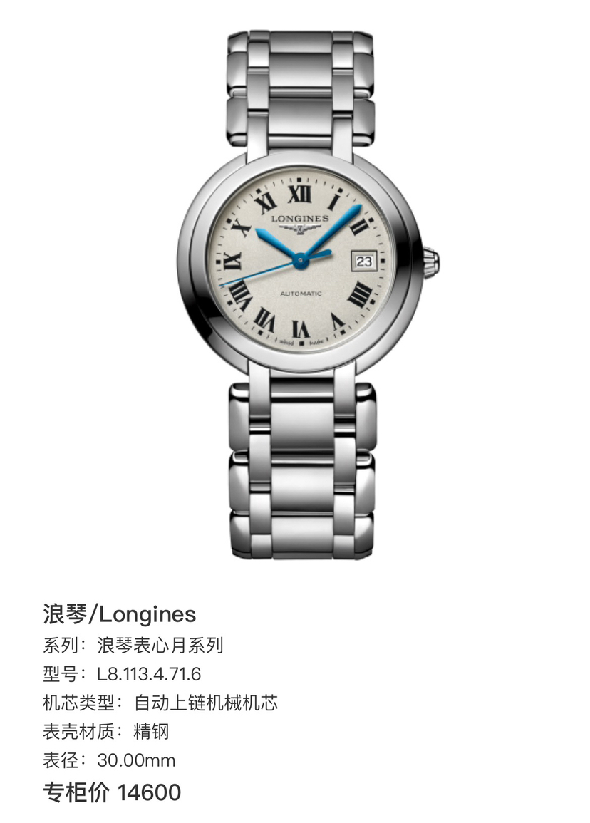浪琴/Longines 浪琴表心月系列 L8.113.4.71.6 自动上链机械机芯 精钢 30.00mm 专柜价14600~