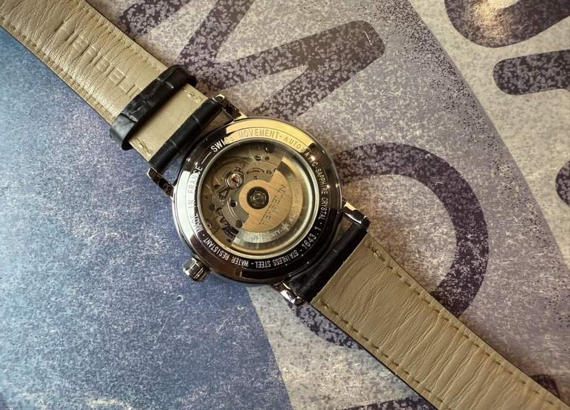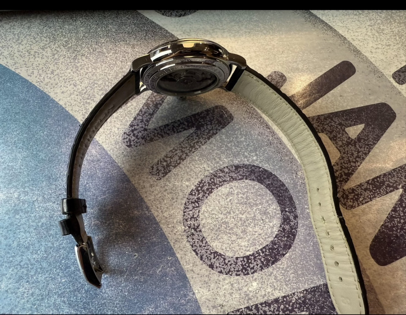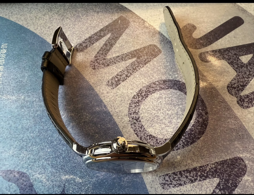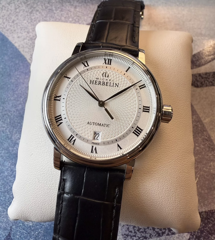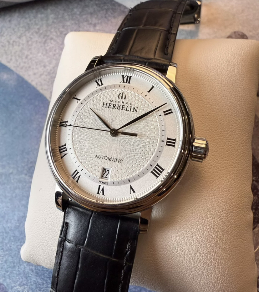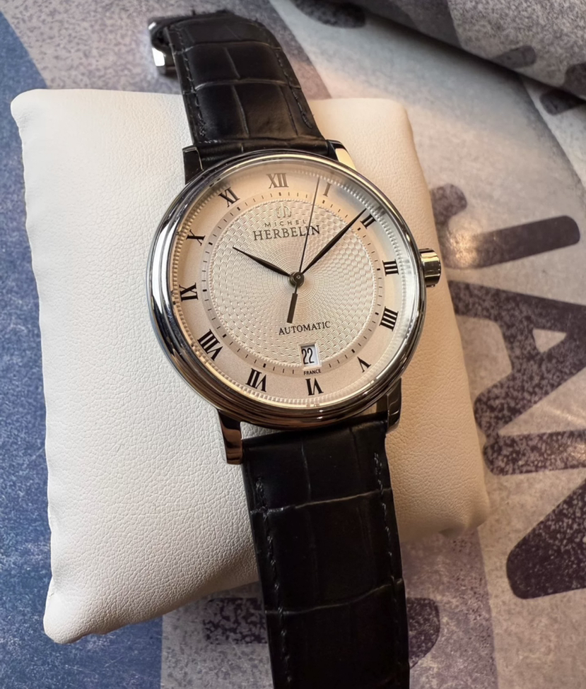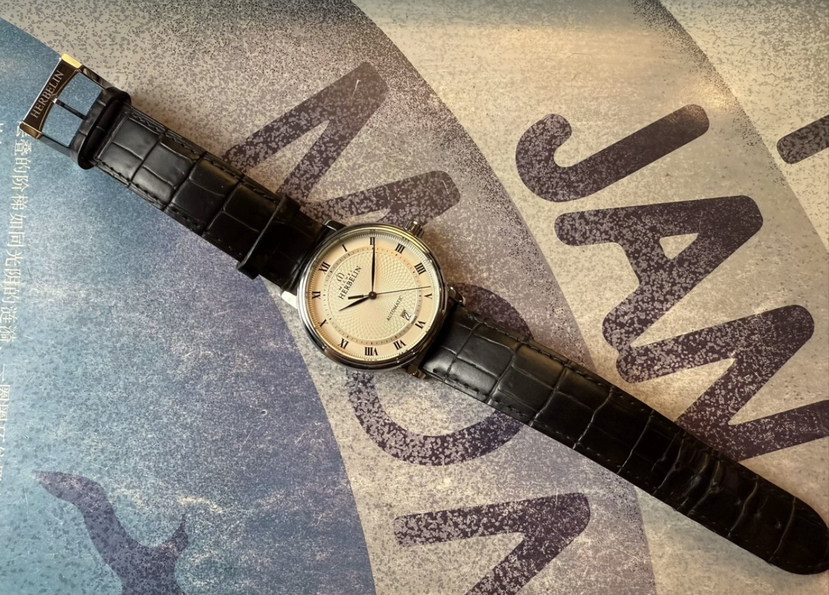 赫柏林大都会系列诺曼底公爵机械腕表,表径39毫米,厚10毫米,平面蓝宝石镜面,白色盘面装饰细腻的纹路,黑色罗马文刻度,黑色柳叶形指针,6点日历,推拉式表冠,搭载sw200机芯,走时天文台级别,好成色单表