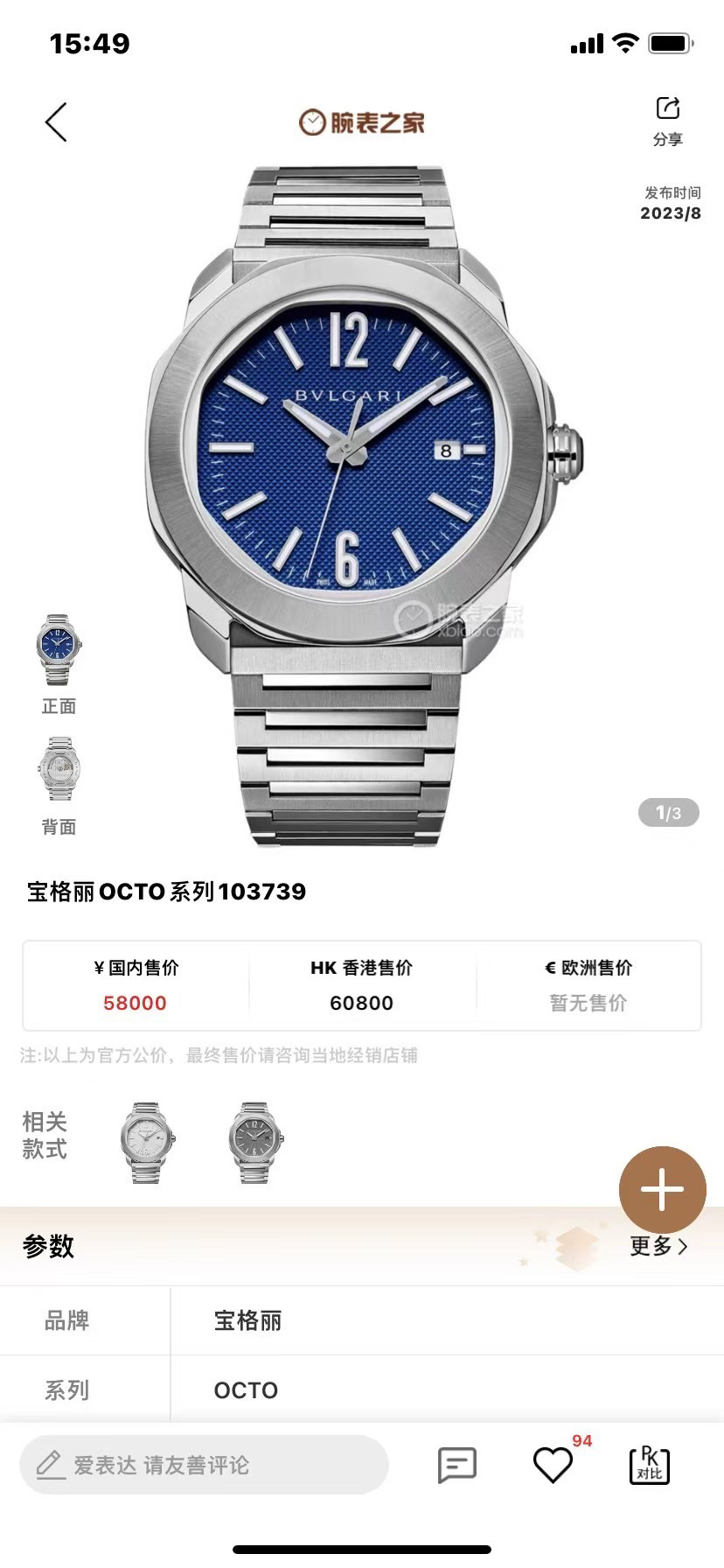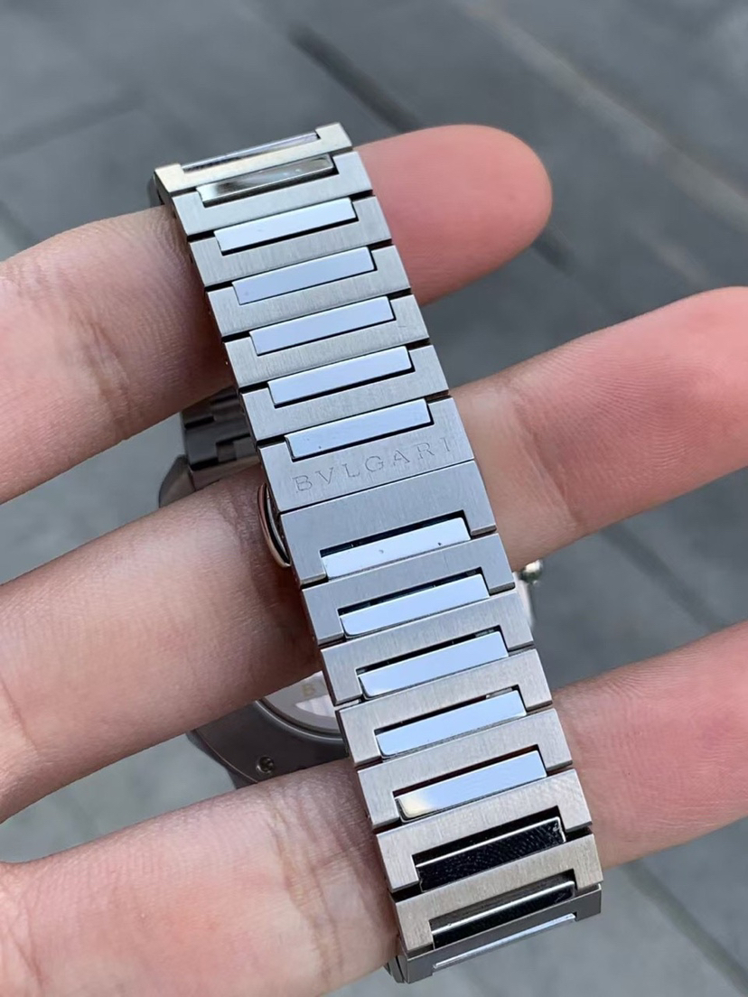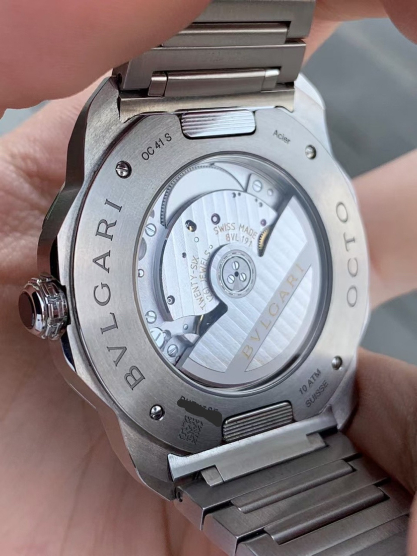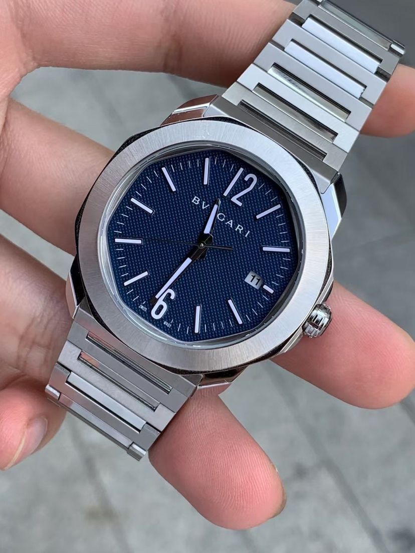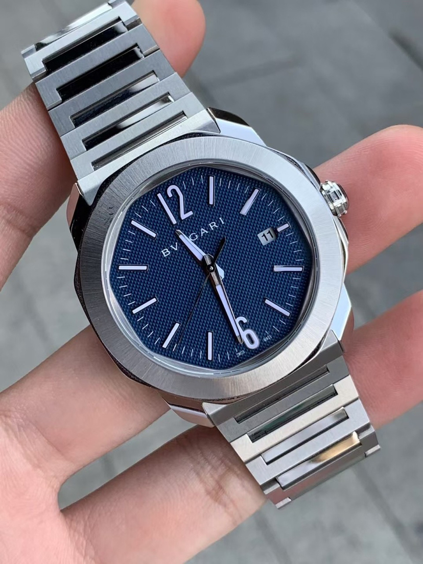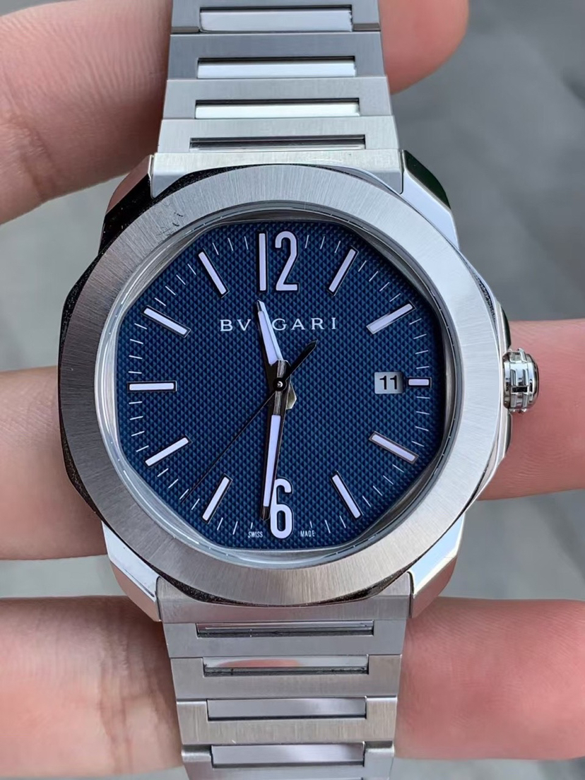 宝格丽Bvlgari OCTO ROMA 103739 Octo Roma Automatic 腕表,搭载机械机芯,自动上链,精钢抛光和缎面发丝纹表壳,可换式表带,蓝色巴黎钉纹表盘,采用似圆非圆的八角形表壳,堪称是现代风格的象征,运用罗马灵感将义大利设计和瑞士制表工艺结合在一起。独特美学核心融入高级钟表元素,蓝色表盘饰以巴黎钉纹,搭配 Super-LumiNova® 夜光指针和时标,BVL 191 机芯。表径 41毫米,防水深度 100 公尺。佩戴舒适度极强~