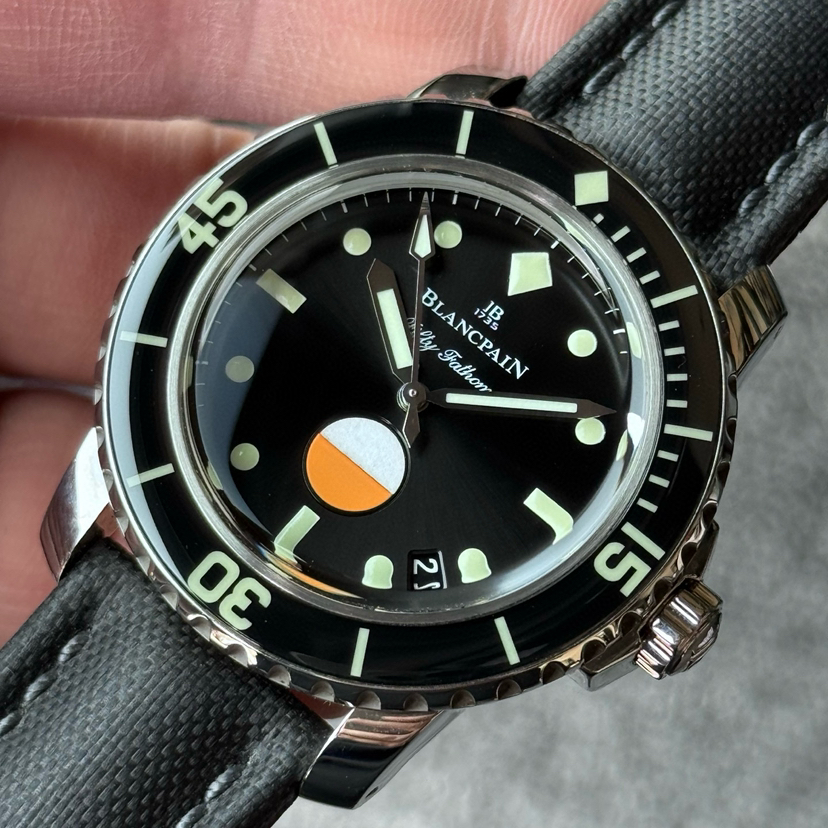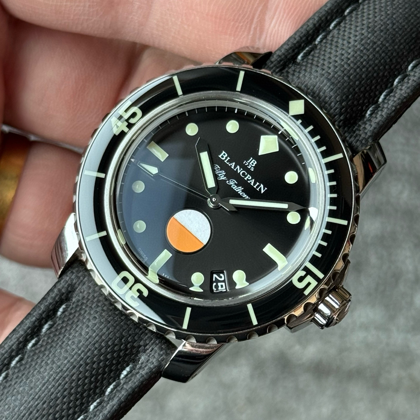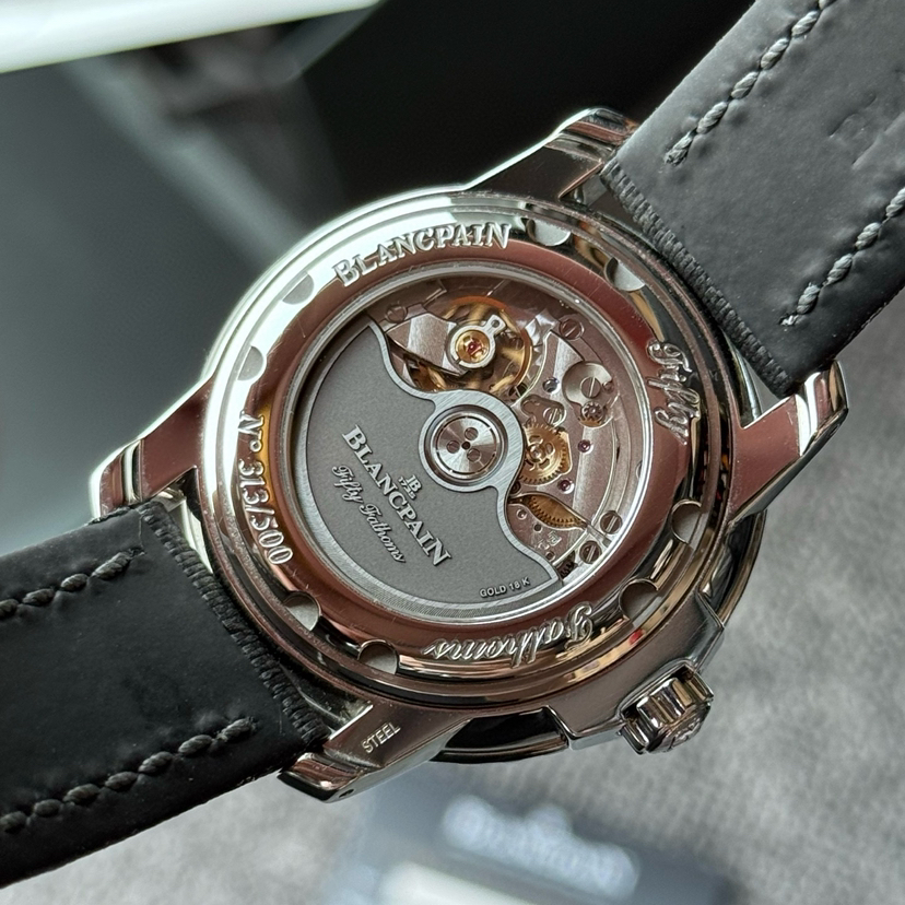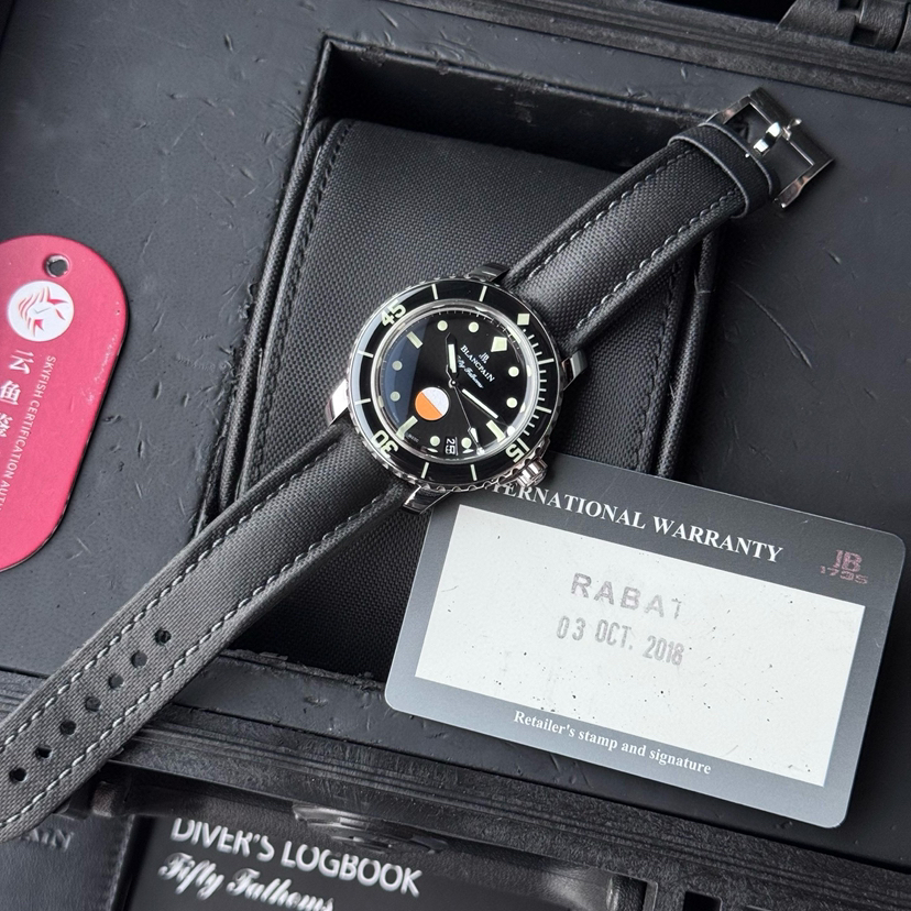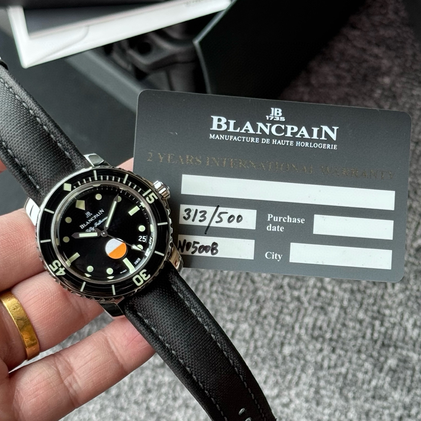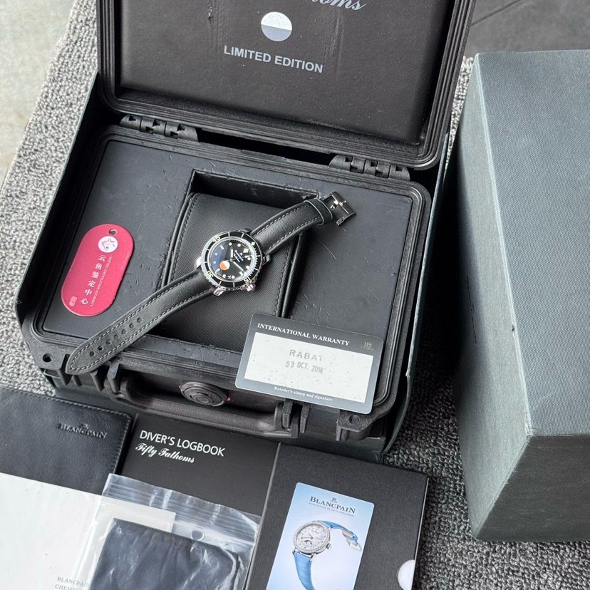 宝珀五十噚系列 5008-1130-B52A 湿度计小太阳,自动机械腕表,全套附件如图,2018 年 10 月购入(有云鱼鉴定报告) 40.3mm 表径,全球限量 500 只第 313 只,动力储备 100 小时,300m 防水,配备湿度指示器的黑色表盘,蓝宝石单向旋转表圈,日期显示,表况完美。公价 122000 现好价