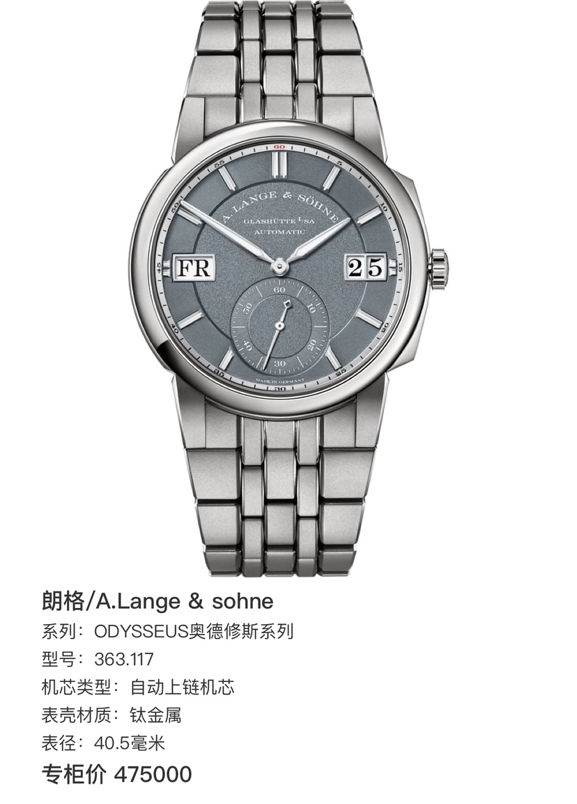 朗格/A.Lange & sohne ODYSSEUS奥德修斯系列 363.117 自动机械男士腕表,钛金属材质,40.5毫米表径,冰蓝灰表盘配色,全球限量250枚,专柜价475000,25年3月新鲜出炉,好价