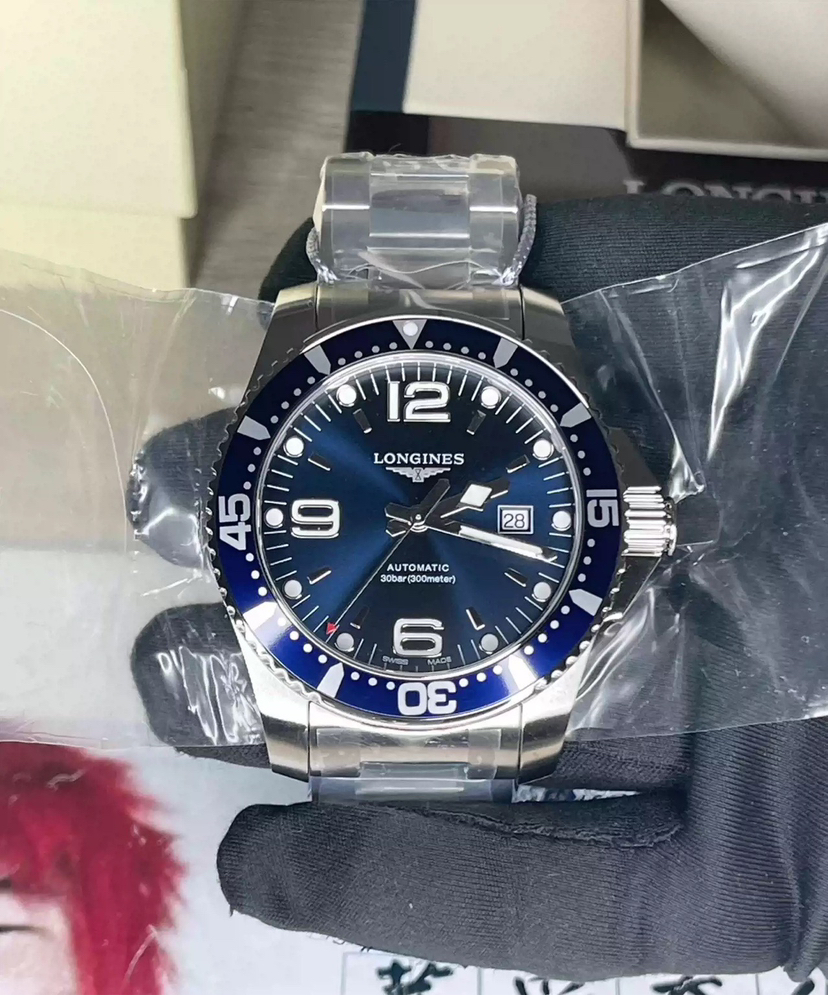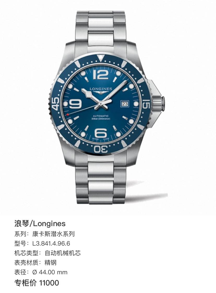 浪琴/Longines 康卡斯潜水系列 L3.841.4.96.6 自动上链机械机芯 精钢 44.00mm 专柜价11500~
