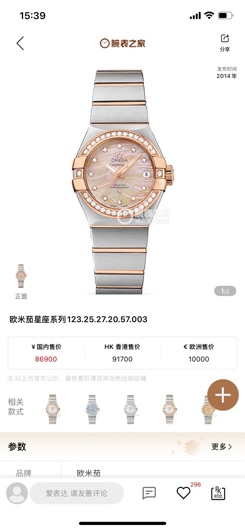 欧米茄/Omega 星座系列 123.25.27.20.57.003 自动上链 精钢‑红金 27 专柜价86900