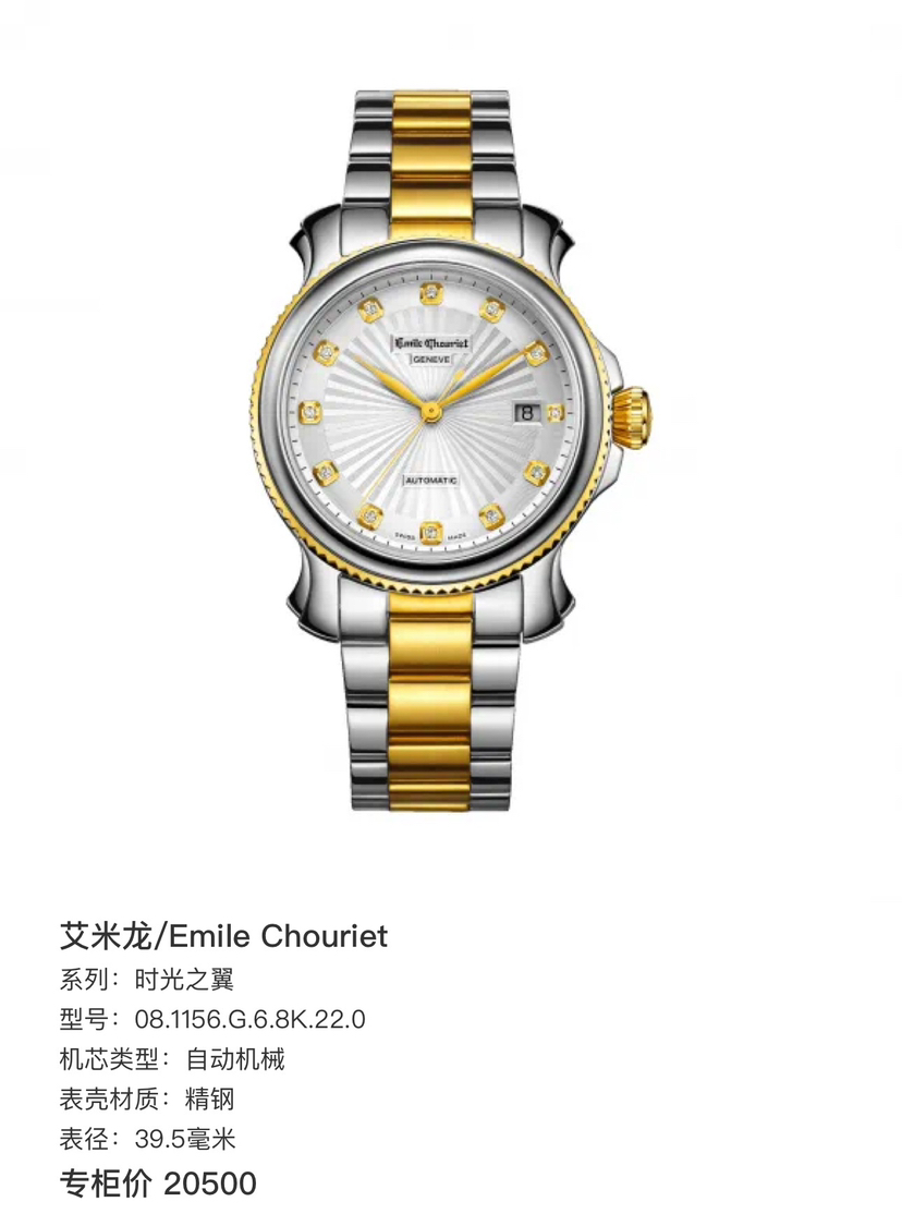 艾米龙时光之翼系列08.1156.G.6.8K.22.0男士自动机械腕表,公价20500元,表径39.5mm,单表,18k金/精钢材质,走时精准稳定