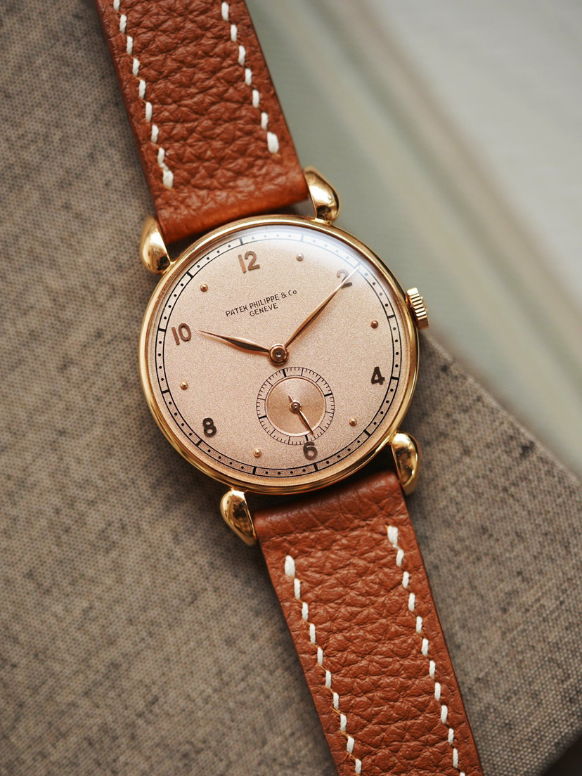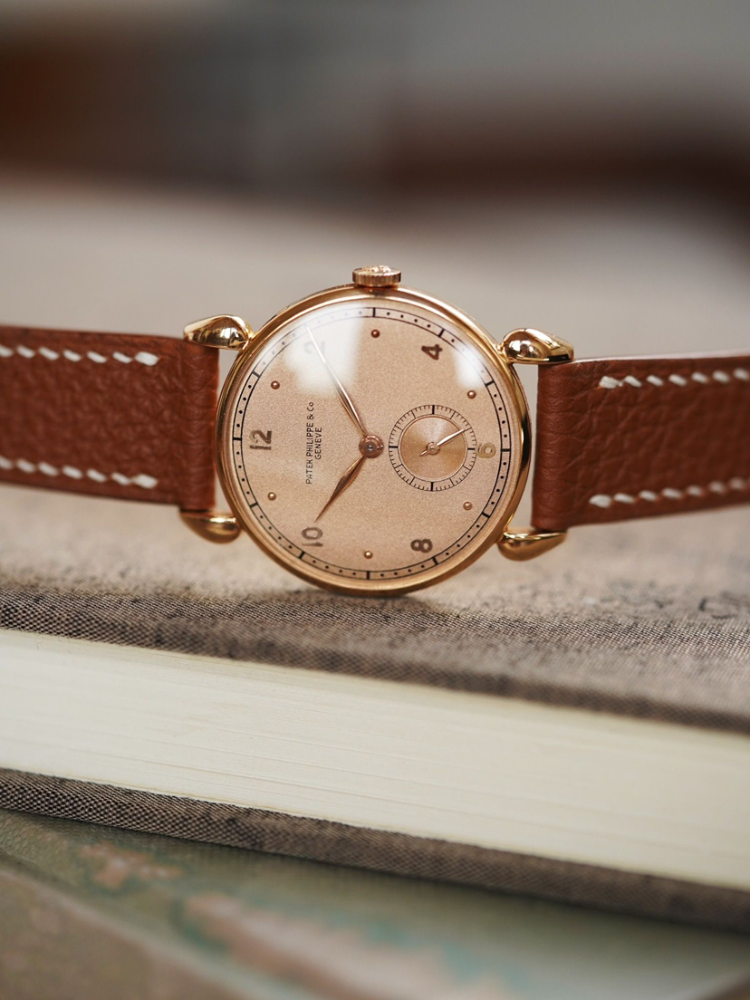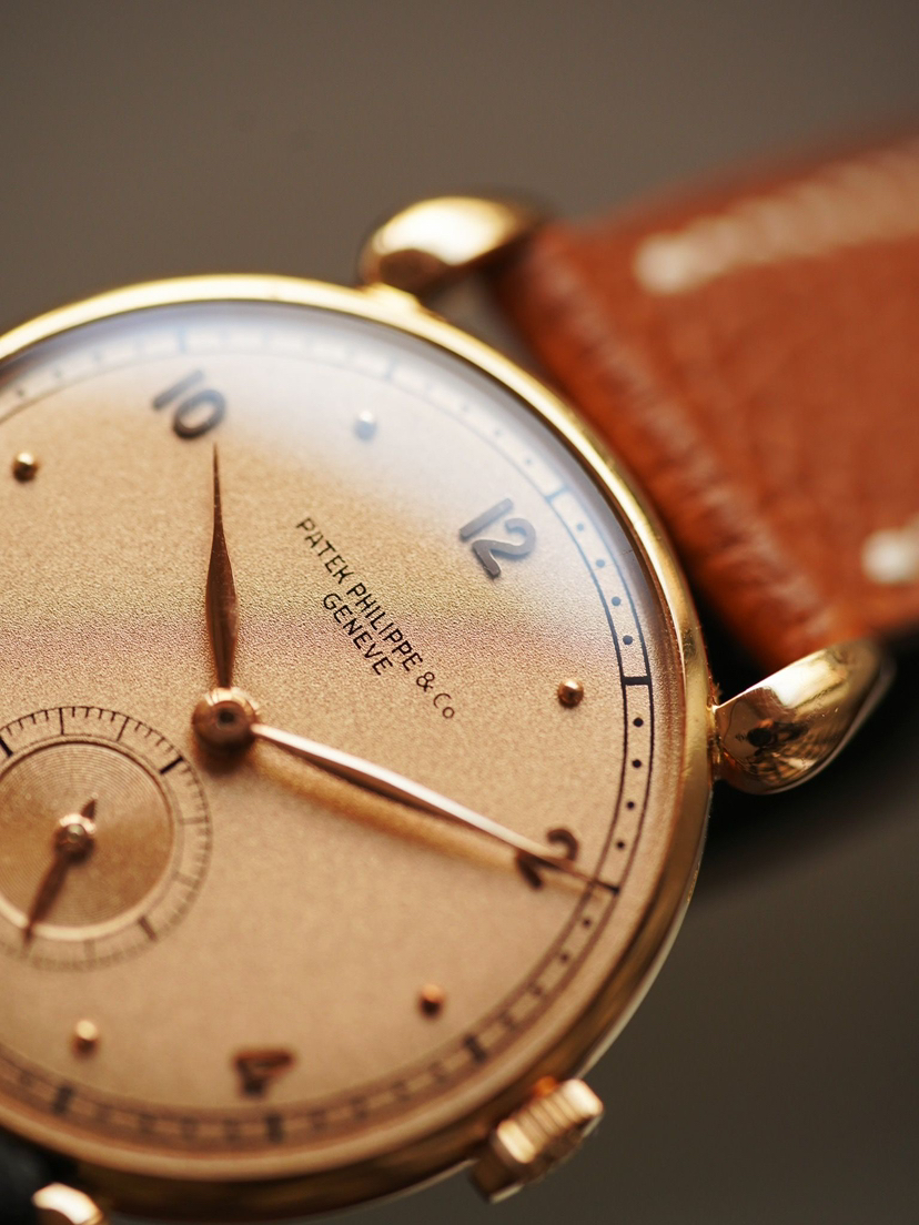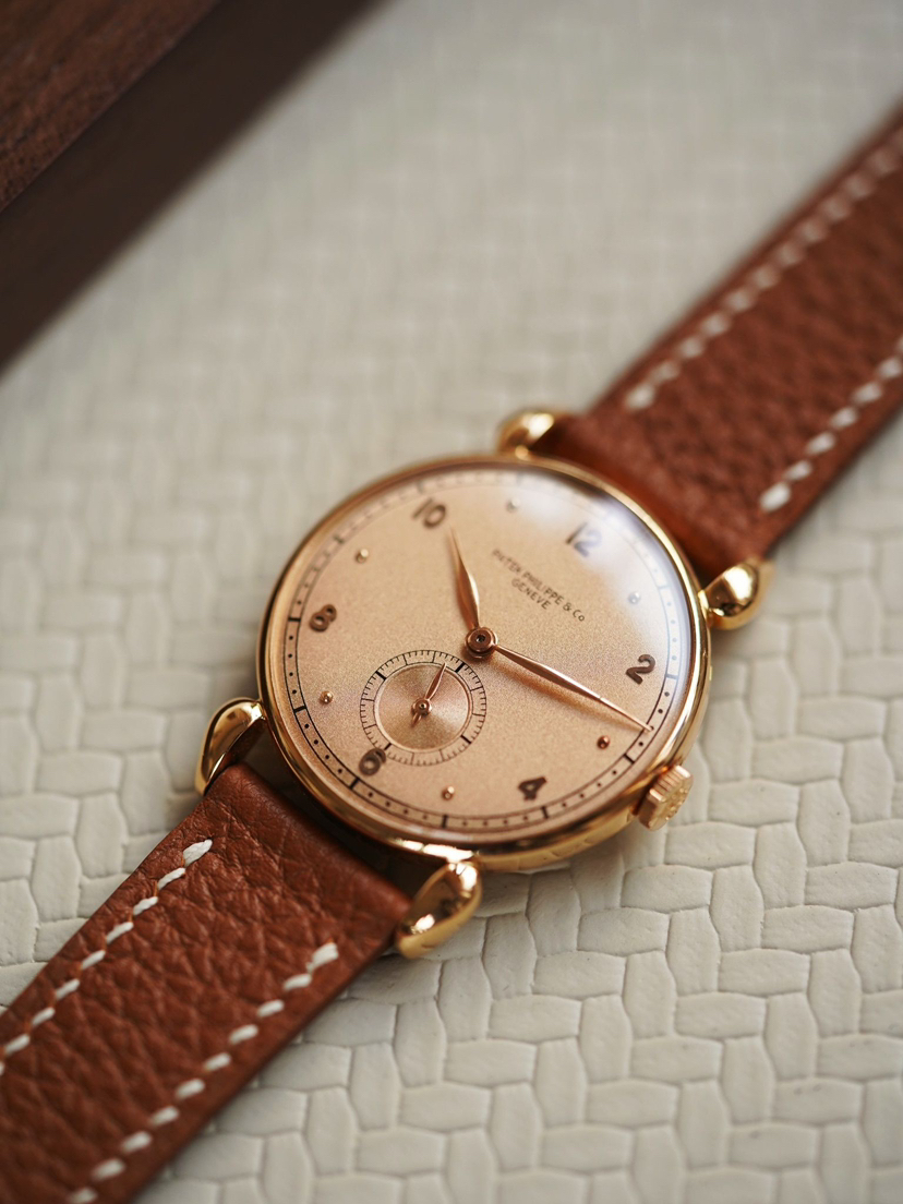 表盘:三文鱼色太阳纹设计,阿拉伯数字时标,蓝钢指针(1940 年代经典元素)
