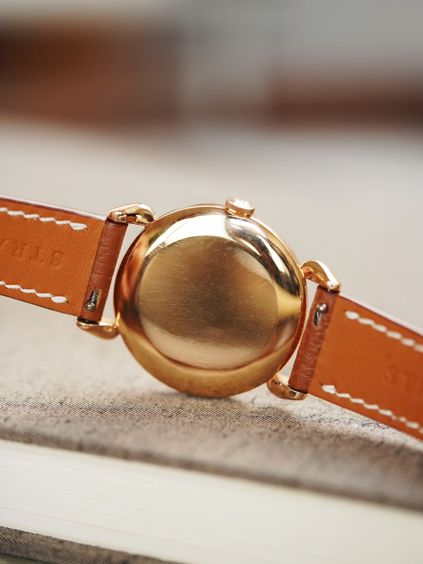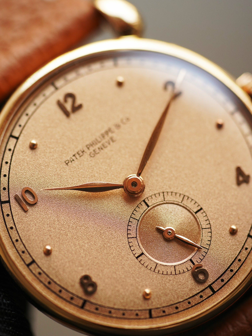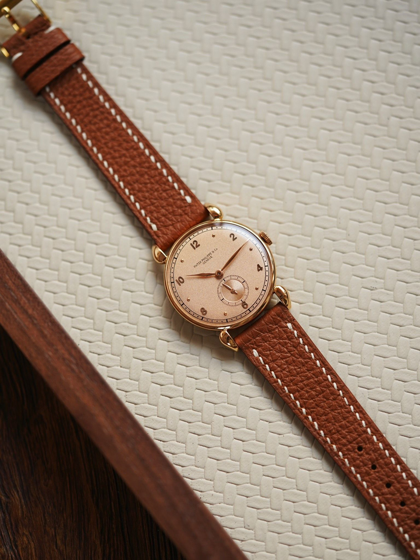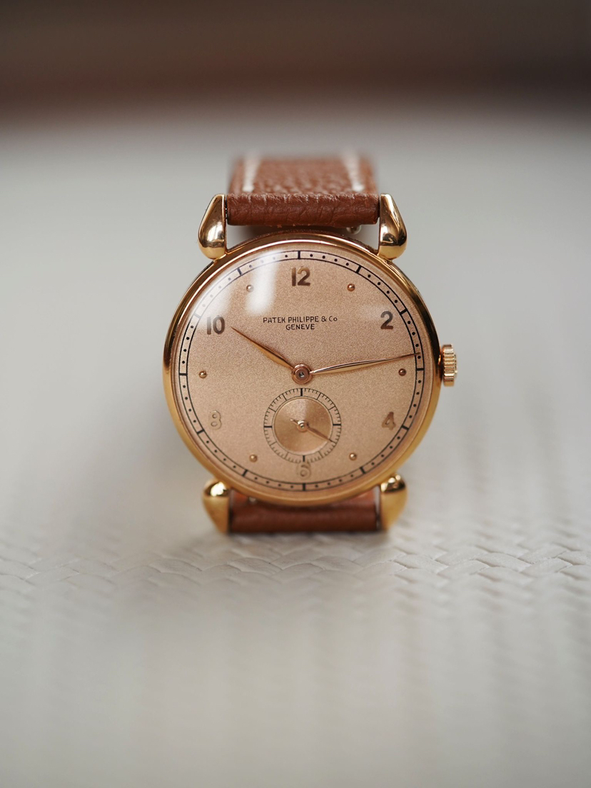 表盘:三文鱼色太阳纹设计,阿拉伯数字时标,蓝钢指针(1940 年代经典元素)