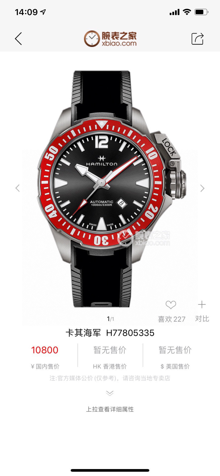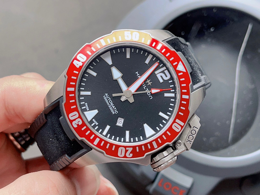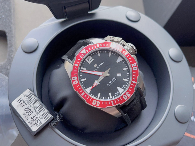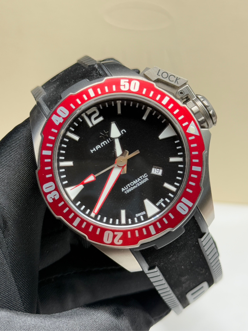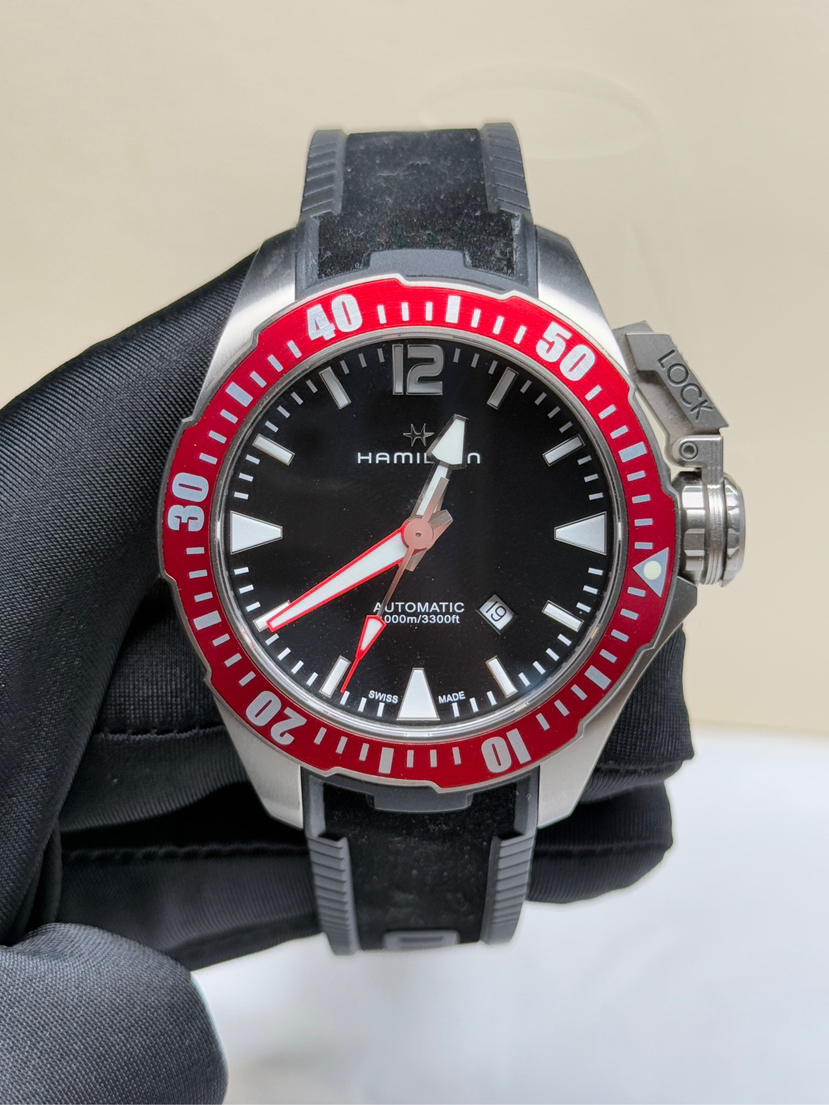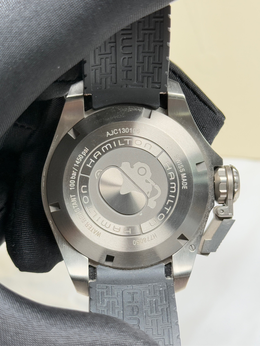 汉米尔顿卡其 海军系列H77805335,男士自动机械腕表,钛合金材质 红钛蛙,黑色字面红圈,橡胶带款,表径46毫米 2022年12月购入 整表98新成色 副件齐全如图 潜水罐盒子,锁把防水1000米,专业潜水表,公价10800 现好价出~