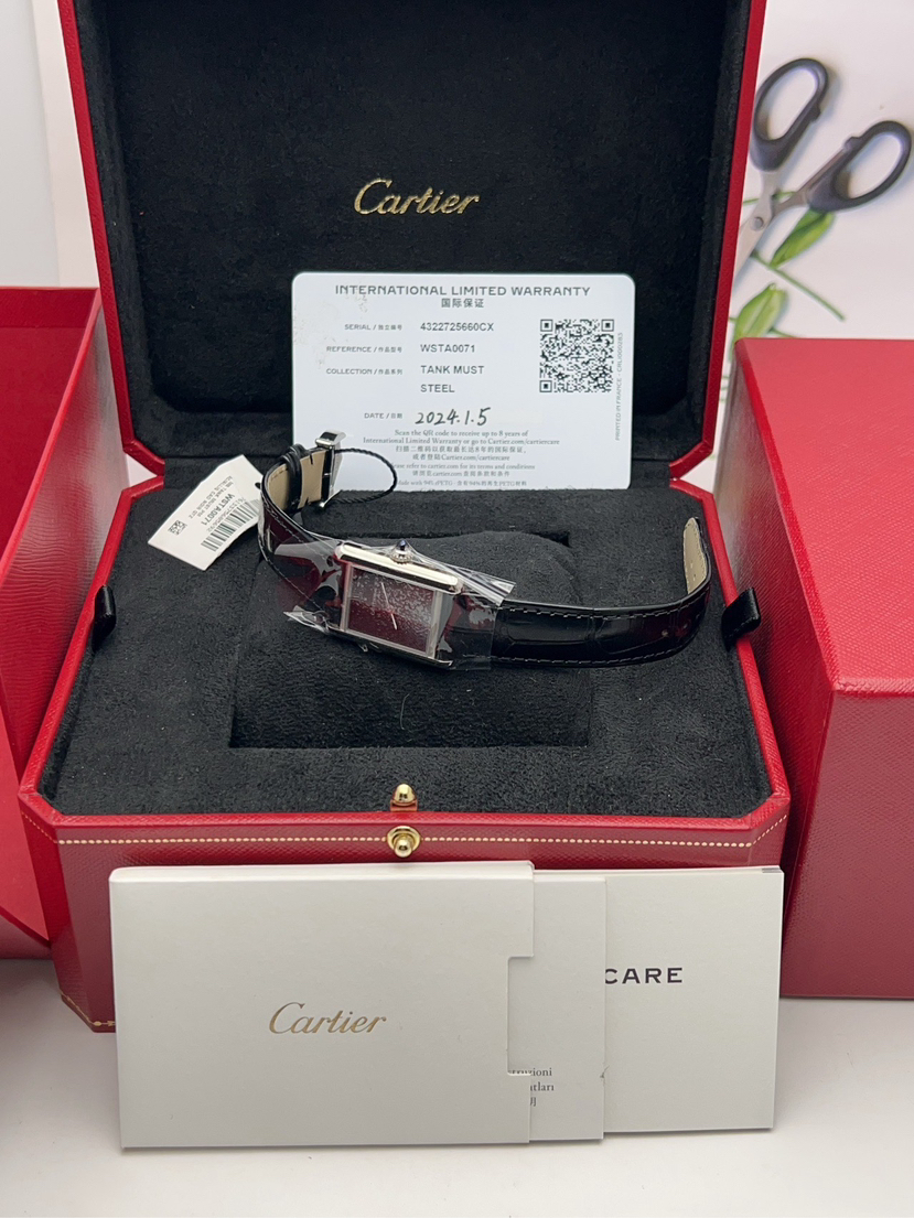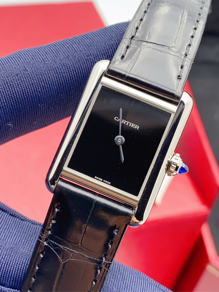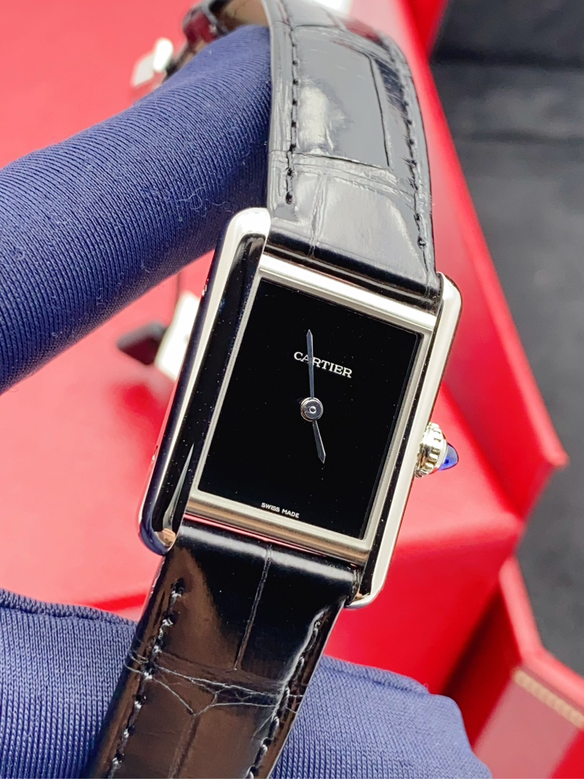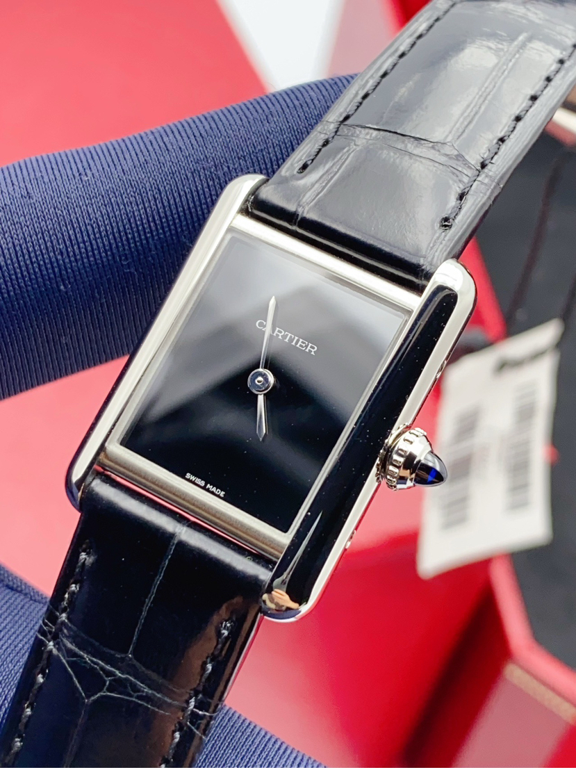 Tank Must腕表,2024年1月全新未使用/小号表款,石英机芯。精钢表壳,圆珠形表冠,镶嵌1颗凸圆型合成尖晶石,黑色漆艺表盘,剑形镀铑指针,亮面黑色鳄鱼皮表带,精钢针扣式表扣。表壳尺寸:29.5毫米x22毫米。厚度:6.6毫米。生活防水深度3巴(约30米)专柜价25300元 现货秒发