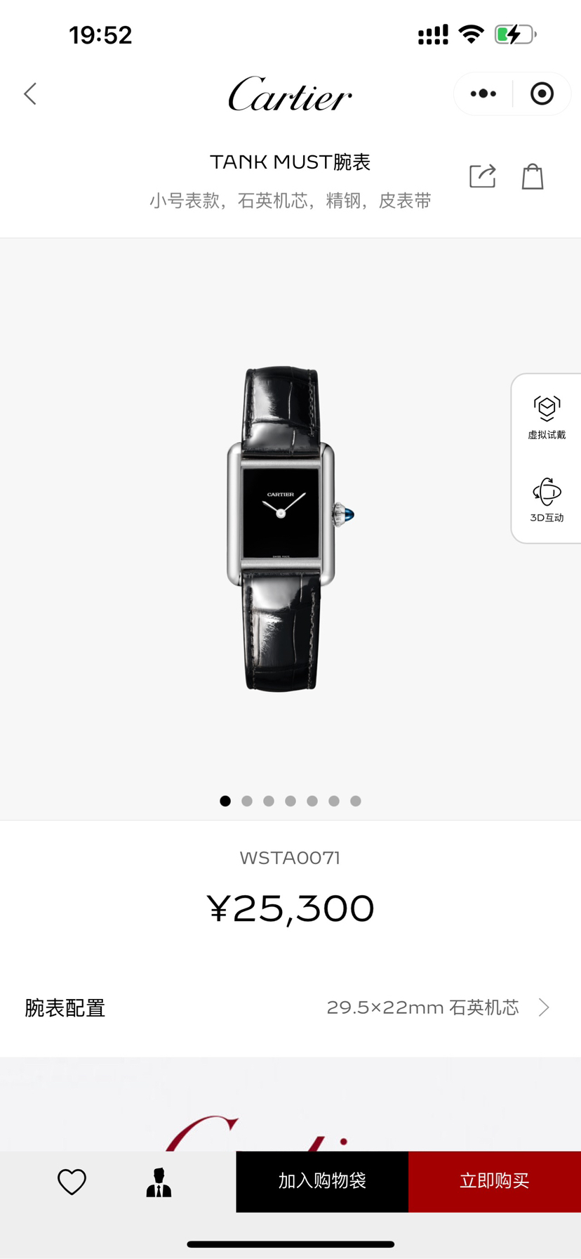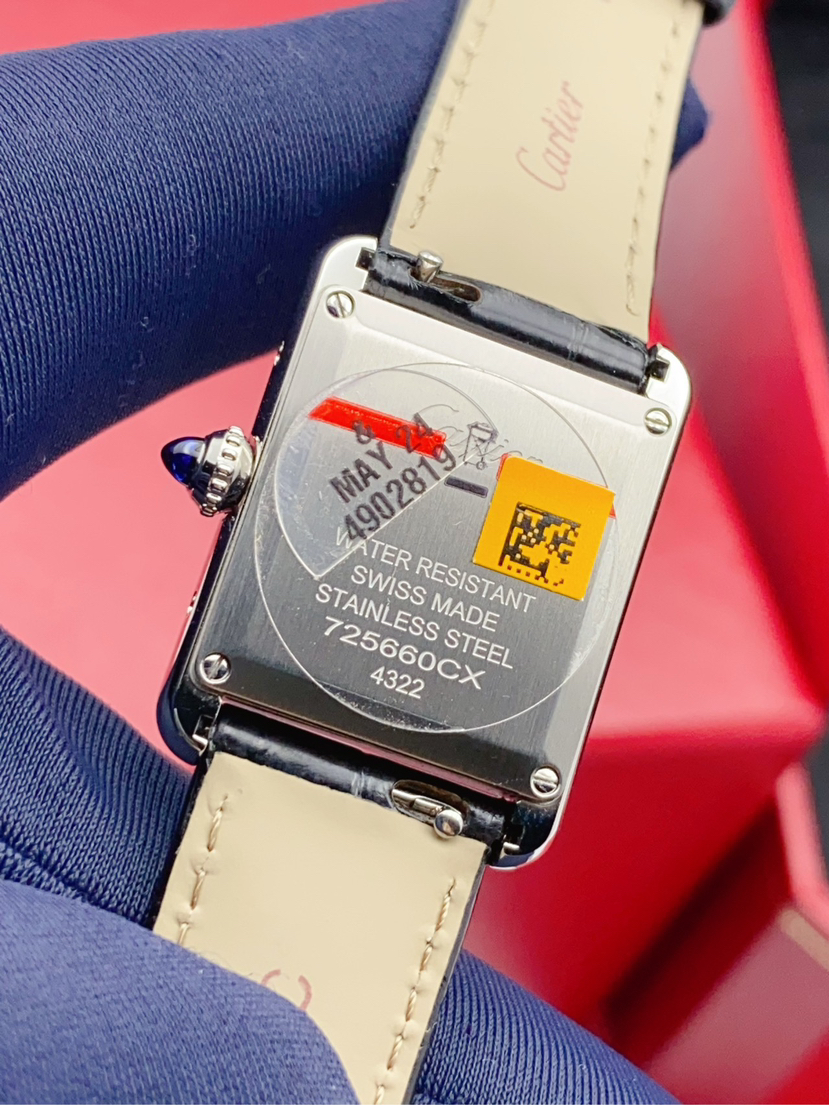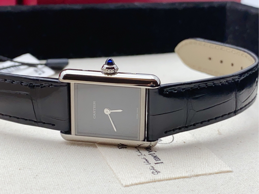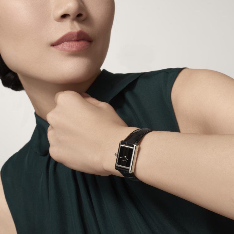 Tank Must腕表,2024年1月全新未使用/小号表款,石英机芯。精钢表壳,圆珠形表冠,镶嵌1颗凸圆型合成尖晶石,黑色漆艺表盘,剑形镀铑指针,亮面黑色鳄鱼皮表带,精钢针扣式表扣。表壳尺寸:29.5毫米x22毫米。厚度:6.6毫米。生活防水深度3巴(约30米)专柜价25300元 现货秒发