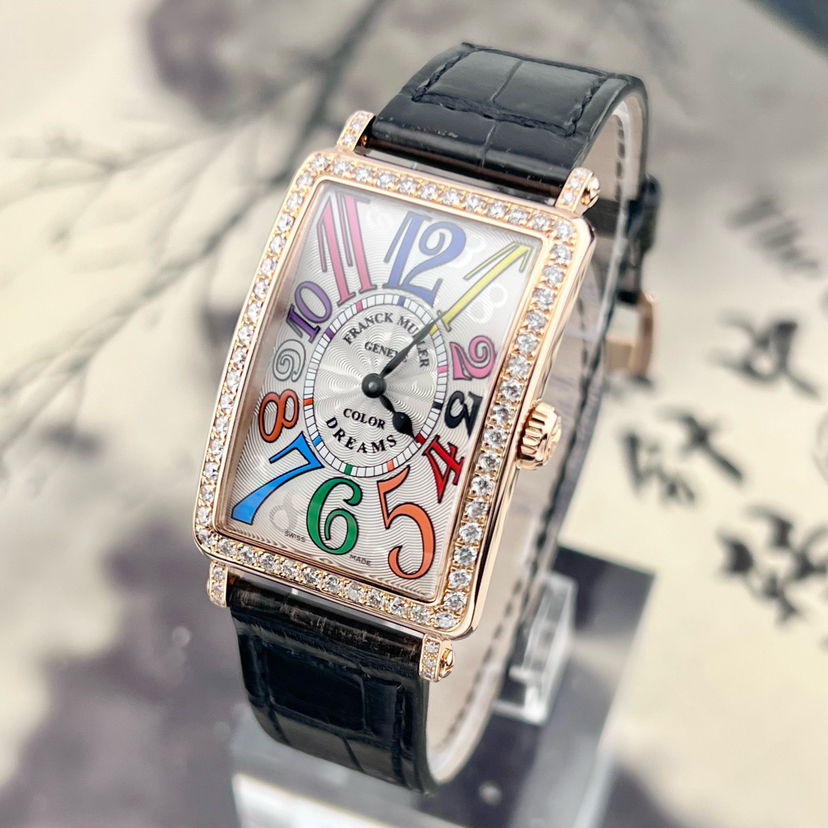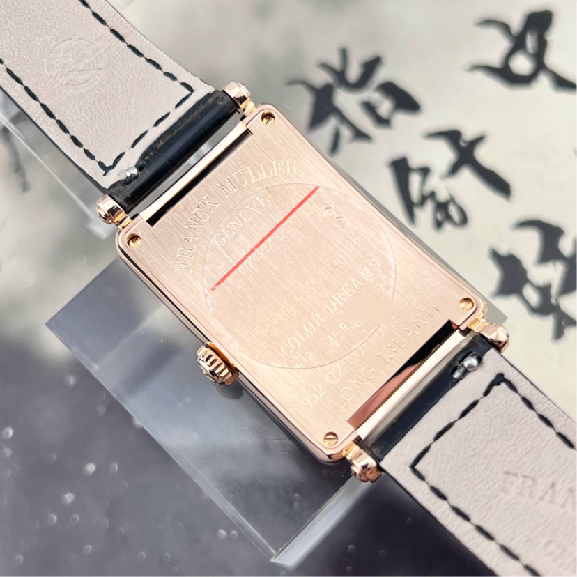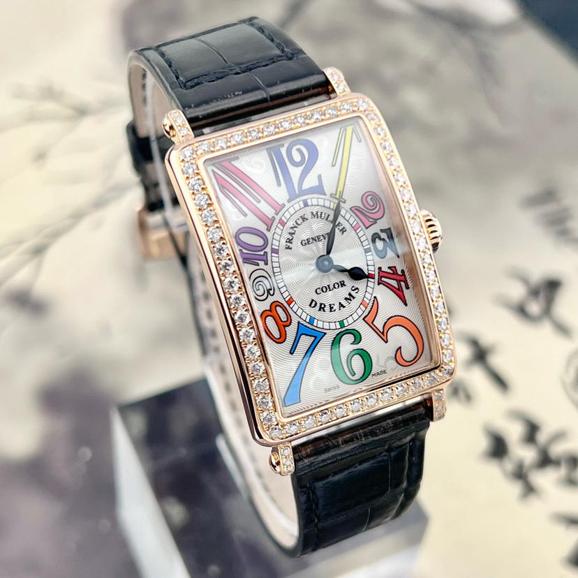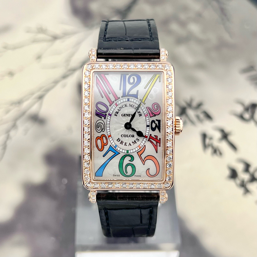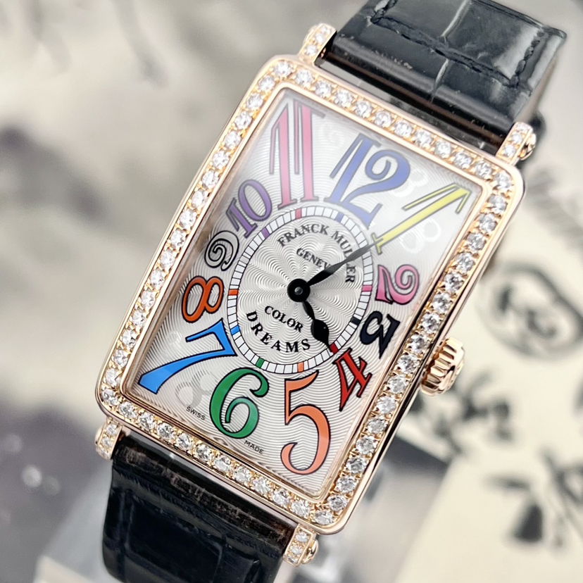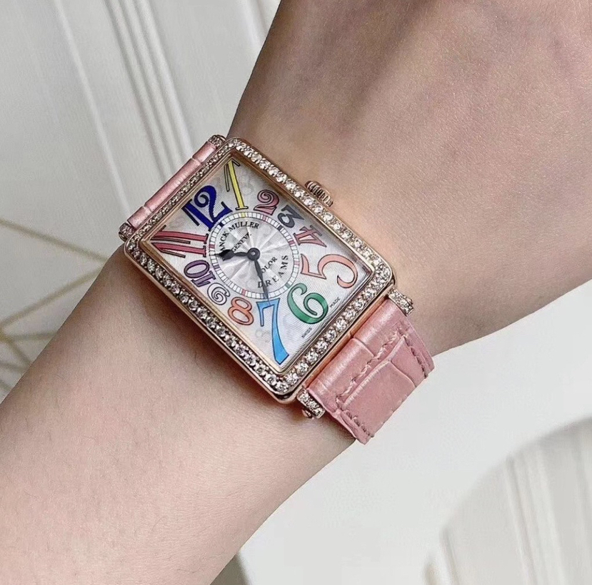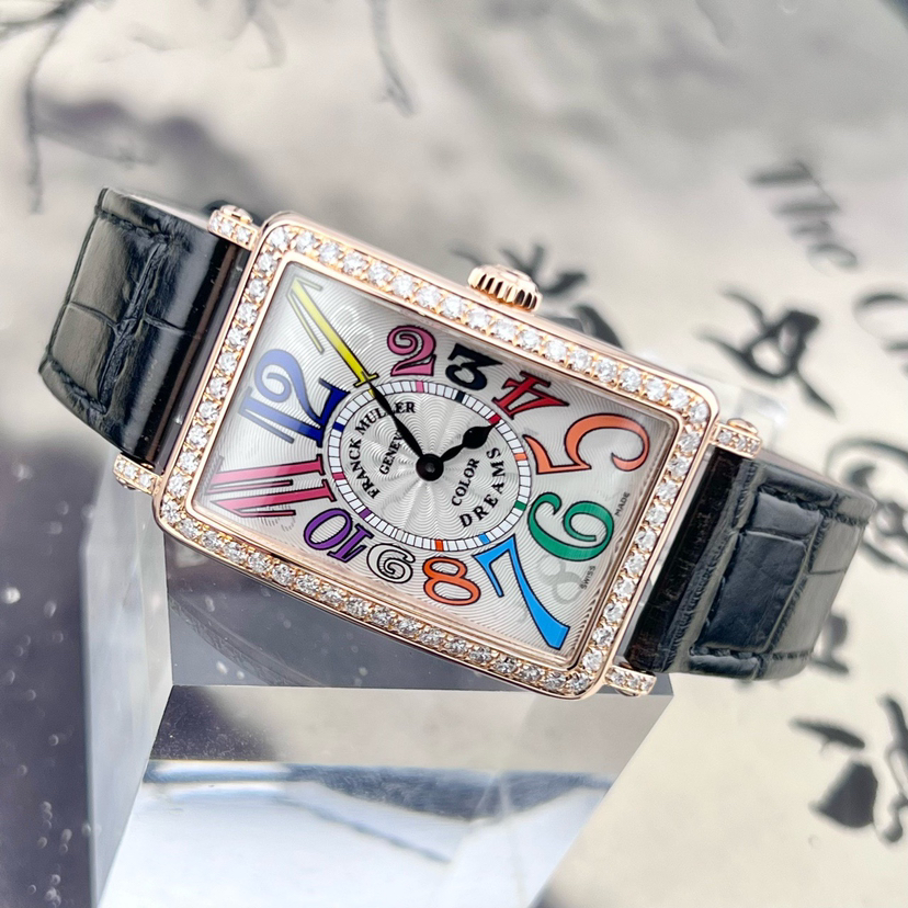 法穆兰LONG ISLAND系列952 QZ COL DRM D1R石英女士腕表,25*44mm表径,18k玫瑰金材质,彩虹色时标,原镶钻外圈,参考公价二十多万,现单表好价分享!~