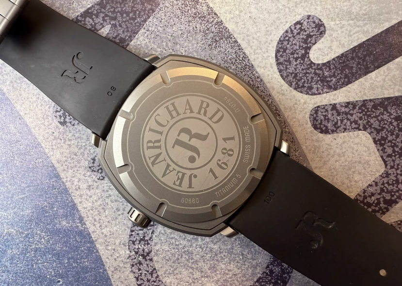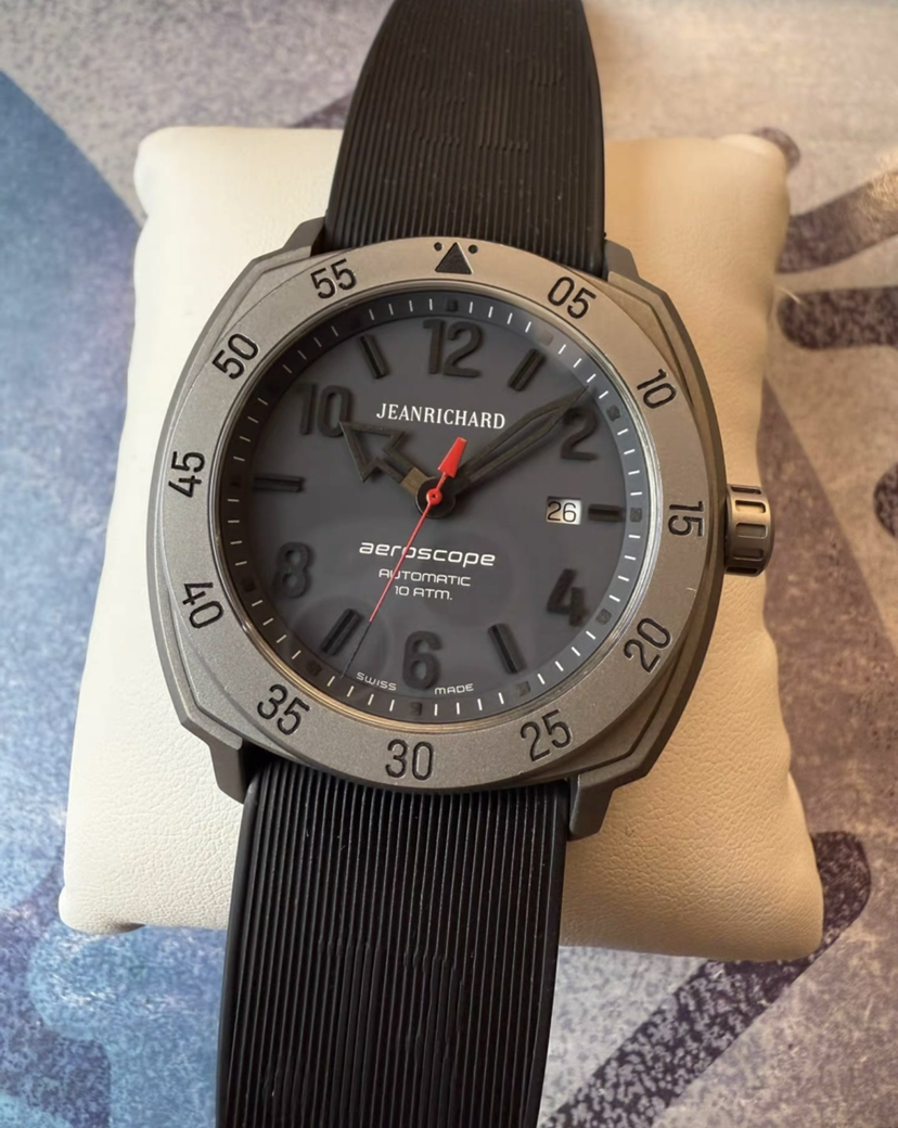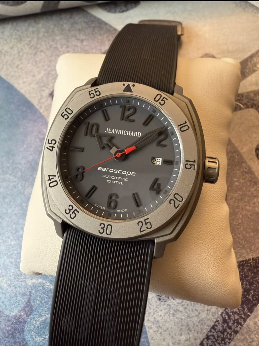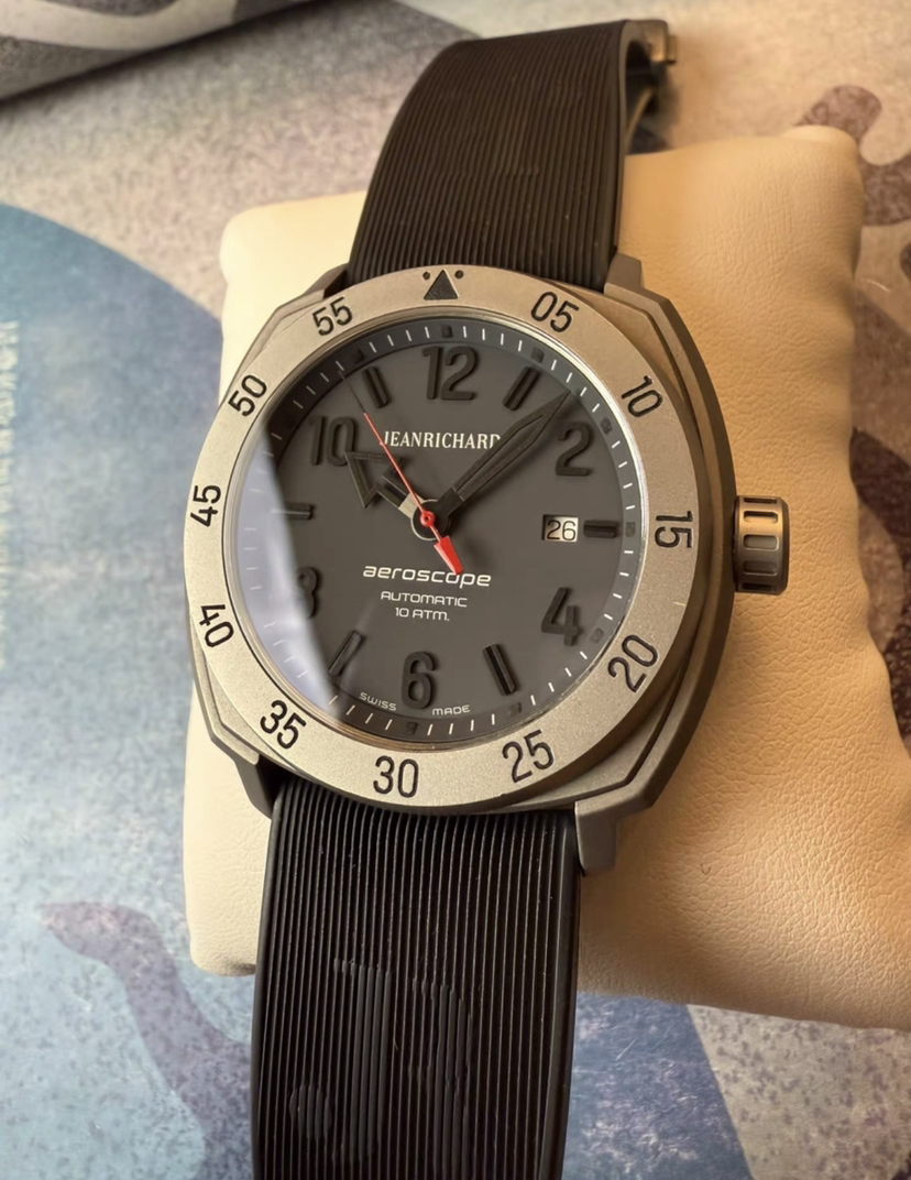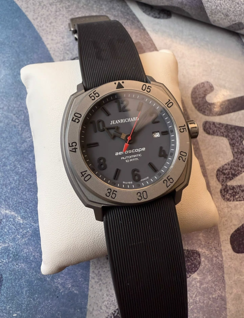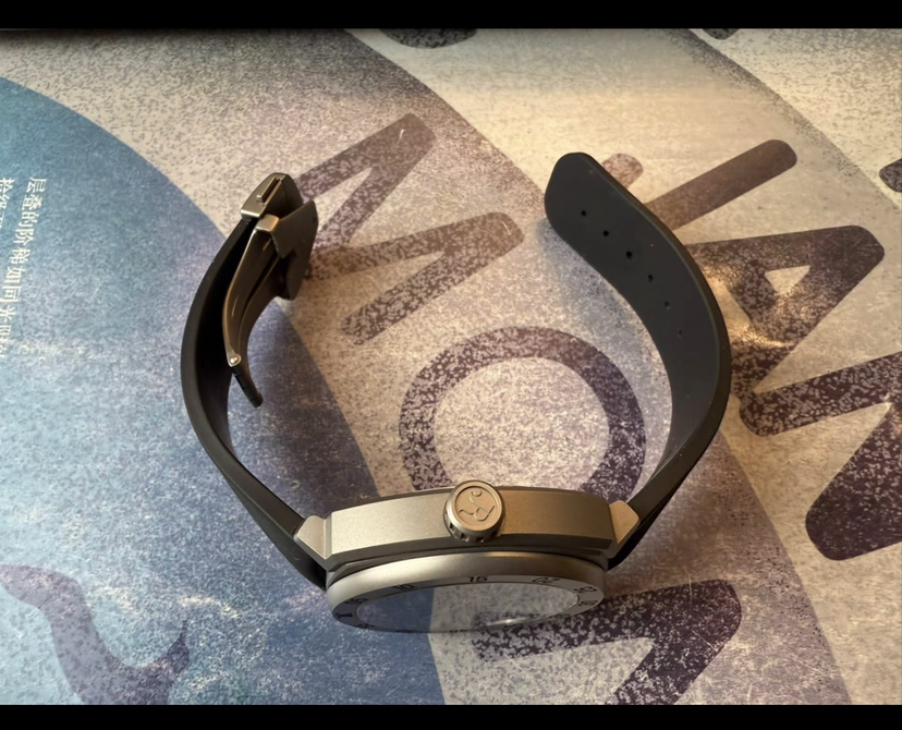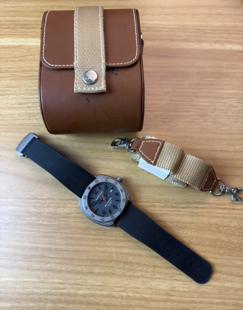 尚维沙钛金属机械腕表,表径46毫米,厚12毫米,钛金属材质,平面蓝宝石镜面,灰色盘面,阿拉伯数字和条形刻度,箭头型指针,红色秒针,3点日历,推拉式表冠,防水100米,搭载sw200机芯,走时天文台级别,钛金属折叠扣,黑色胶带,好成色,附件如图