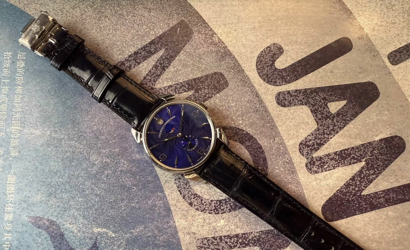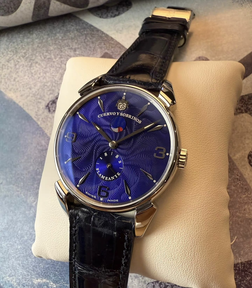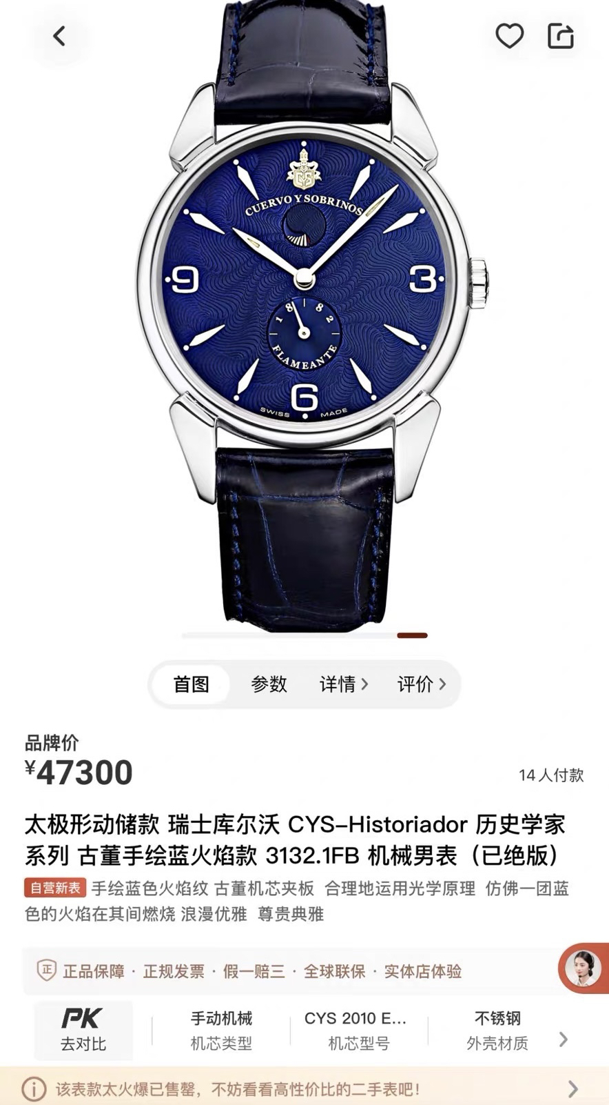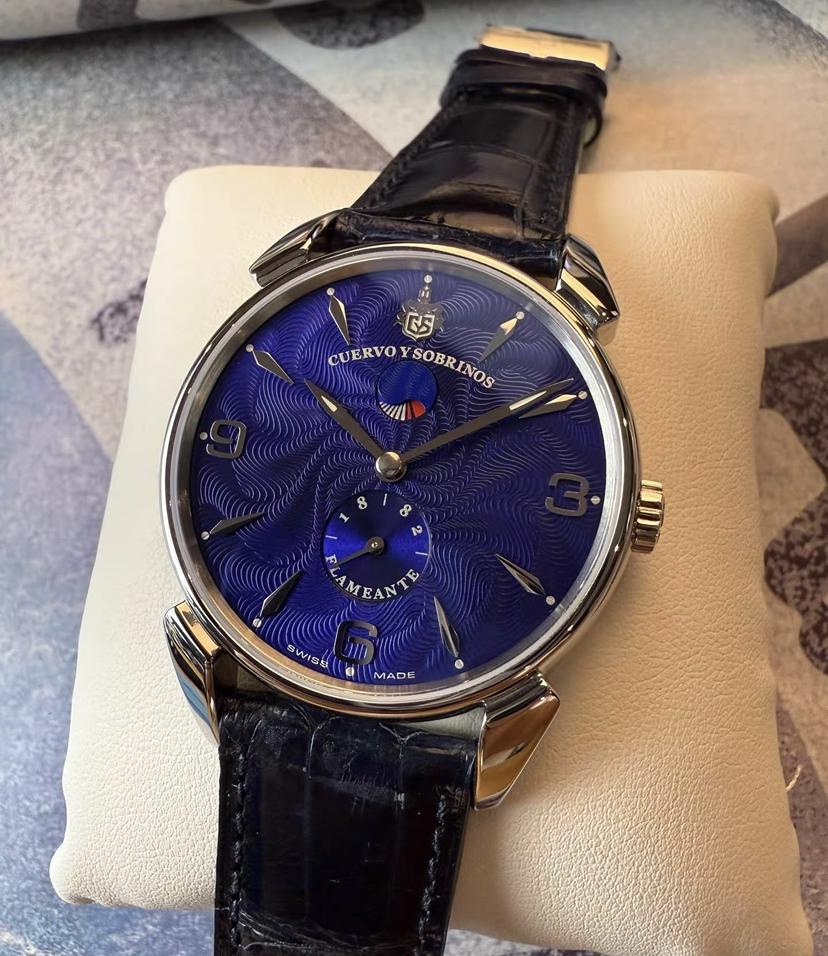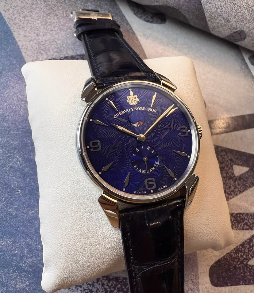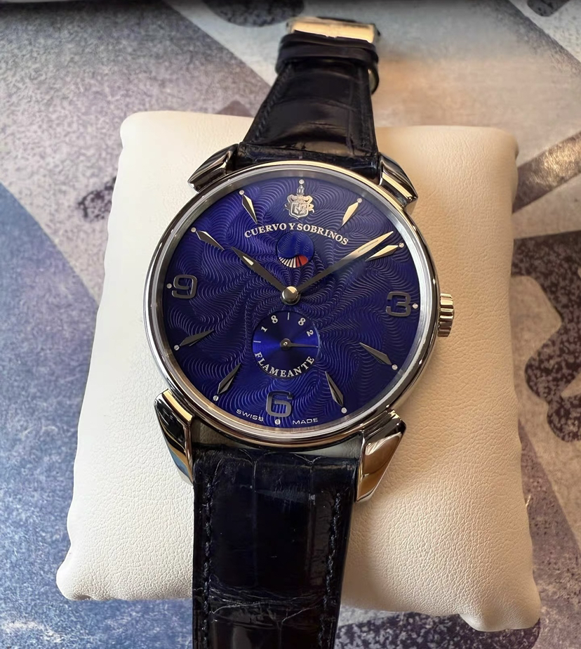 蓝色妖姬之古董手绘火焰纹款,表径40毫米,厚9毫米,表壳灵感来源于40年代甲壳虫设计,弧形双面防眩目蓝宝石镜面,魅力深蓝色盘面绘制立体古董火焰纹,阿拉伯数字和锥形刻度,柳叶形指针,6点位太阳纹秒针盘,12点位是太极形的动储显示窗,推拉式表冠,标志性牛角表耳,搭载精磨CYS2010/eta7001RM手动机芯,双按压蝴蝶扣,深邃蓝色鳄鱼皮表带,未使用单表