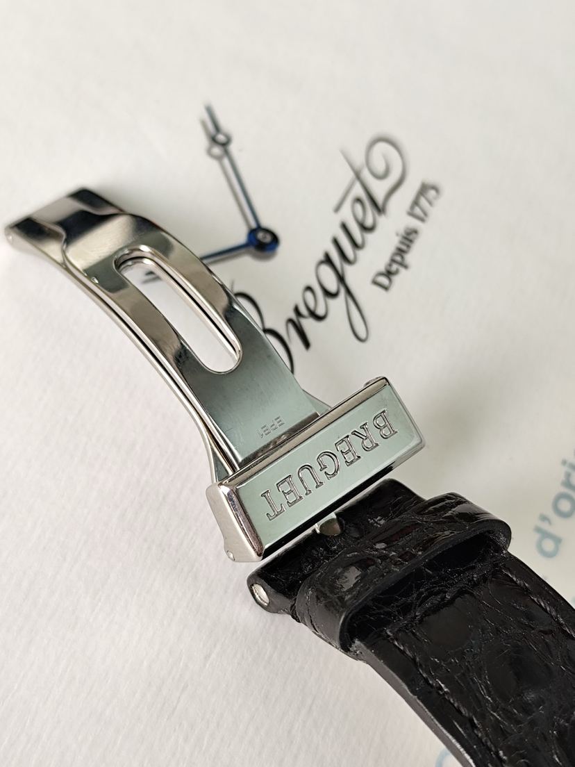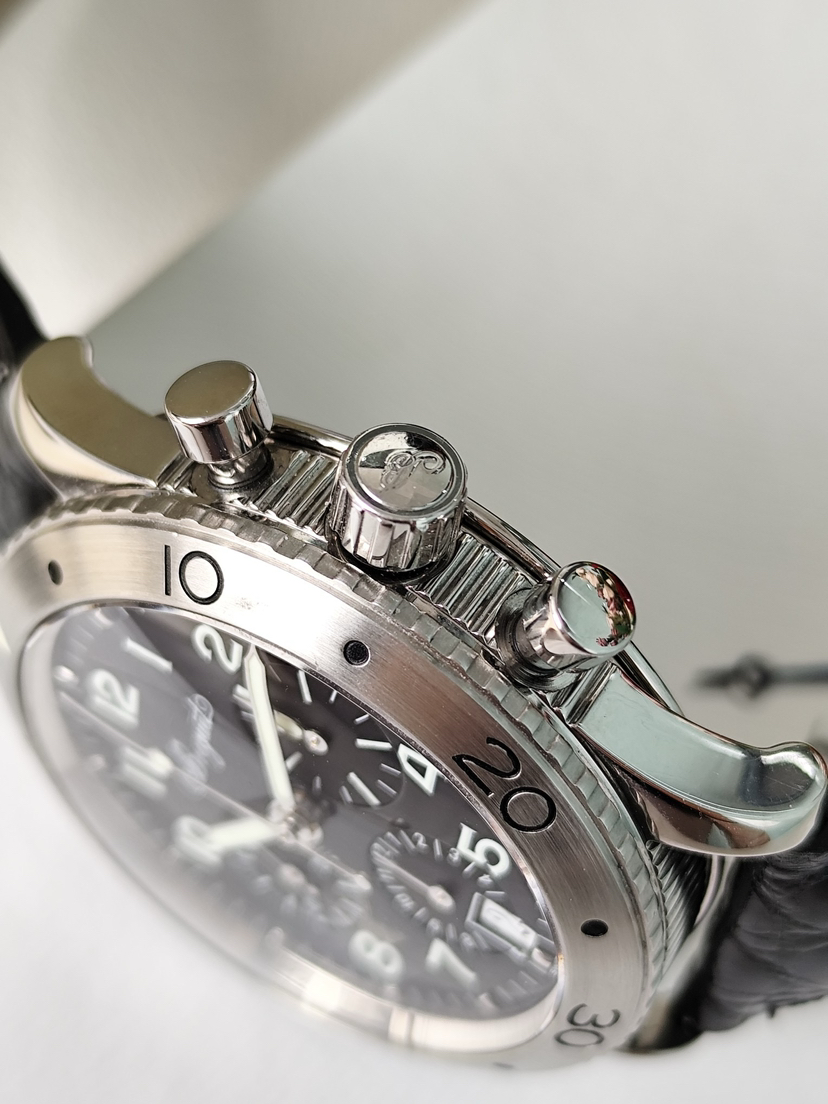 经典宝玑计时黑盘机械表,39mm黑色表盘,夜光刻度指针,三小盘计时码表功能,日历显示,旋转精钢表圈,精钢打造,搭载自产582Q自动上链机芯,折叠表扣!