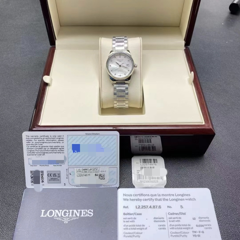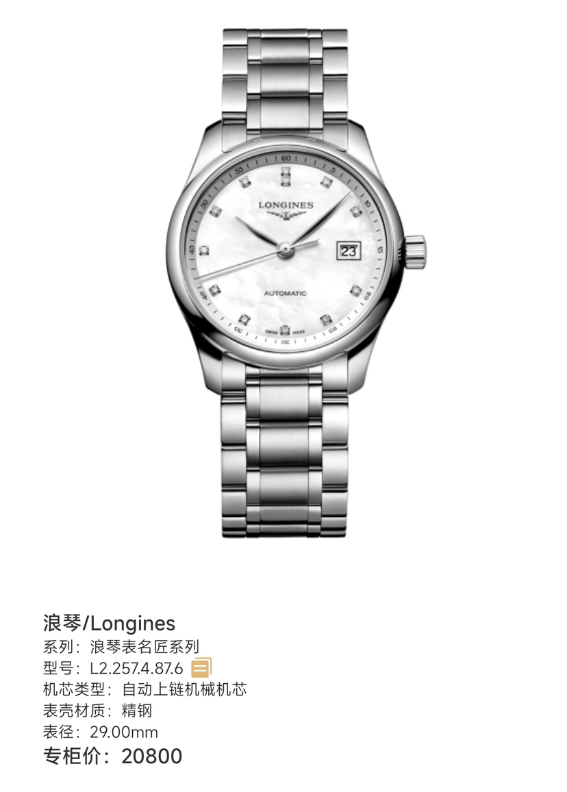 浪琴/Longines 浪琴表名匠系列 L2.257.4.87.6 自动上链机械机芯 精钢 29.00mm 专柜价20800 女款名匠贝母钻刻 未用品25年全新全套 好折扣~