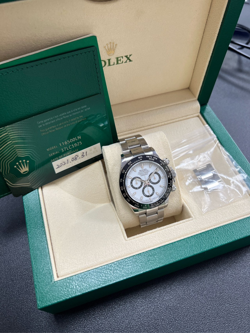 劳力士迪通拿116500熊猫迪,40mm表径、附件如图、2021年08月购入、整表成色98新,完美品相。黑白配色、劳力士熊猫迪,可遇不可求
