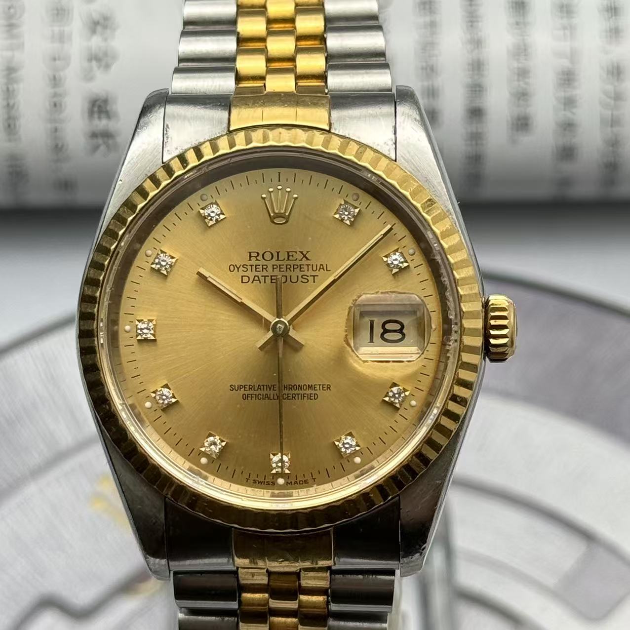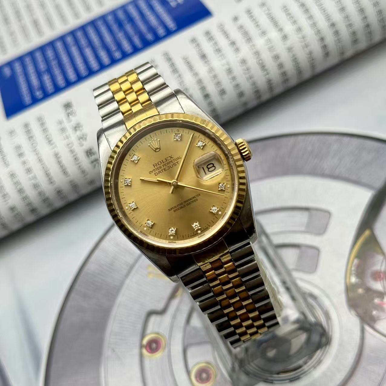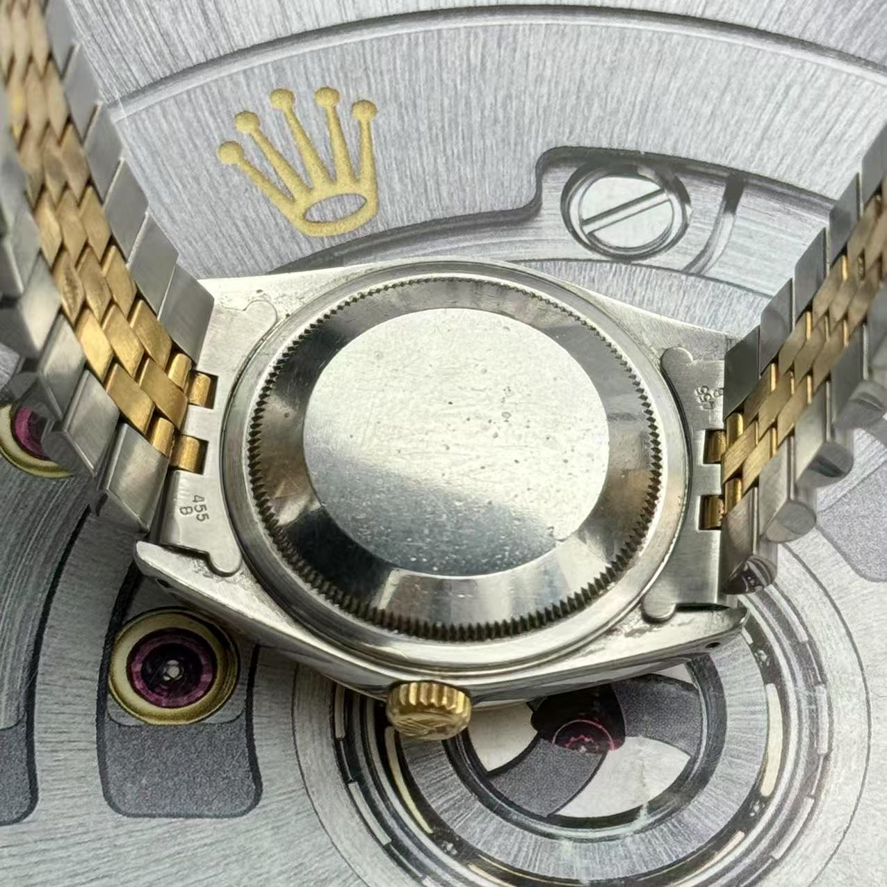品牌:劳力士 系列:日志型系列 型号:16233。材质:18k黄金+精钢 镜面:蓝宝石玻璃 表盖:密底 表扣:折叠扣 表径:36mm 机芯类型:自动机械机芯 成色:95新 附件:单表。公价:104000 现在好价出 包回收