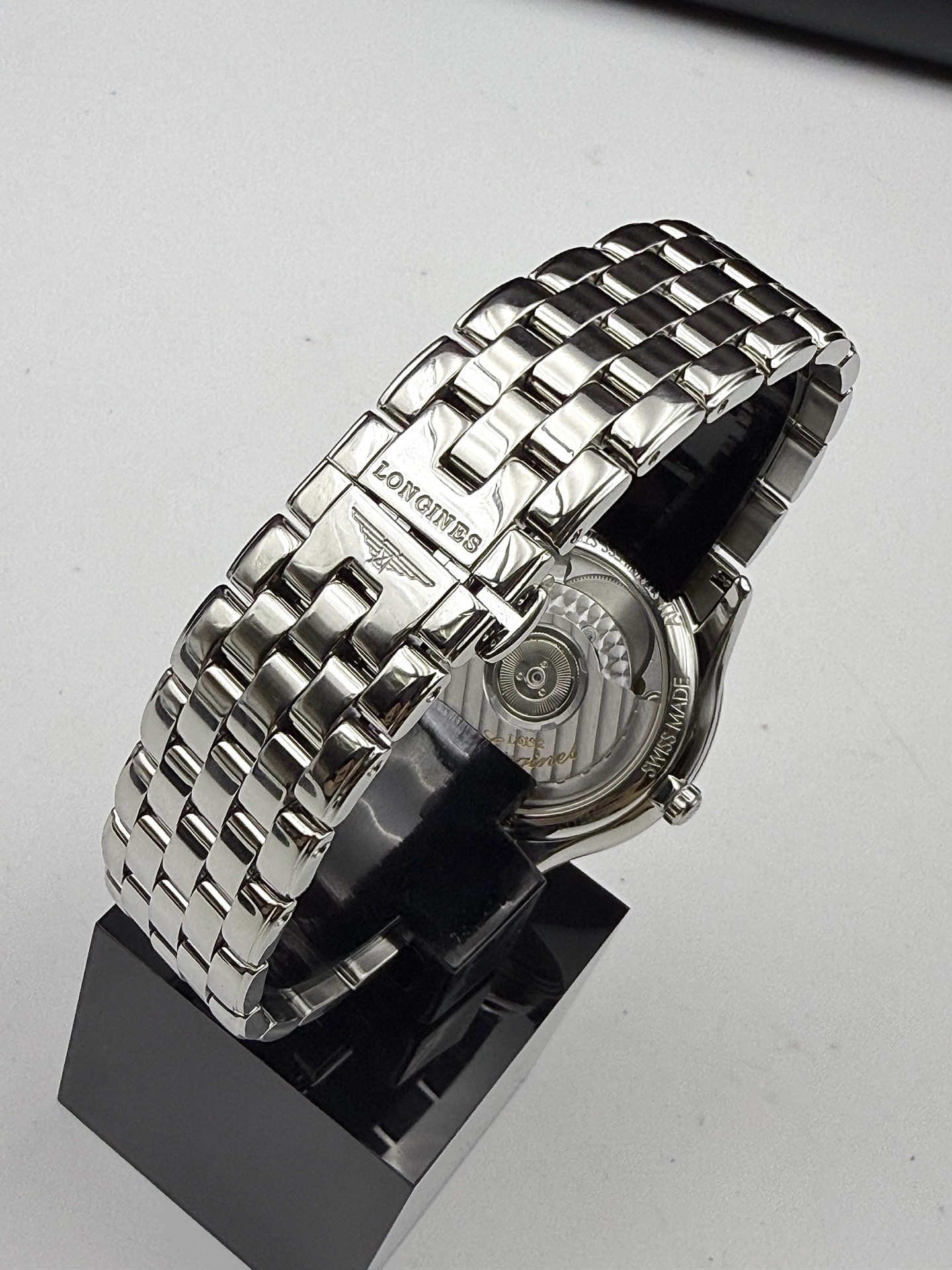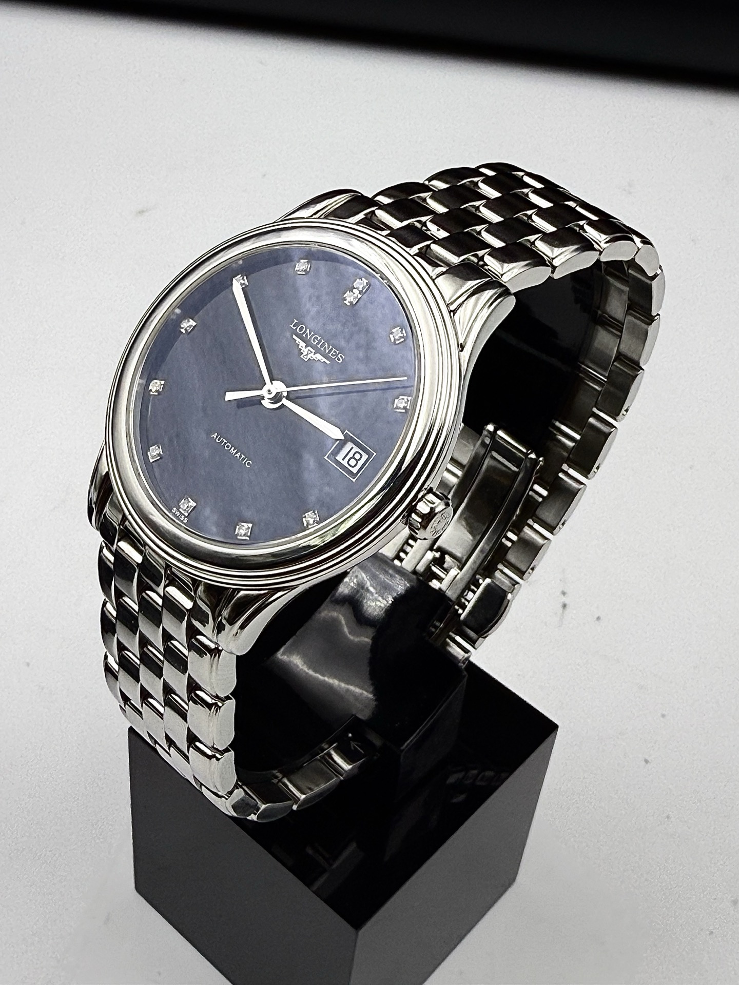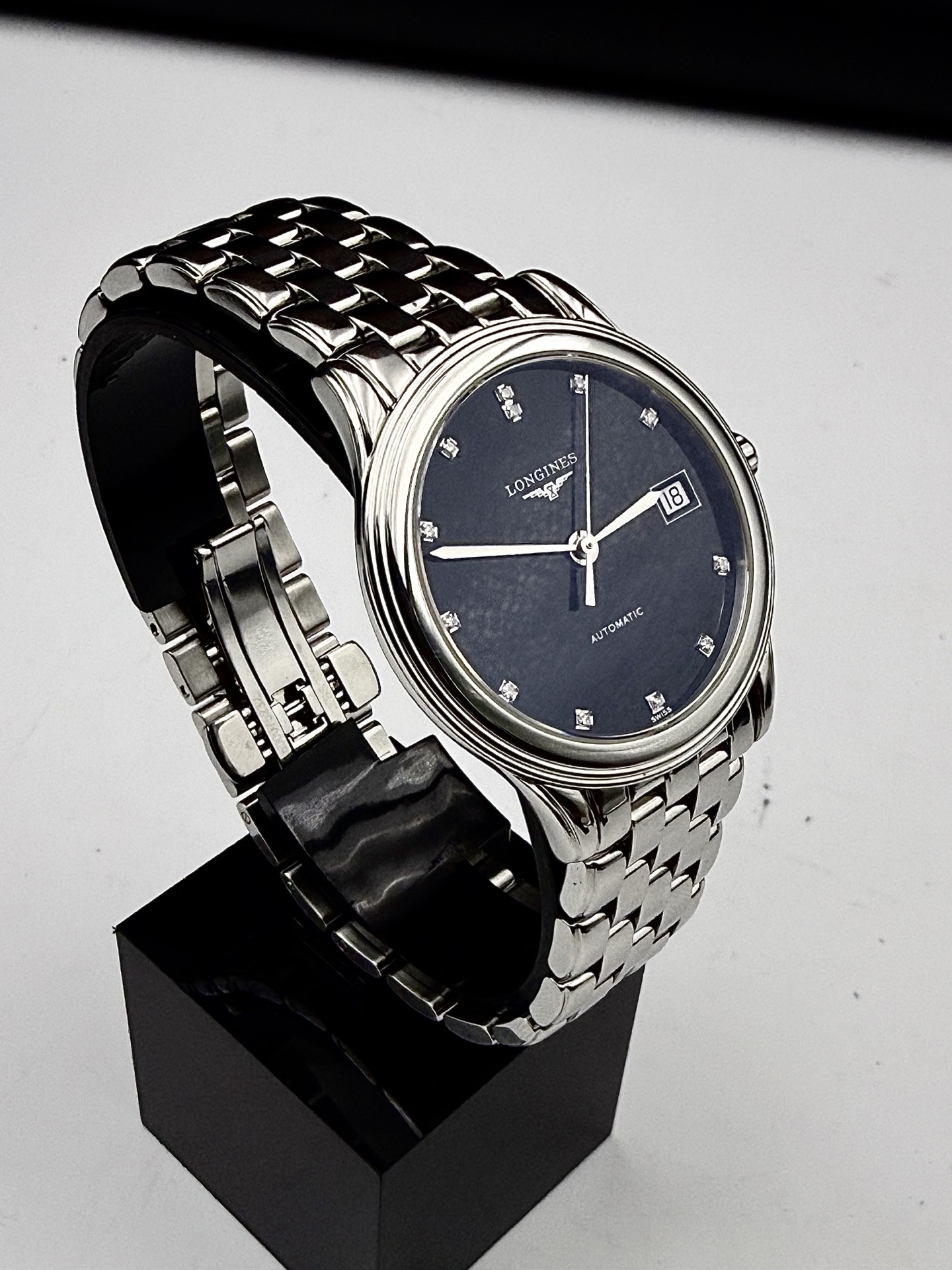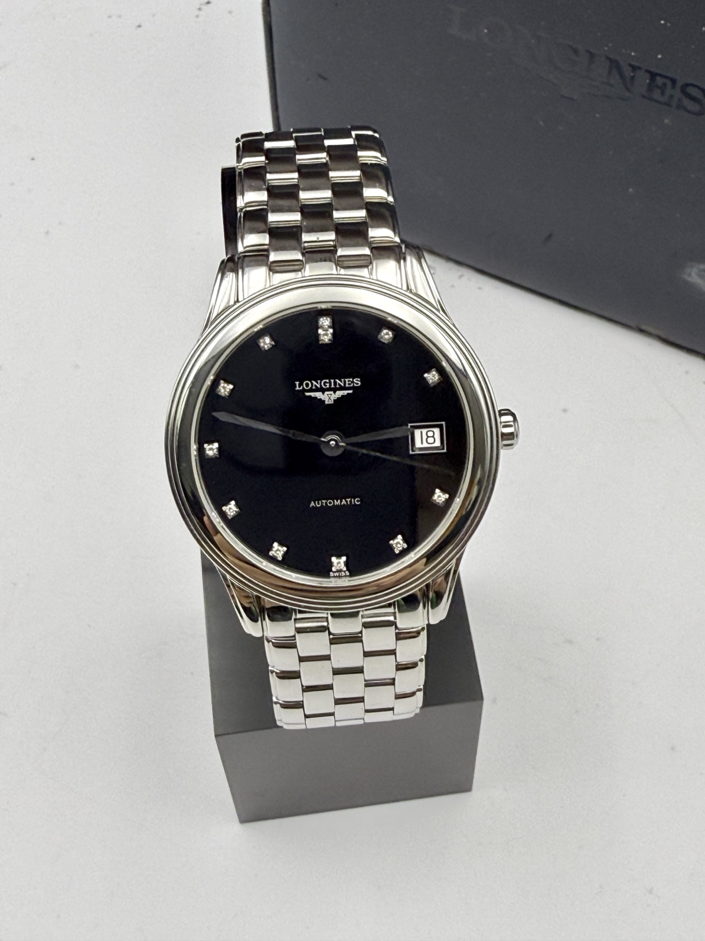 浪琴经典系列L4.774.4.57.6自动机械男士腕表,精钢材质,35.6mm表径,黑盘钻刻,日期显示,公价15100,现好价
