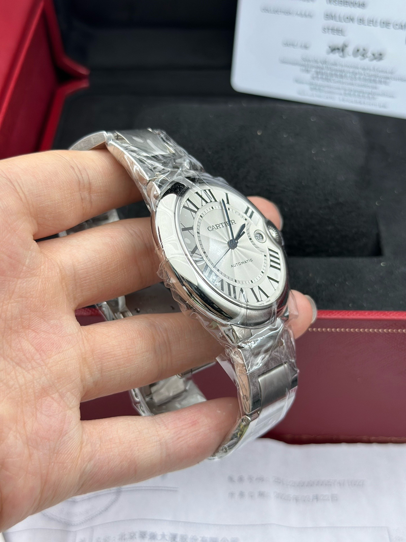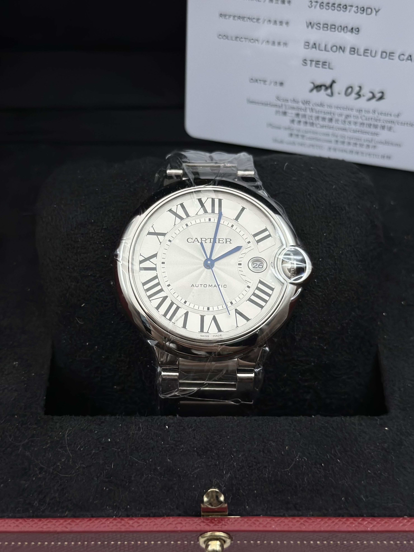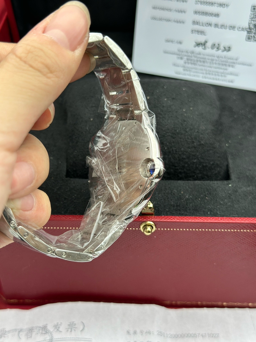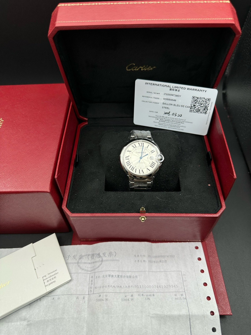 卡地亚 蓝气球系列型号WSBB0049,自动机械腕表、表径:42mm表壳厚度:13mm,材质:精钢/钢带、镀银珠光扭索雕纹表盘、罗马数字刻度、剑型蓝钢指针、新款快拆表链,2025年3月大全套带票全新未使用品!专柜公价58500!现货特价!