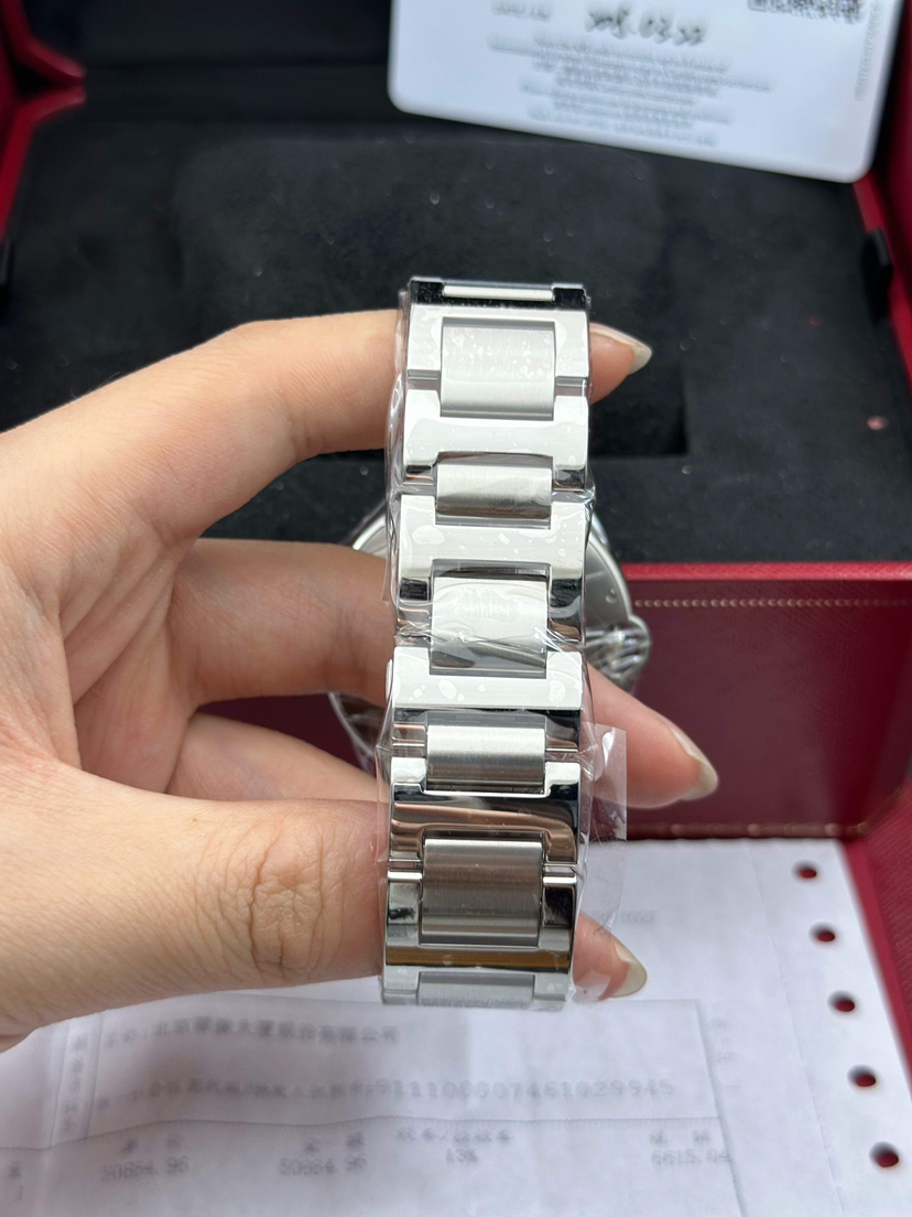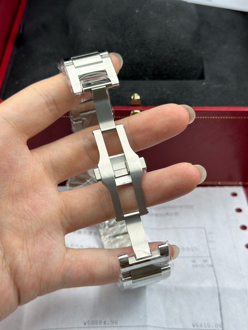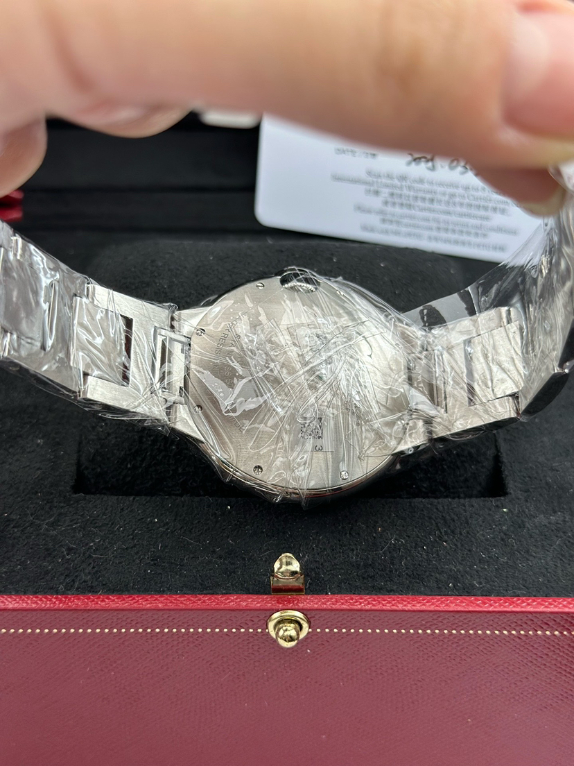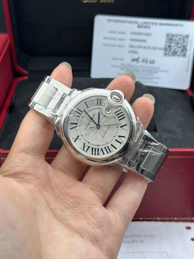 卡地亚 蓝气球系列型号WSBB0049,自动机械腕表、表径:42mm表壳厚度:13mm,材质:精钢/钢带、镀银珠光扭索雕纹表盘、罗马数字刻度、剑型蓝钢指针、新款快拆表链,2025年3月大全套带票全新未使用品!专柜公价58500!现货特价!