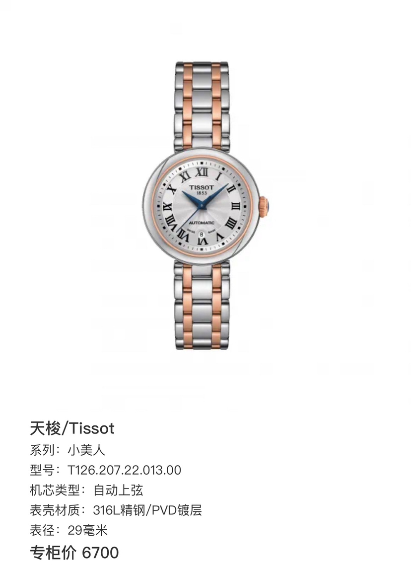天梭/Tissot 小美人 T126.207.22.013.00 自动上弦 316L精钢/PVD镀层 29毫米 专柜价6700~ 23年12月全套,现货好价!