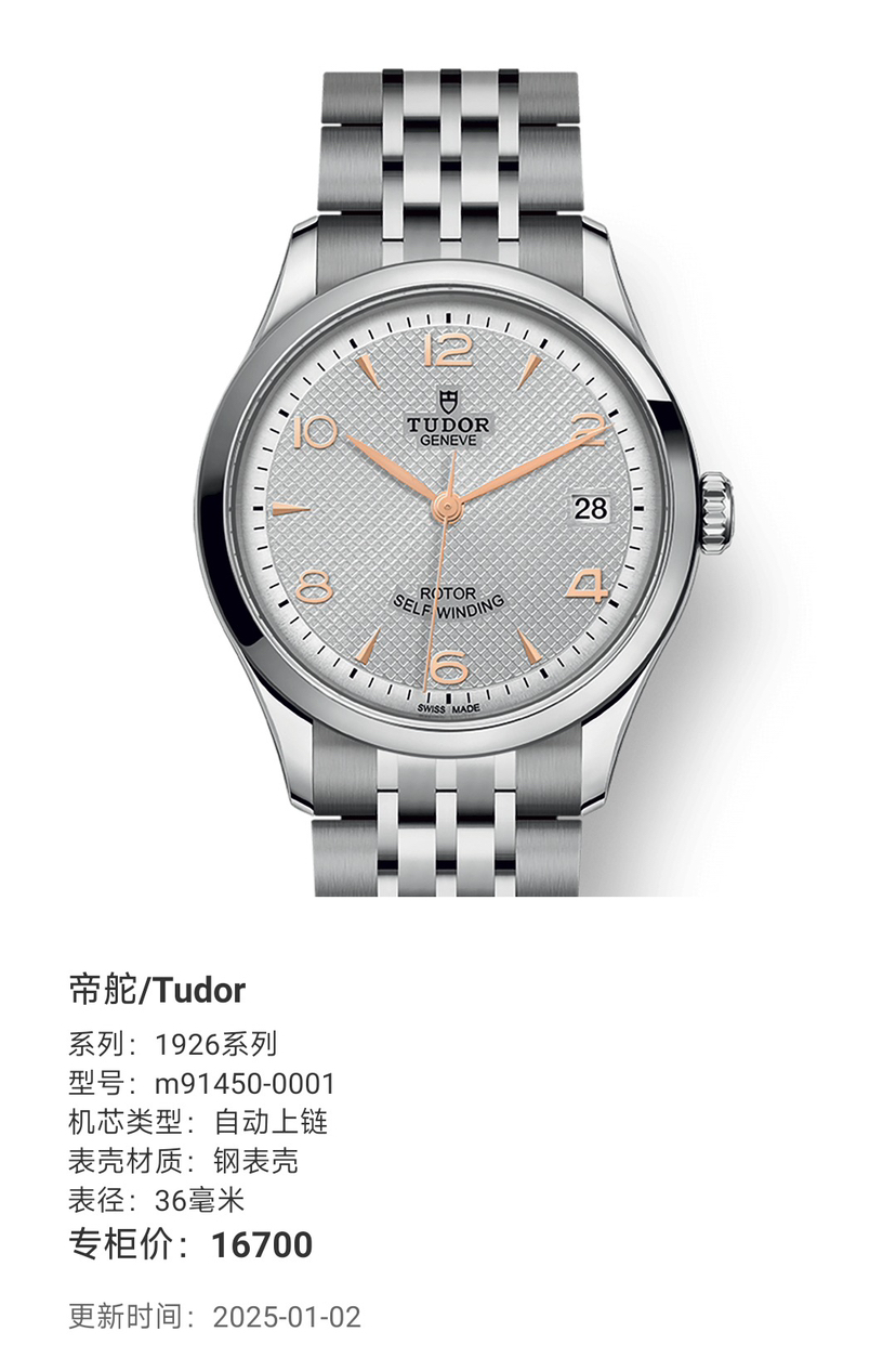 帝舵/Tudor 1926系列 m91450-0001 自动上链 钢表壳 36毫米 中性1926 专柜价16700 全新全套未使用品 现货好折扣~