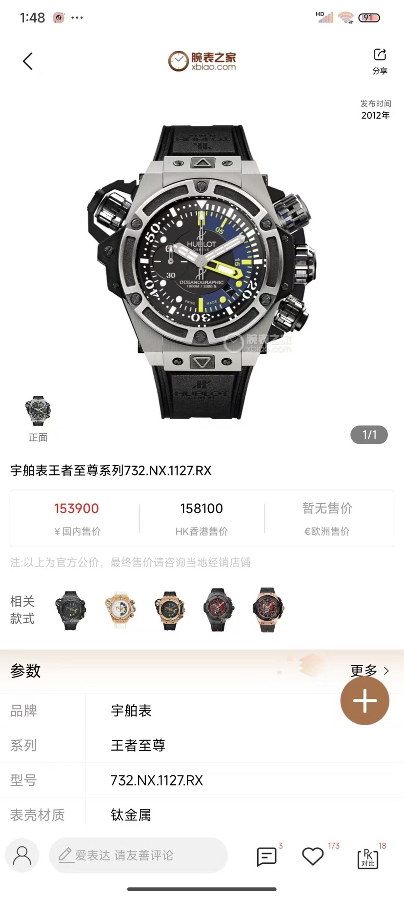 宇舶/Hublot 王者至尊 732.NX.1127.RX 自动机械 钛金属 48毫米 专柜价153900~17年大全套,现货好价!