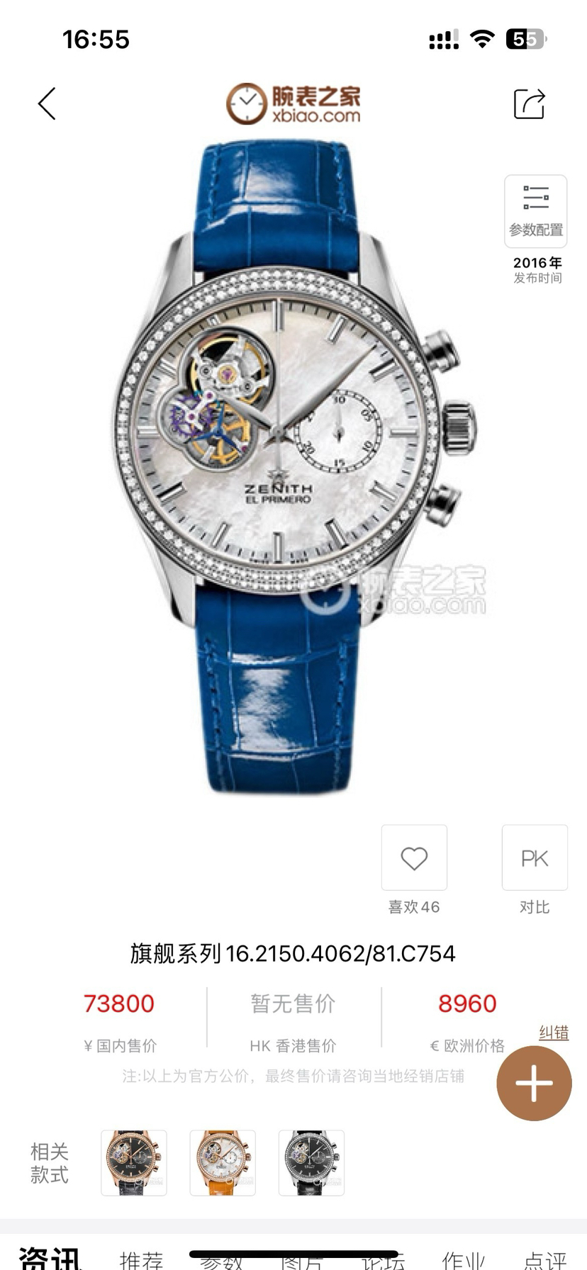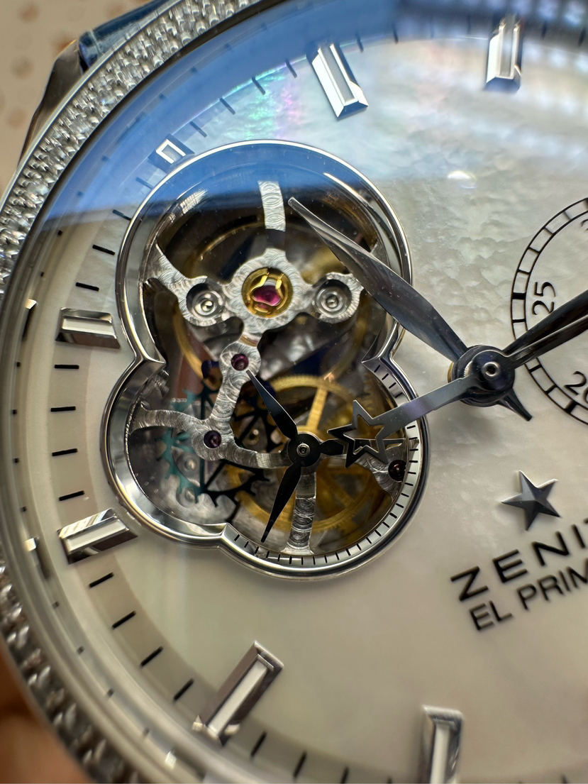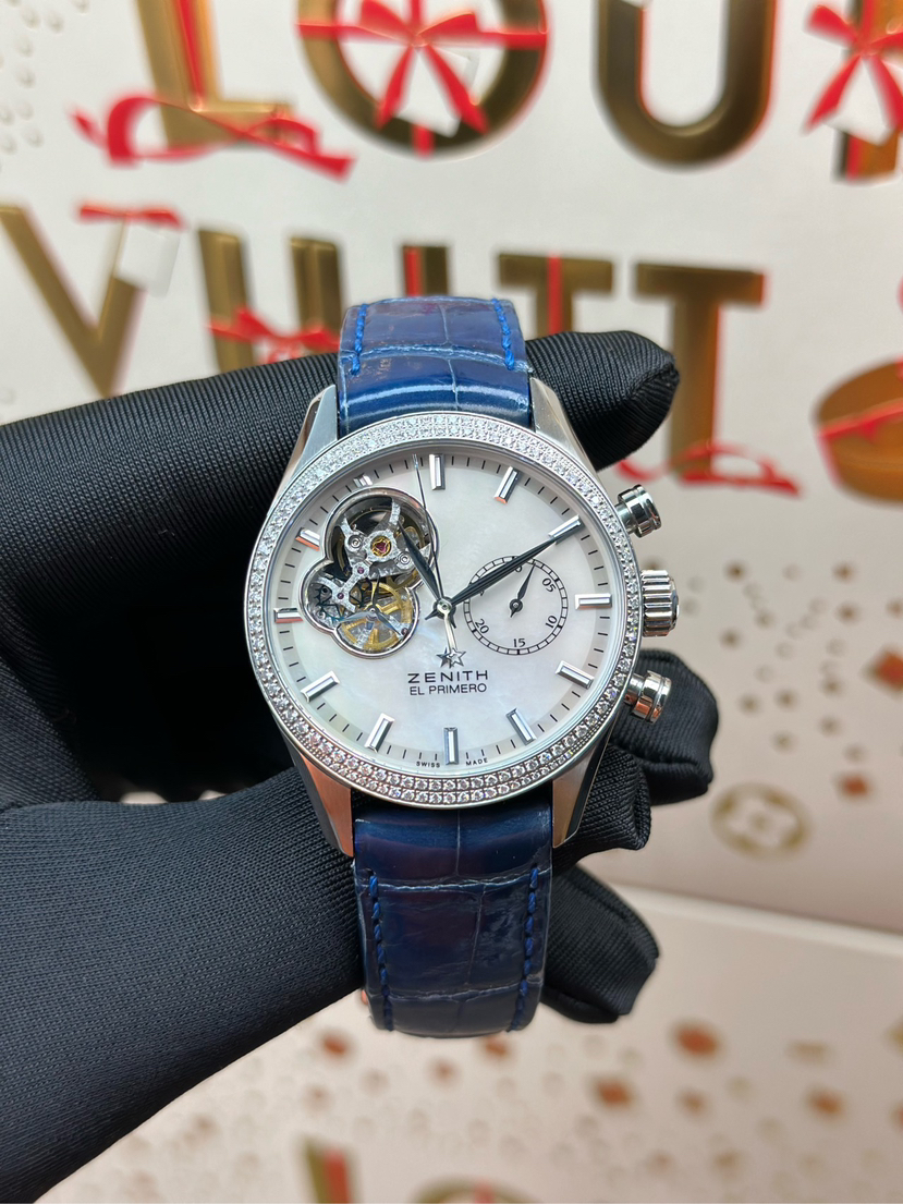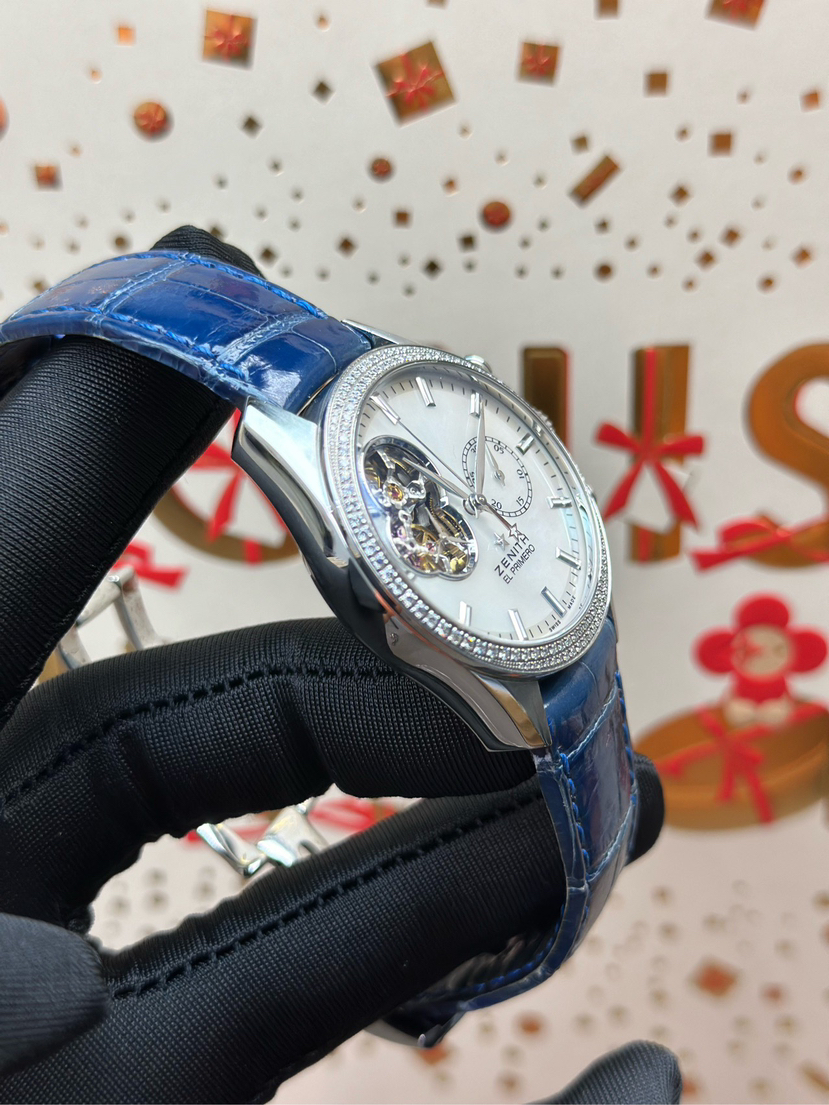 真力时 旗舰系列 16.2150.4062/81.C754 自动机械 38mm表径 白色贝母盘搭配镂空机芯 外圈原钻 15年表、保卡 公价73800 现货好价~