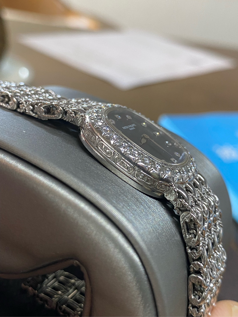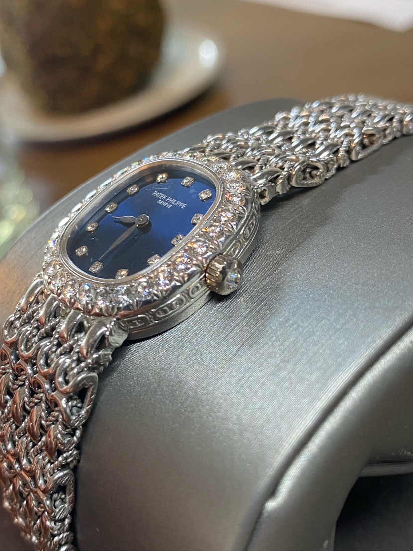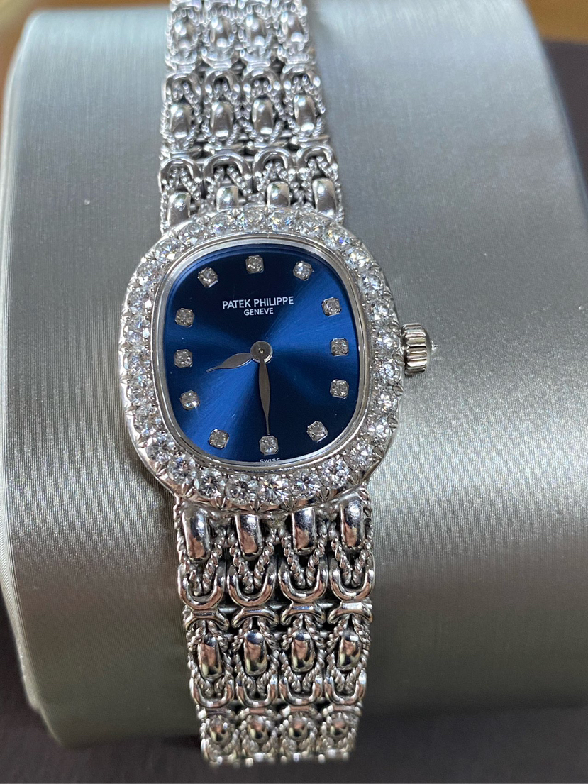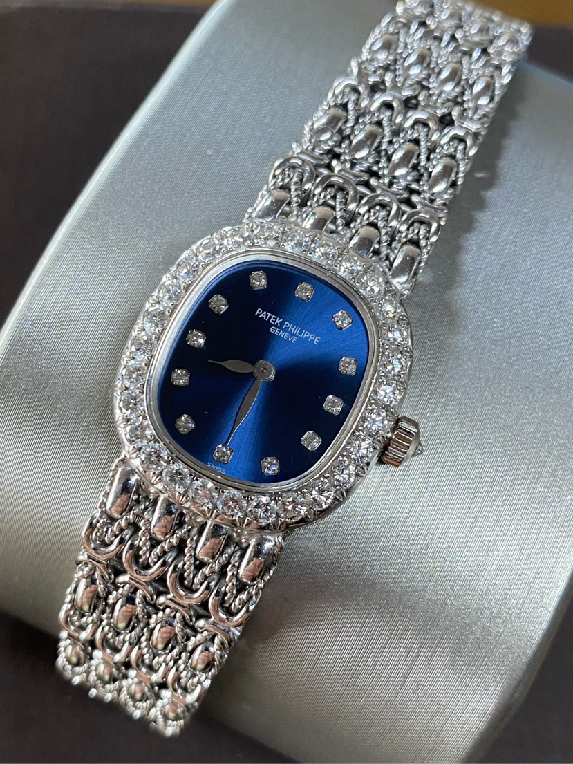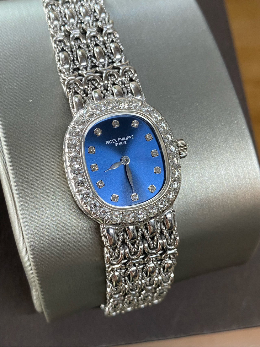 百达翡丽 蓝血贵族 全网唯一型号4931G 原装大钻石 23毫米表径 手动机械机芯 18k白金材质 女表百达翡丽标志性放射蓝色盘面 钻石刻度 把头有一颗大钻,表壳作了手工雕花装饰,手工编织金表带 好看又贴手腕 不得不感叹表王就是表王 艺术品一样 太好看了,专柜价格起码要几十万, 重点是稀少 很难撞款 想拥有专属自己独一无二~