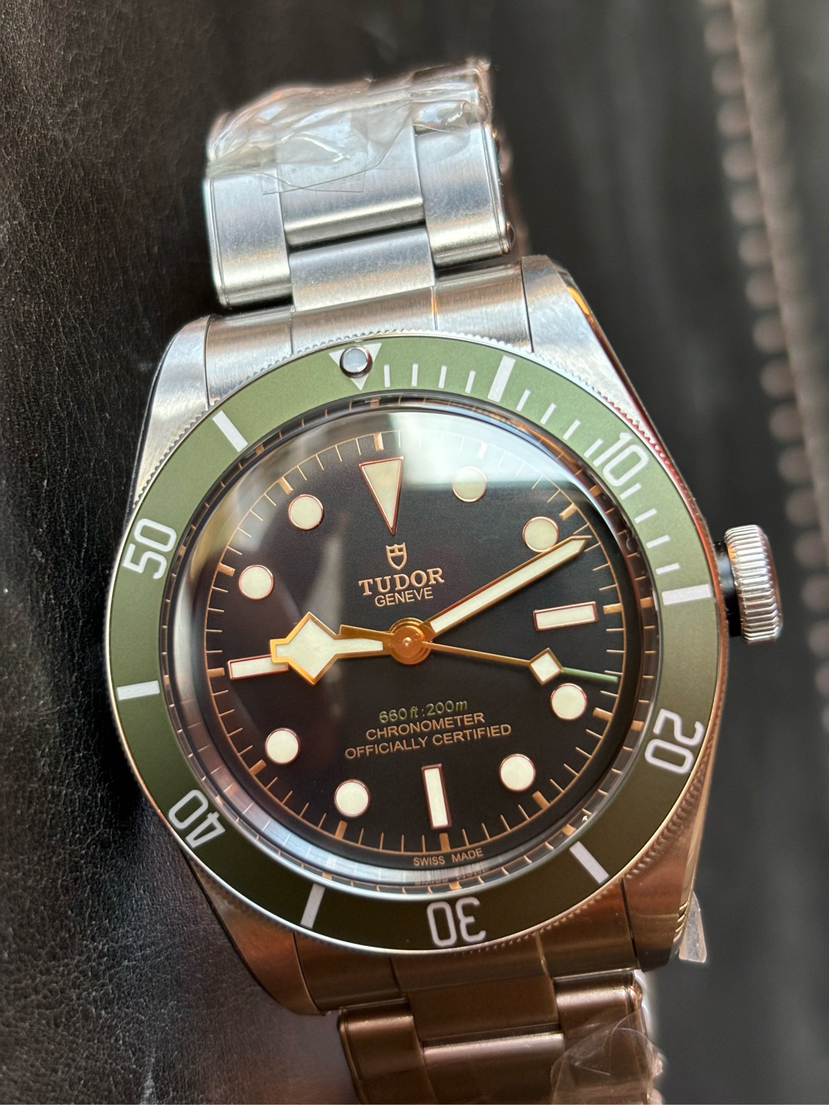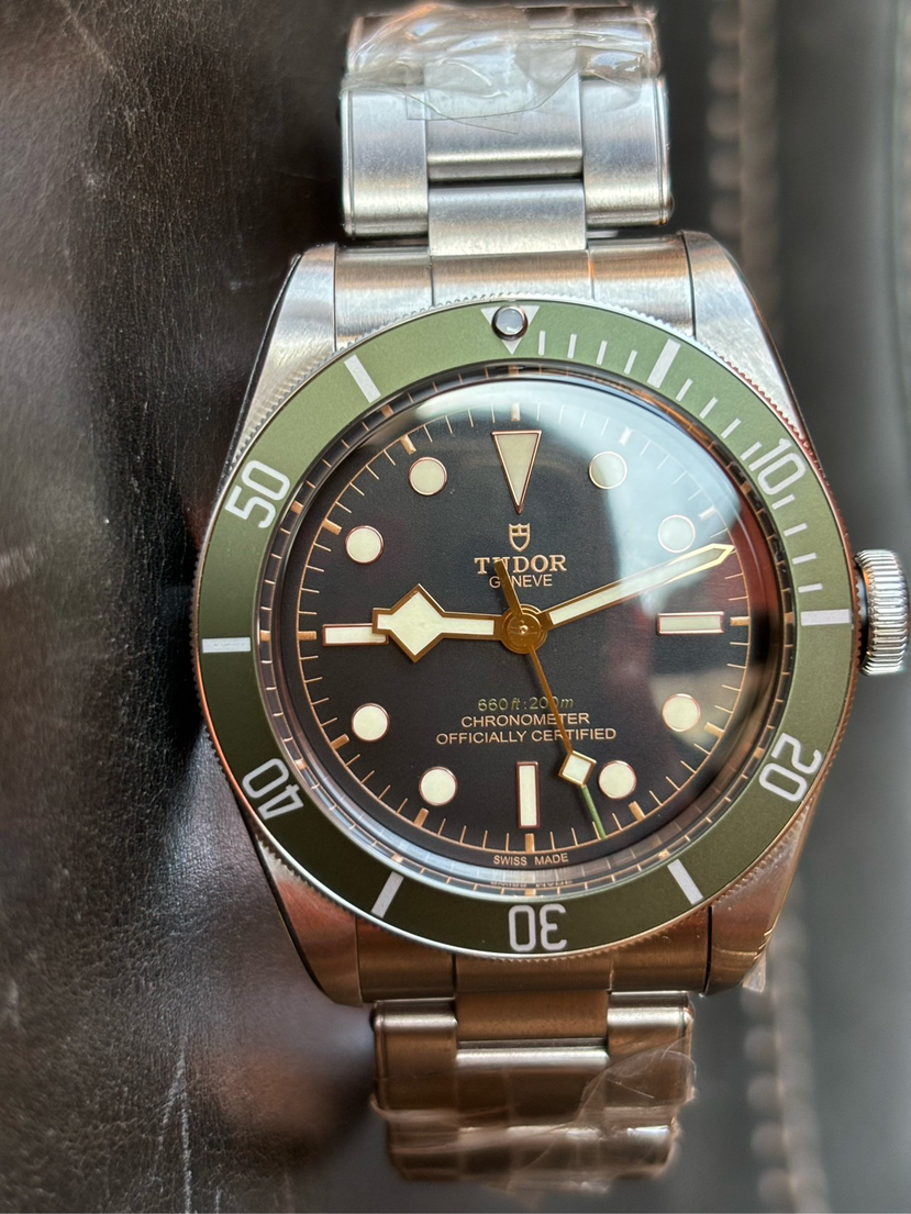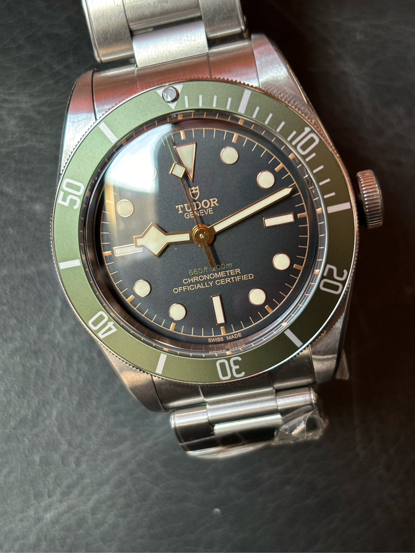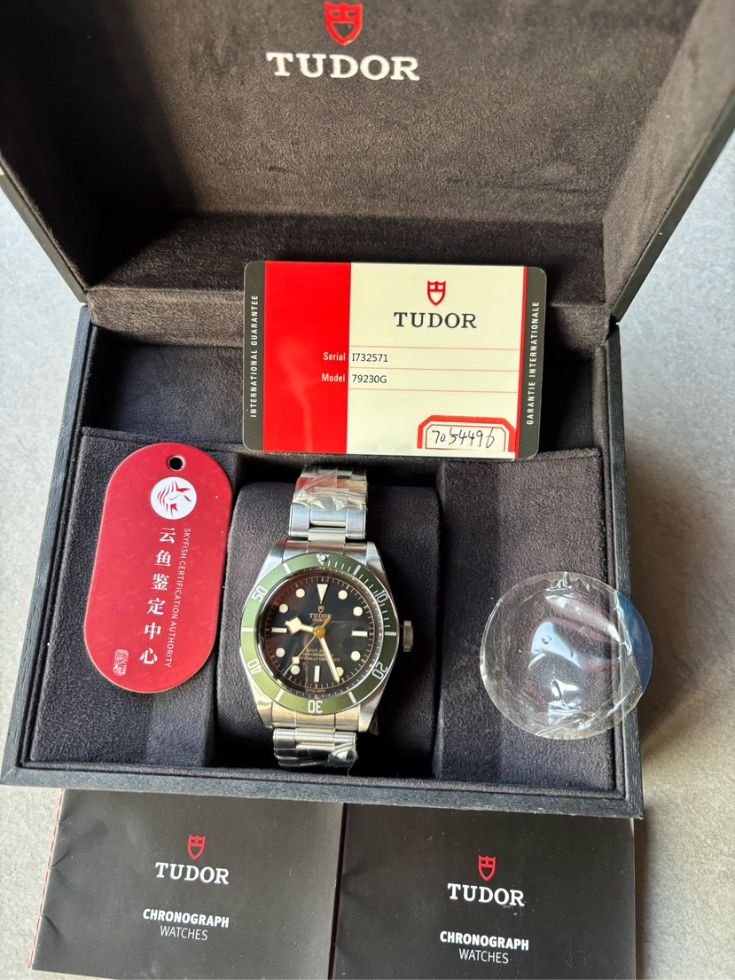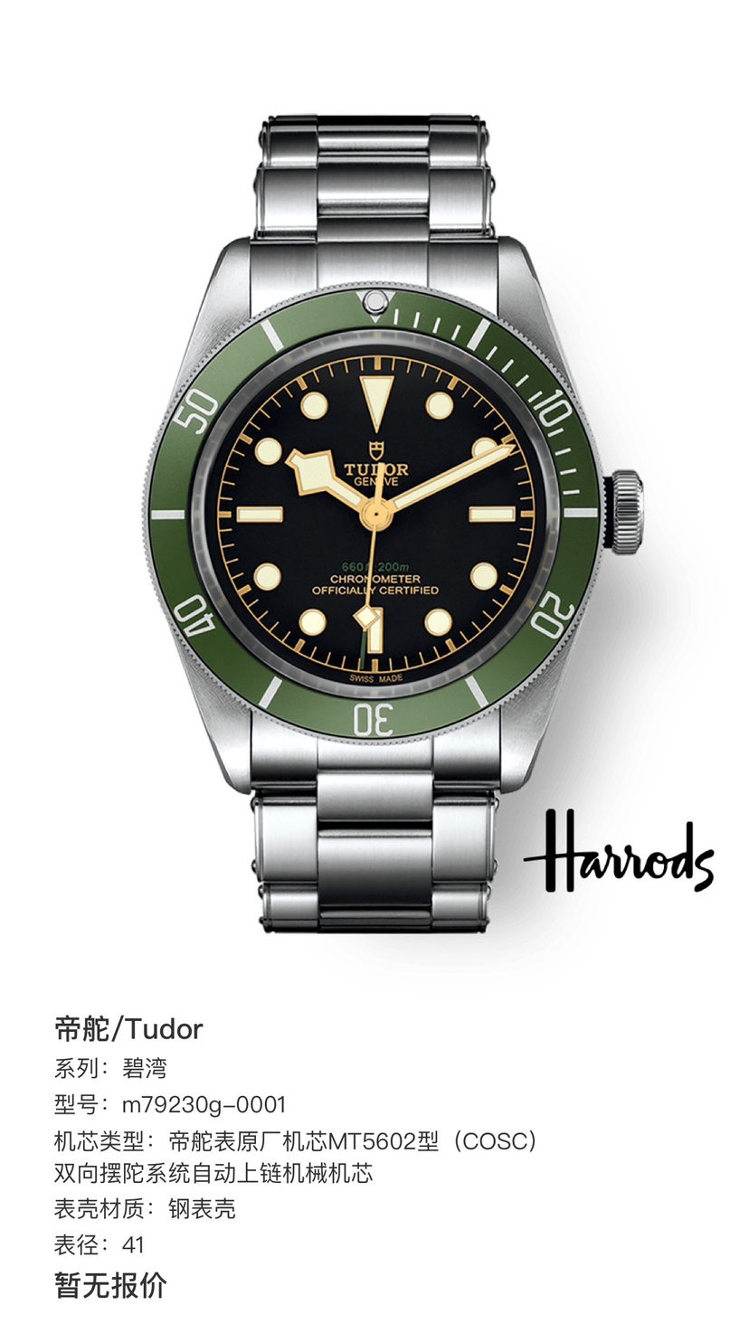 帝舵/Tudor 碧湾 m79230g-0001 已挂云鱼吊牌,正经未使用品!双向摆陀系统自动上链机械机芯 钢表壳 41 帝舵碧湾哈罗德也号称帝舵的"绿水鬼",型号79230,是专为著名的伦敦Harrods 百货打造的独家特别版。表圈采用的是标志性的Harrods 绿色。这一Harrods 标志性色彩还被应用在了秒针的尾端和6点钟上方的签字上,防水深度"660ft/200m"采用就是Harrods绿。~全网唯一,现货好价!