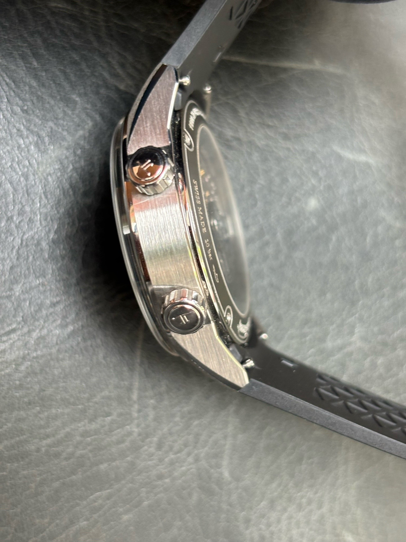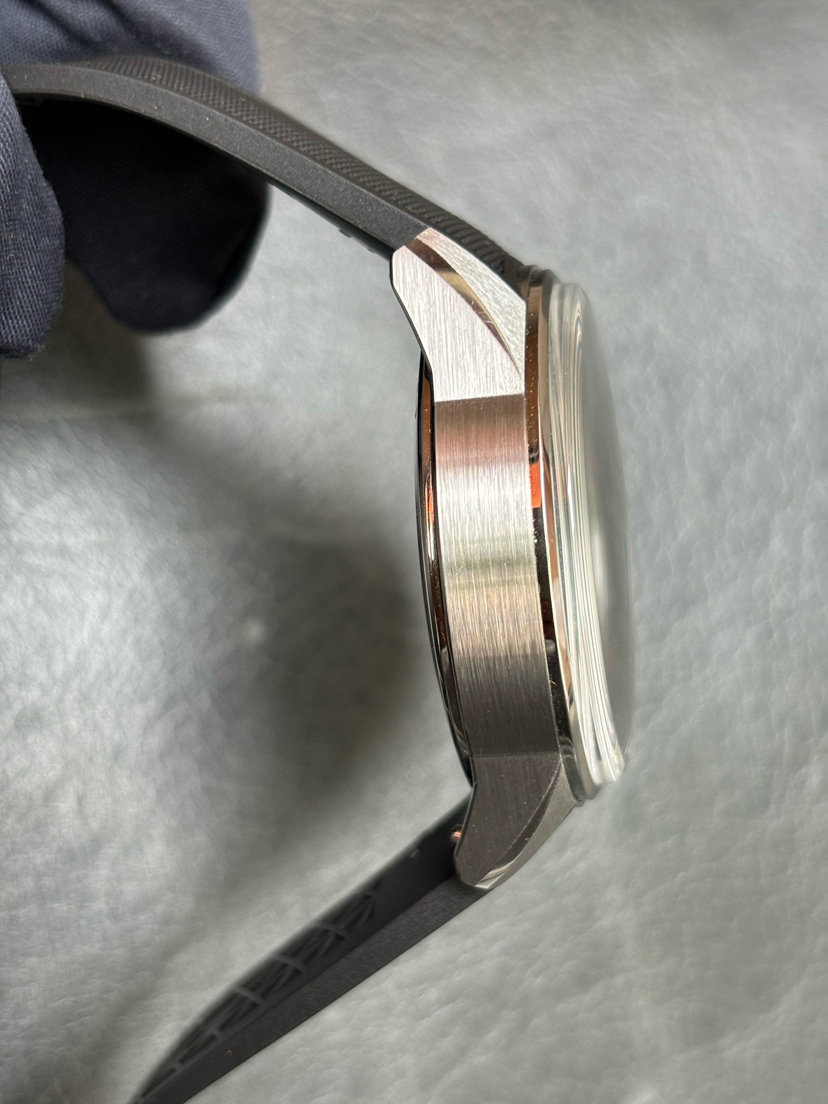 新款北宸背透款,42mm黑色表盘,夜光刻度指针,日历显示,个性内嵌式旋转计时表圈,精钢打造,超薄设计,搭载新款背透自产自动上链机芯,运动表带,折叠表扣,200米防水,已延保八年!