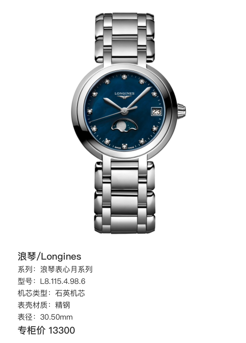 24年全套 浪琴 心月系列 L8.115.4.98.6 石英机芯 精钢 30.5mm表径 专柜价13300 现好价~