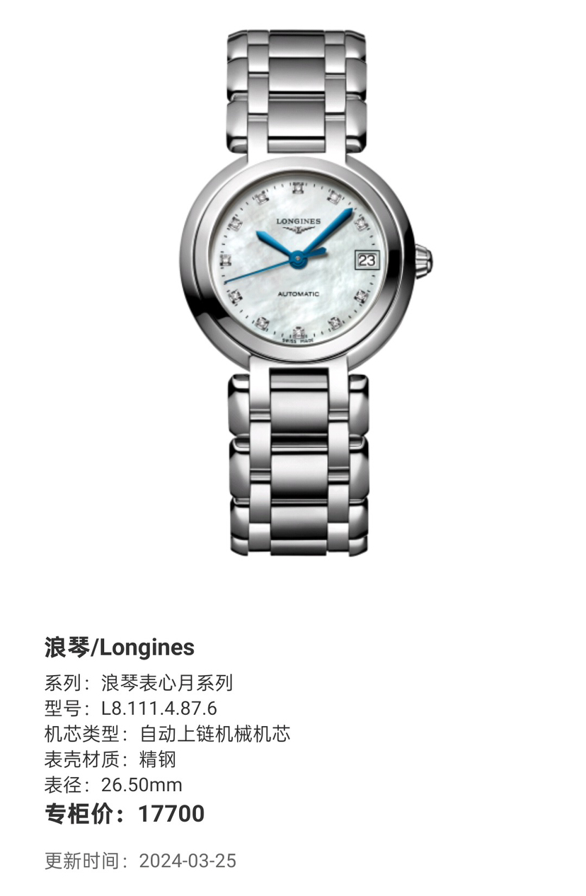 浪琴/Longines 浪琴表心月系列 L8.111.4.87.6 自动上链机械机芯 精钢 26.50mm 专柜价17700