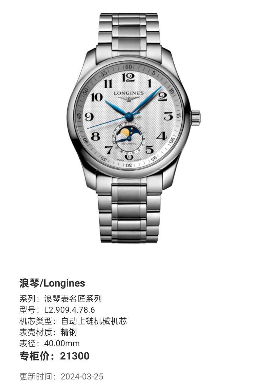 浪琴/Longines 浪琴表名匠系列 L2.909.4.78.6 自动上链机械机芯 精钢 40.00mm 专柜价21300