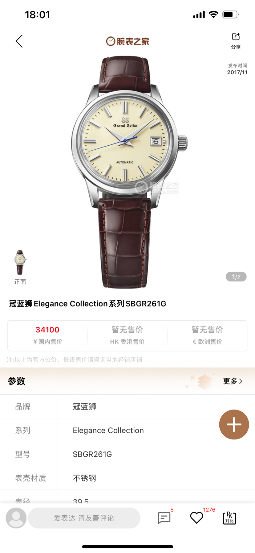冠蓝狮(大精工)EleganceSBGR261G机械男性