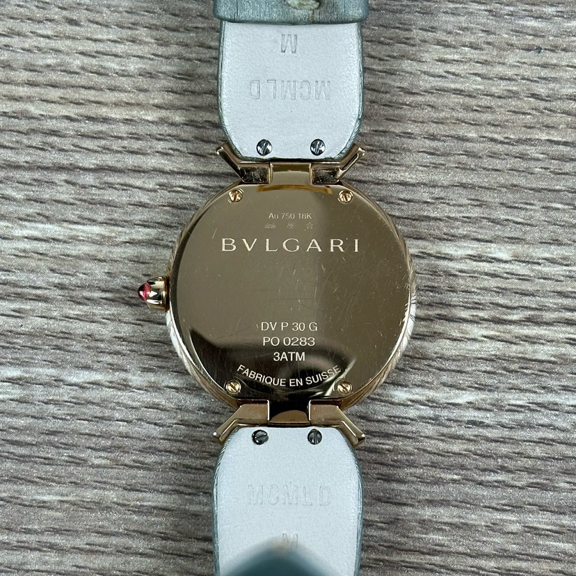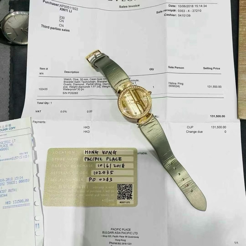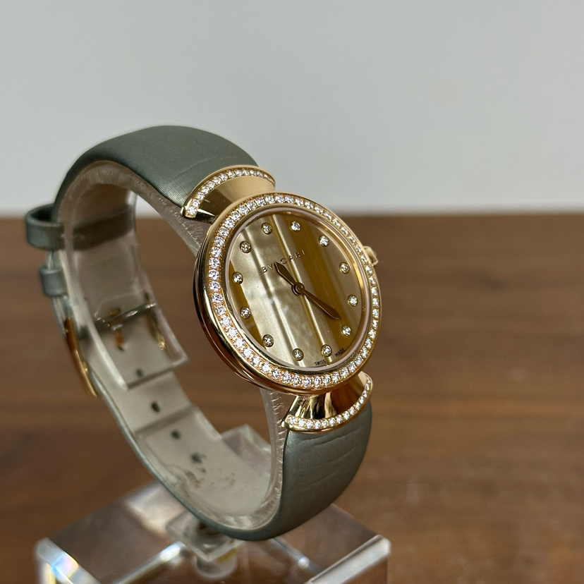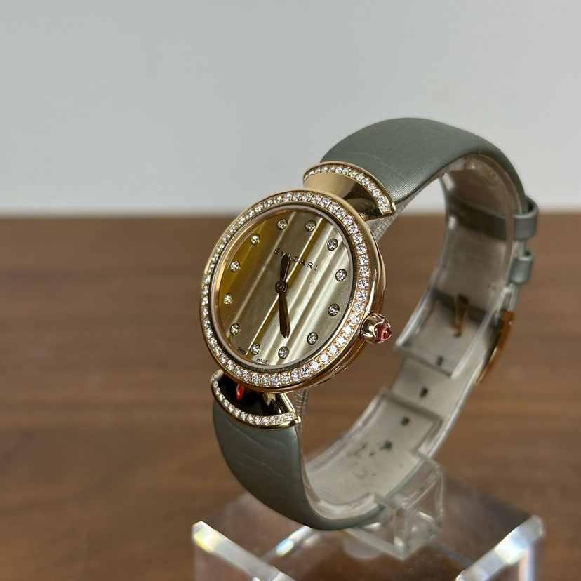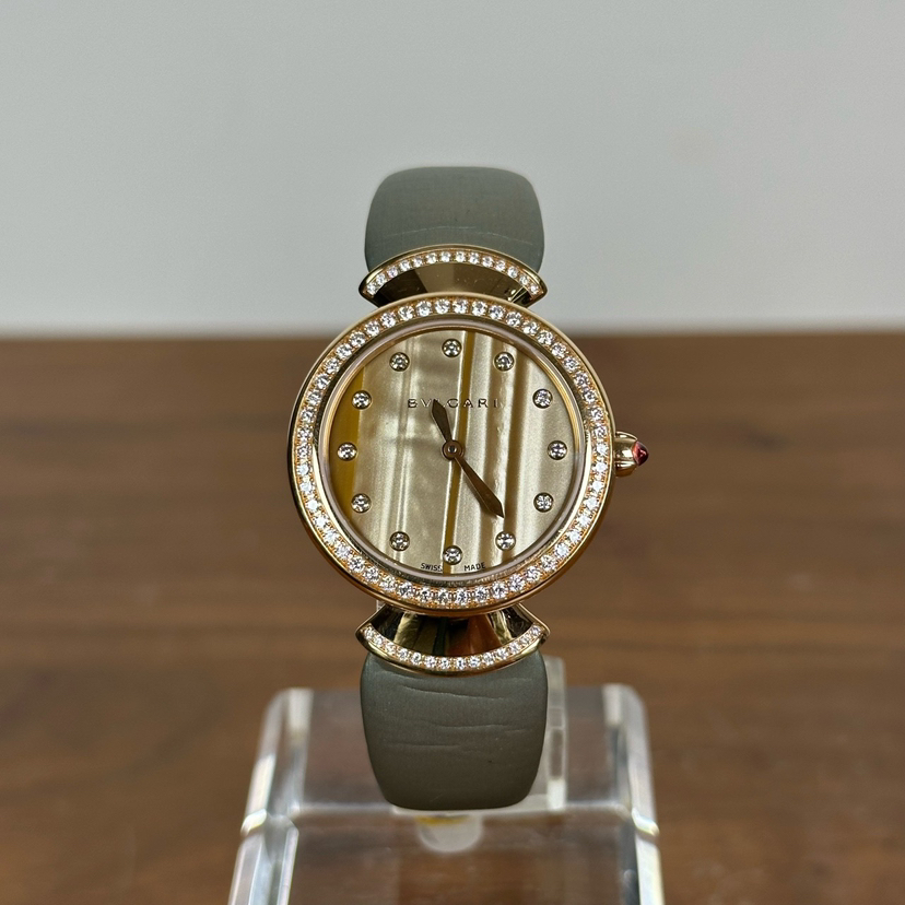 BVLGARI宝格丽Divas Dream系列102435石英女表,30表径。18k玫瑰金材质原镶钻石,贝母香槟色木纹盘面,钻石刻度,金针,很显质感很高级。18年全套,整体成色新,国内公价153000