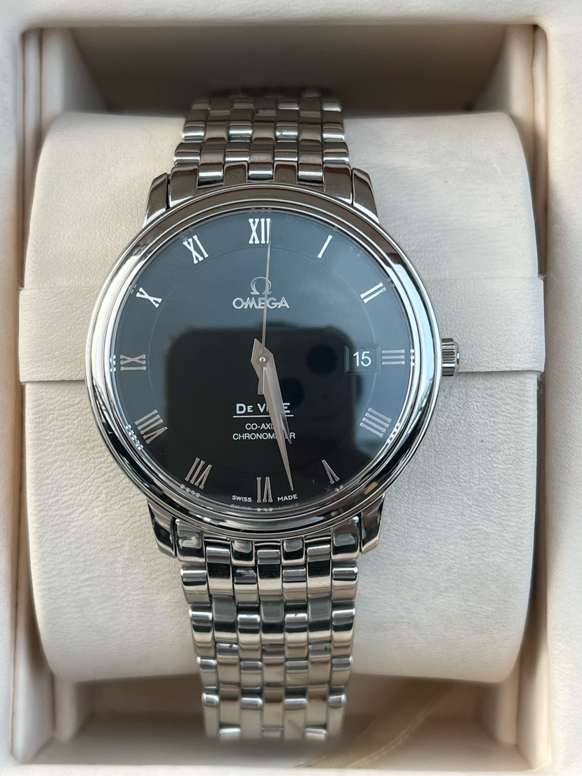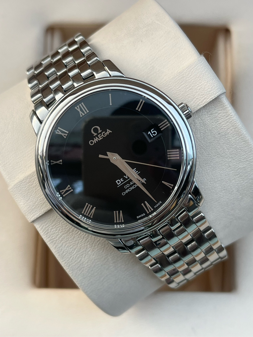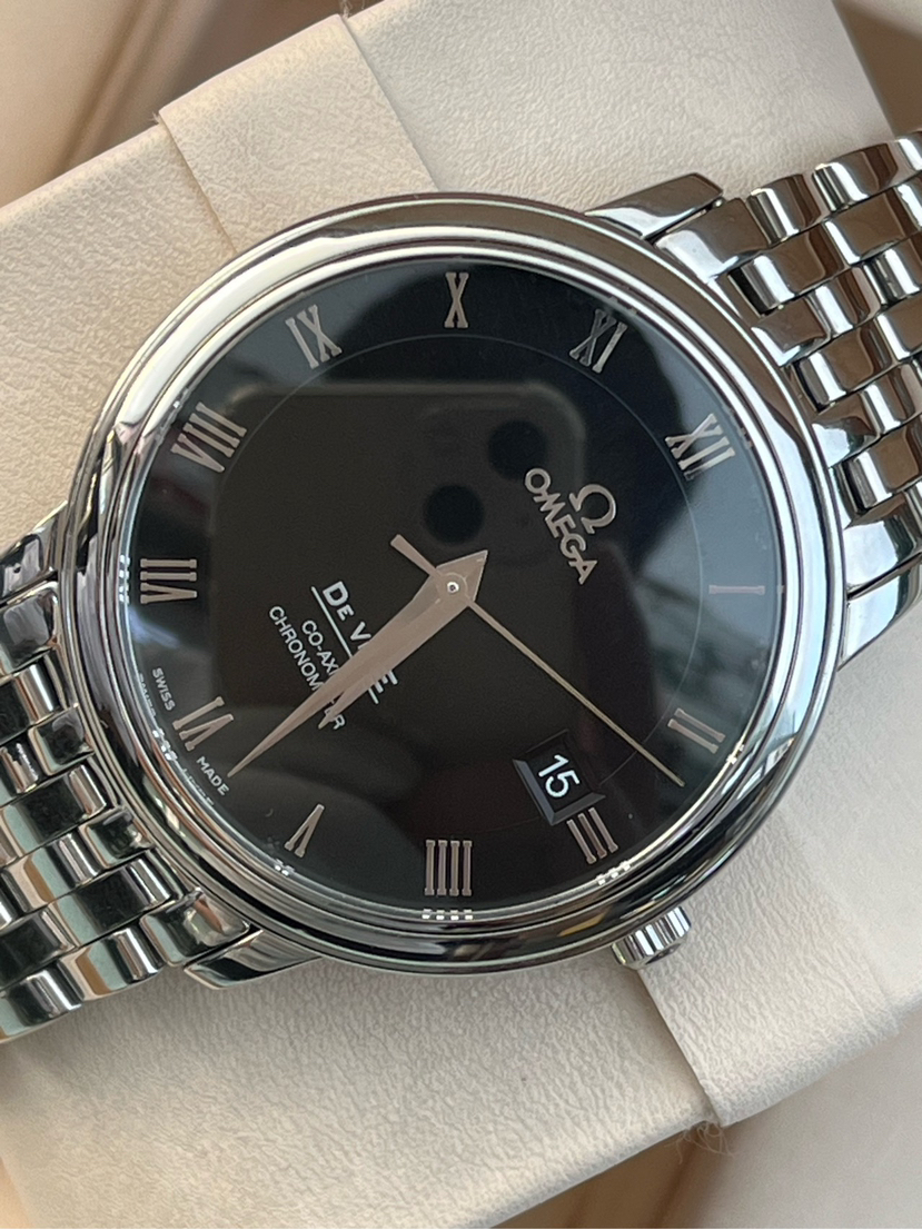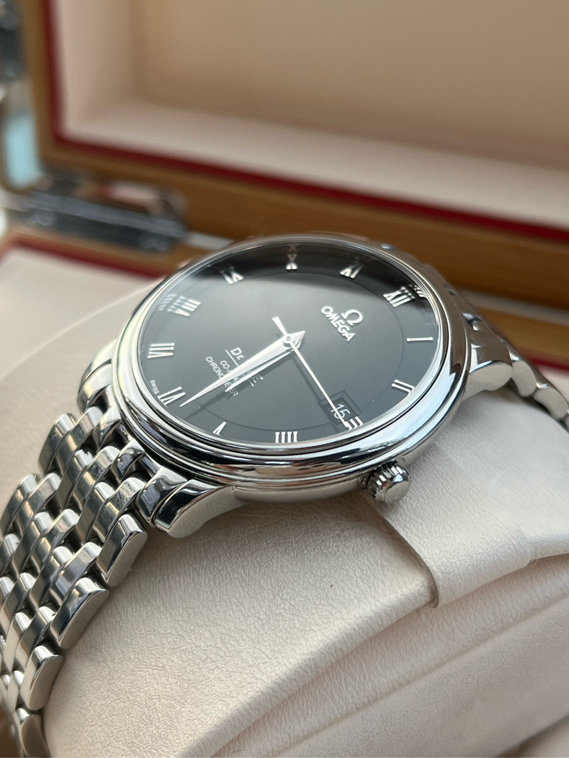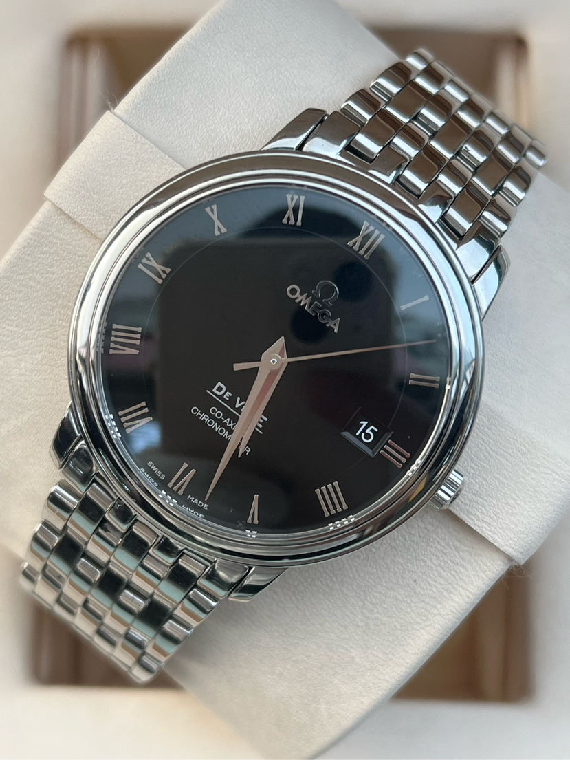 欧米茄碟飞系列4574.50.00、男士自动机械腕表、表径:36.5mm、材质:精钢/钢带、黑色盘面、罗马数字刻度、日期显示、自产2500机芯、单表新成色、原价25300