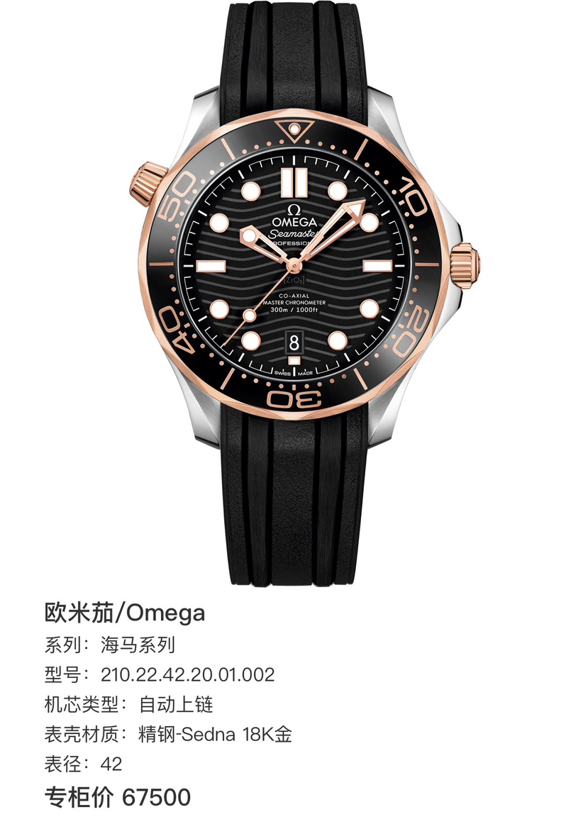 欧米茄/Omega 海马系列 210.22.42.20.01.002 自动上链 精钢‑Sedna 18K金 42 专柜价67500