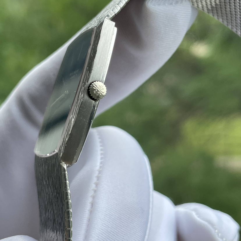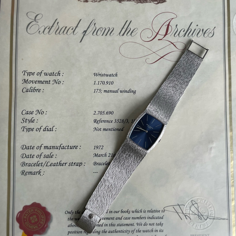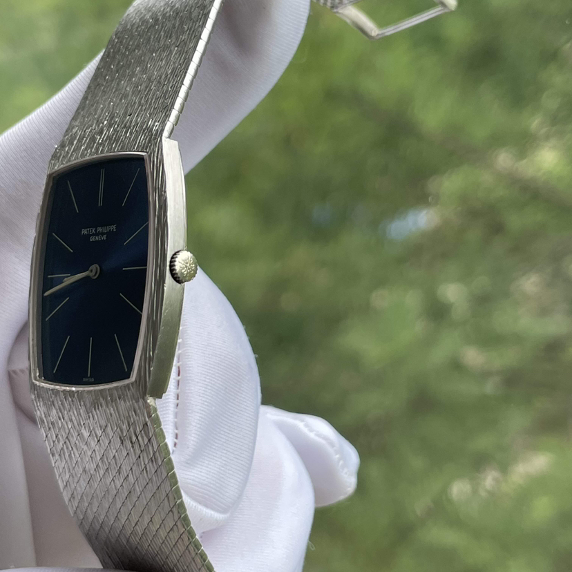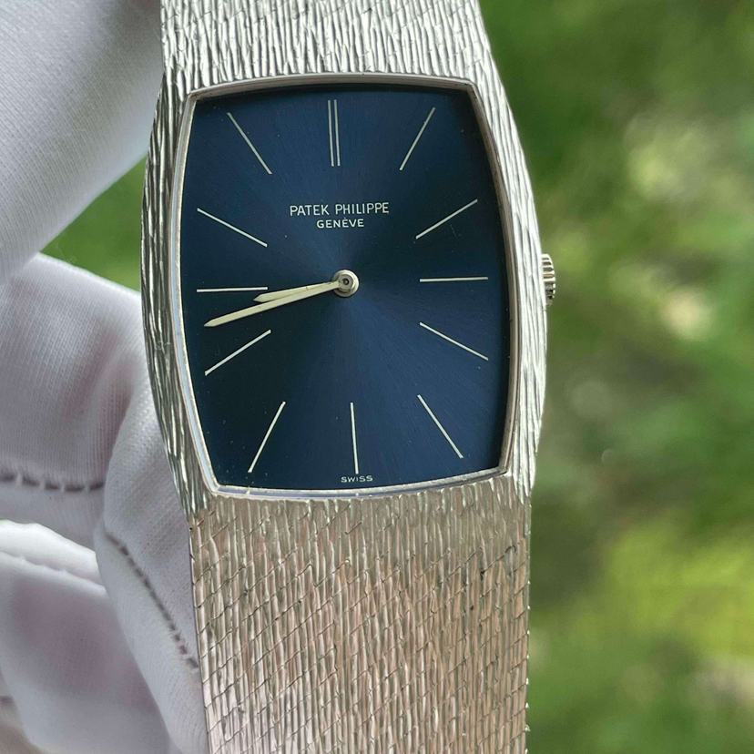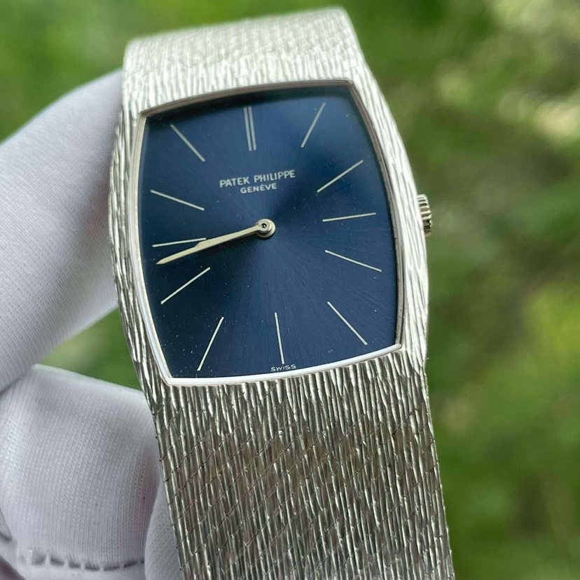 PP百达翡丽 型号3528 18k白金酒桶型手动机械腕表 表径32mm 品相完美 特殊拉丝纹表带 高颜值蓝面 克重86