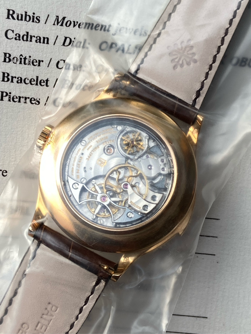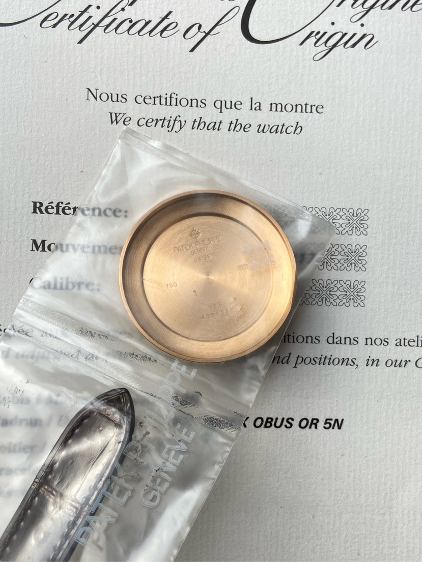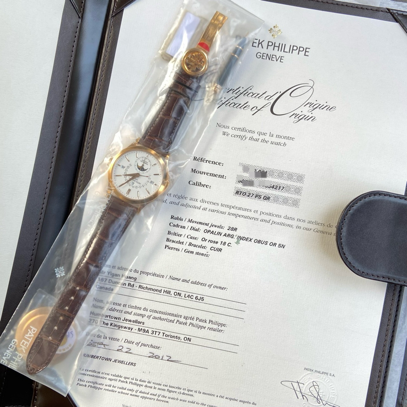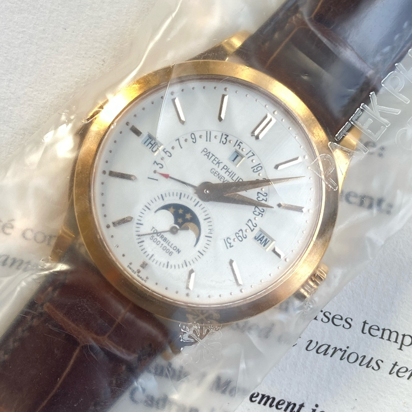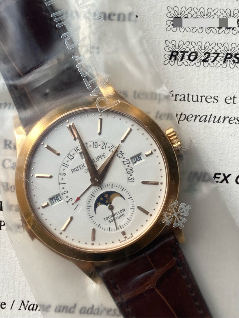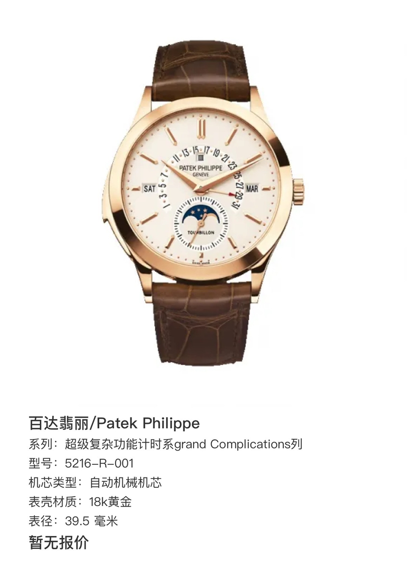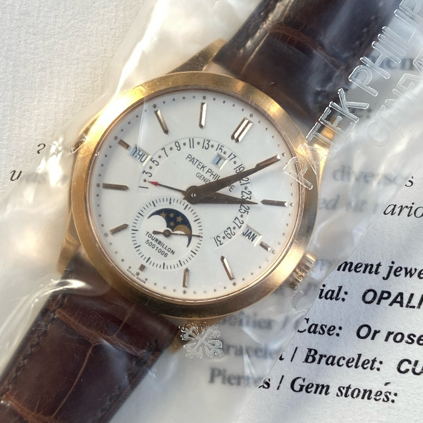 收藏品 单封 百达翡丽超级复杂功能时计系列男士手动机械腕表 5216R-001型号 39.5毫米表径 白色表盘 条钉刻度 日期 星期 月份 万年历 月相 陀飞轮 三问等功能显示 18K玫瑰金表壳 2012年购入 附件齐全 专柜800万左右
