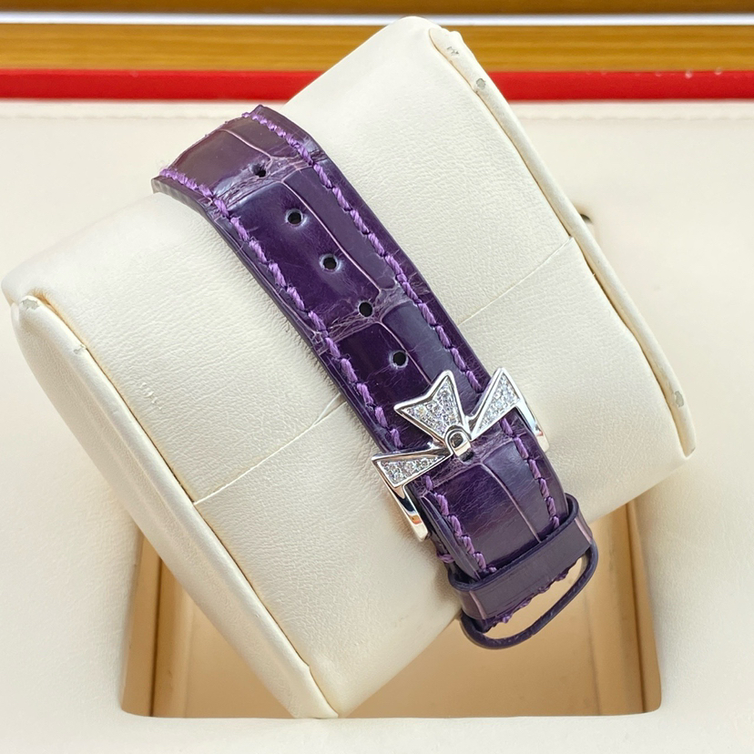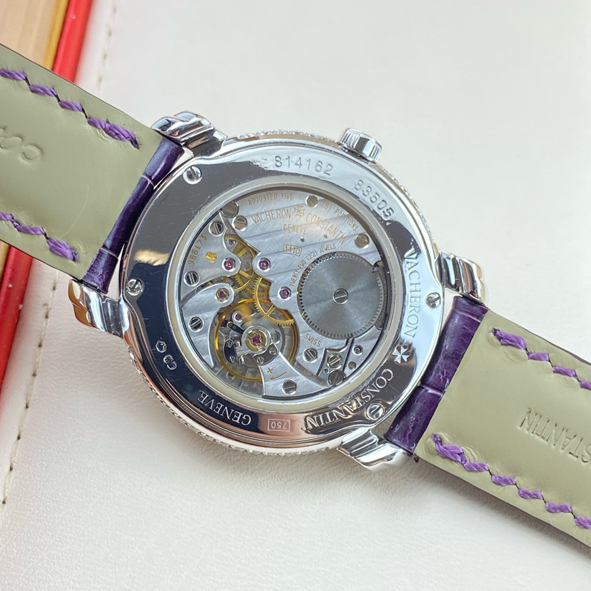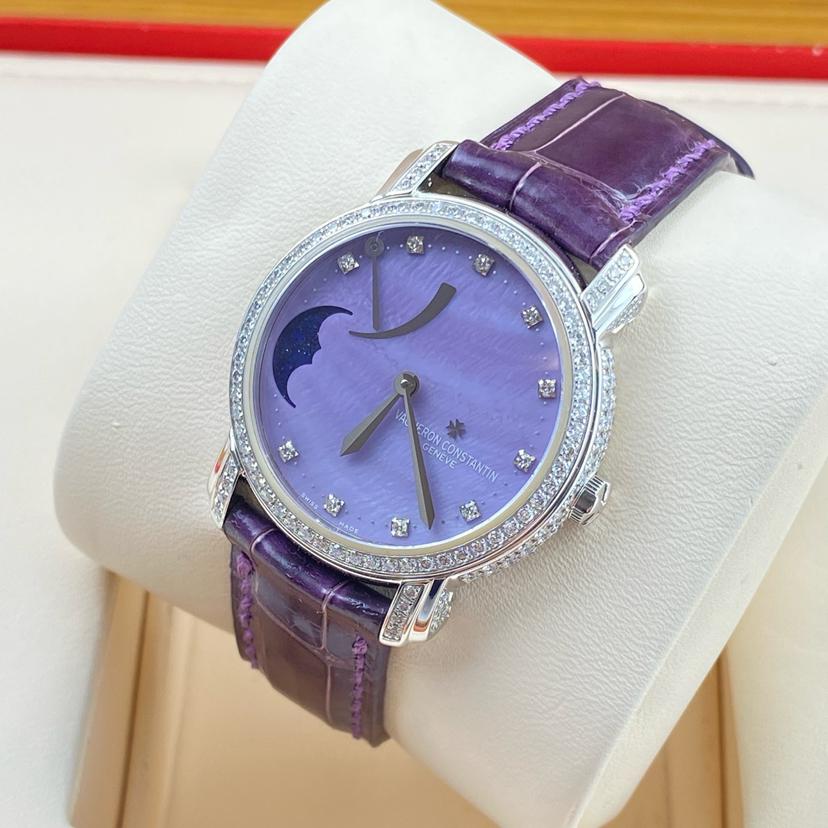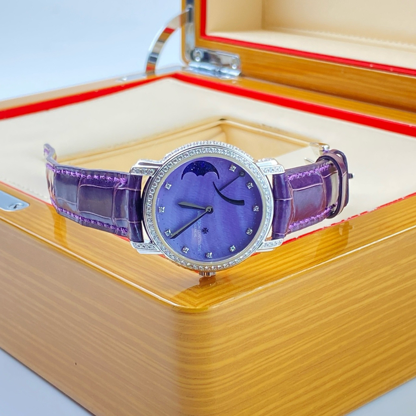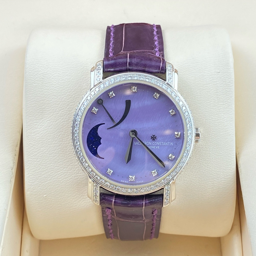 江诗丹顿马耳他系列女士手动机械腕表 83505/000G-9157型号 32毫米表径 紫色表盘 钻石刻度 动力储存显示 月相功能 18K白金材质 表圈原镶钻石 极品成色 专柜385000 超高性价比