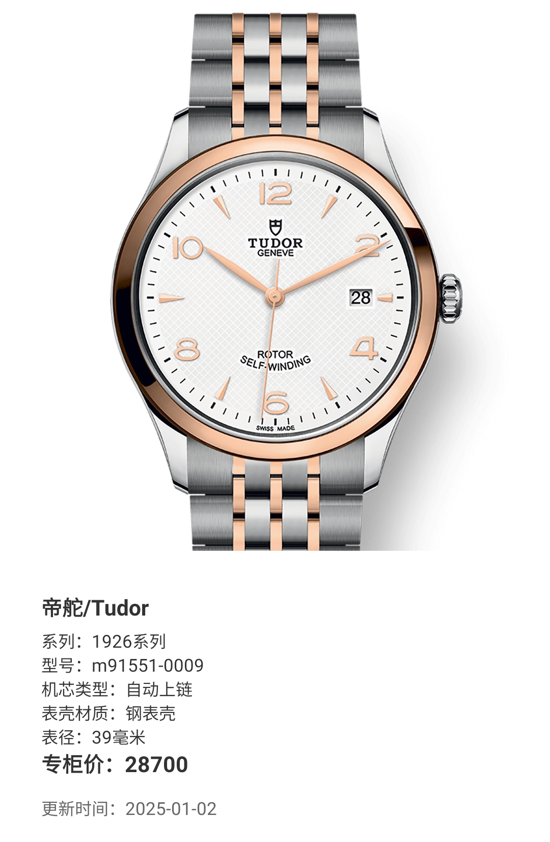 帝舵/Tudor 1926系列 m91551-0009 自动上链 钢表壳 39毫米 专柜价28700 21年全套