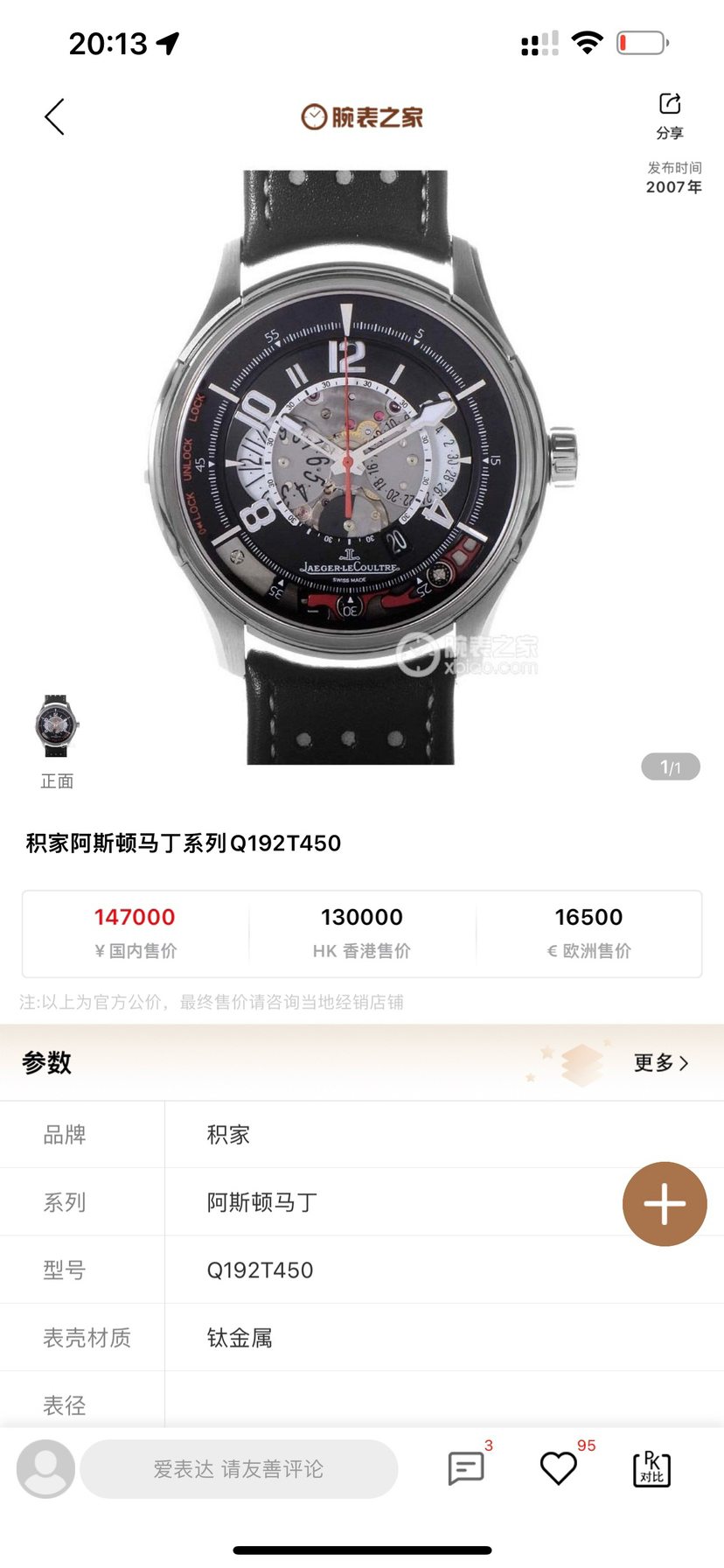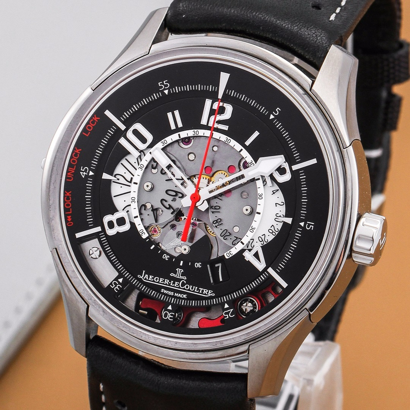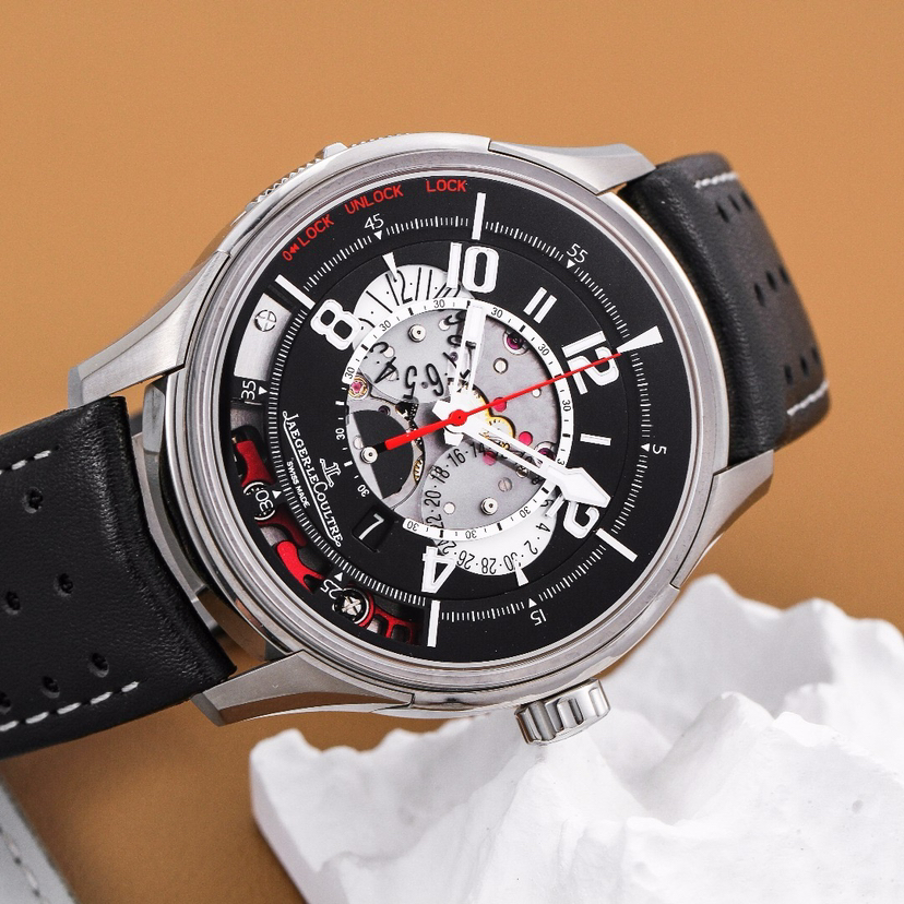 积家阿斯顿马丁系列Q192T450男士机械腕表,表经 44mm,限量619/999枚,钛金属材质,悬浮式半镂空表盘设计,首创垂直按压计时功能,钛金属材质,日历显示,折叠表扣,公价147000元,现货好价
