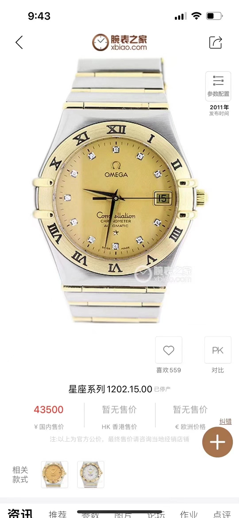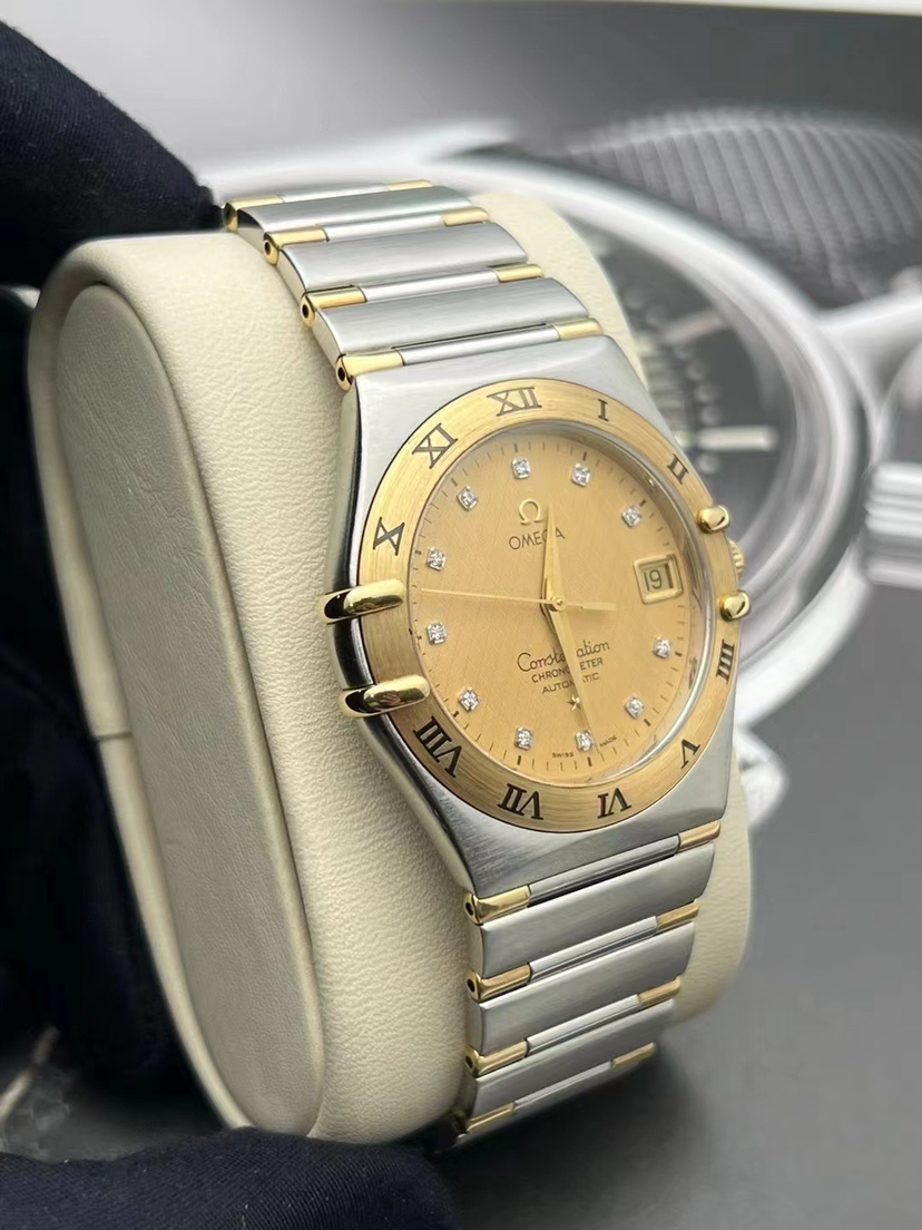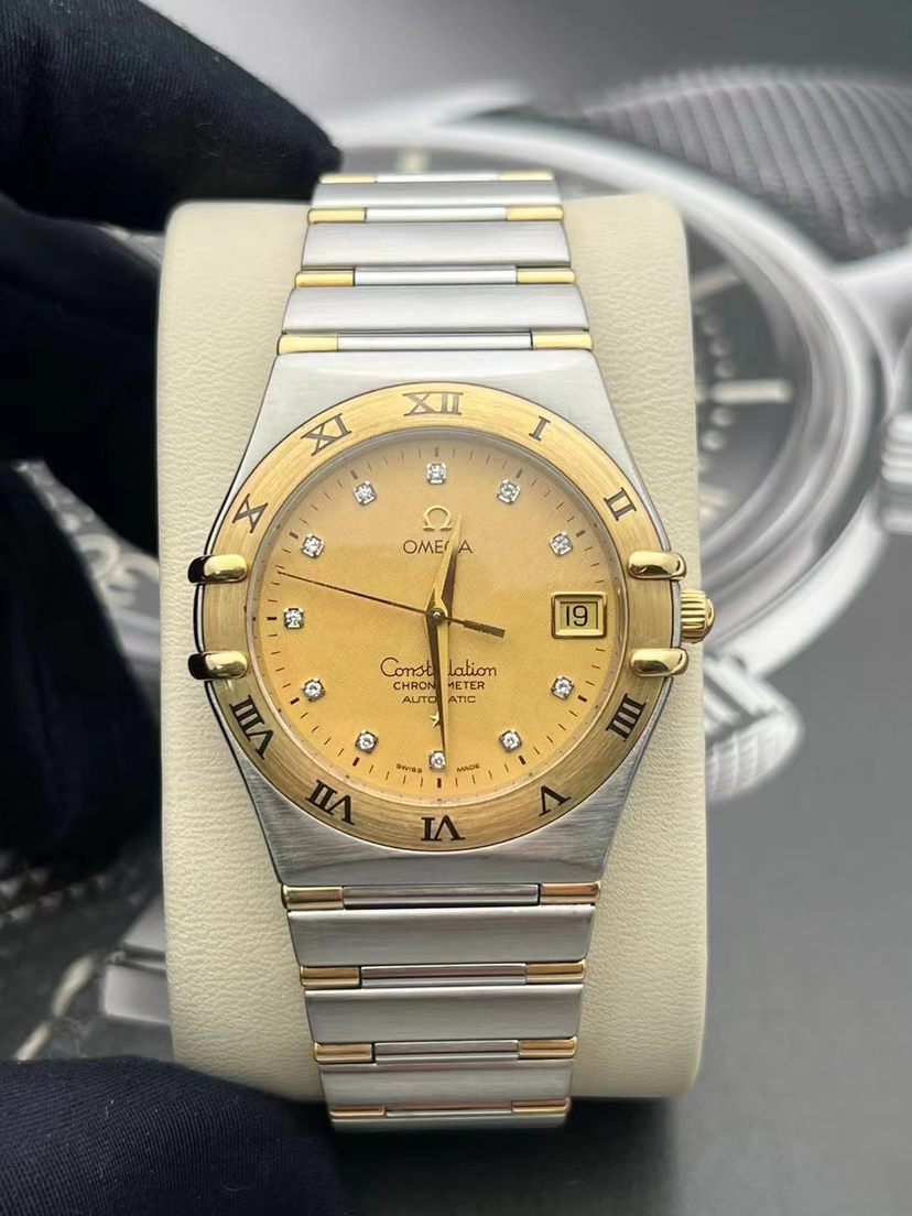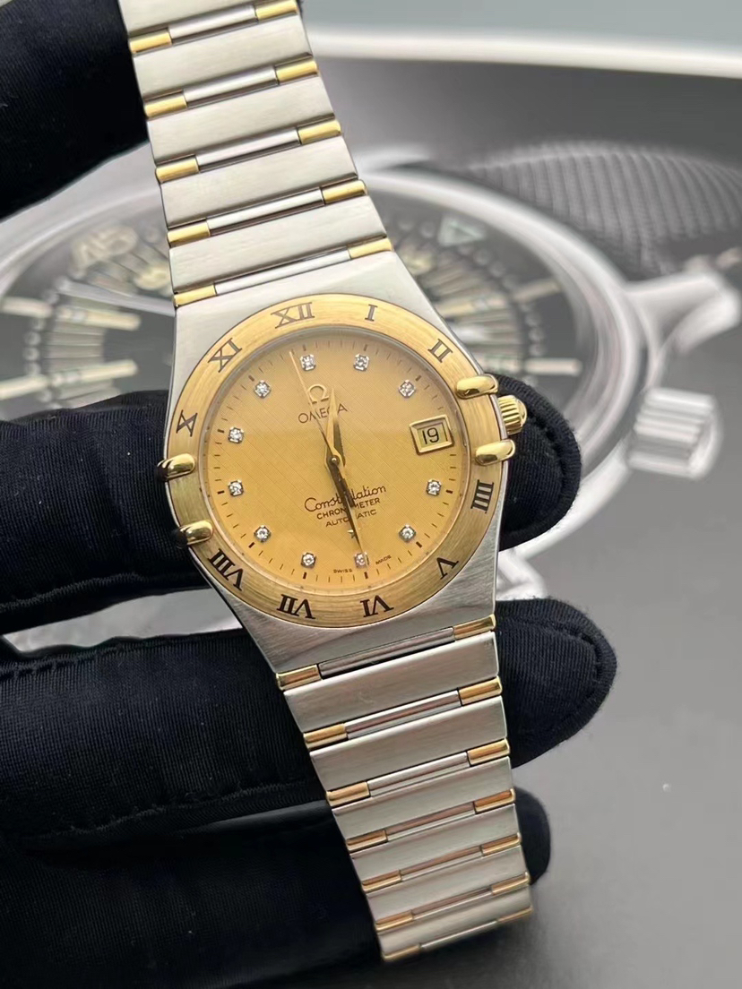 欧米茄星座系列1202.15.00男款自动机械腕表⌚️ 表径35.5mm 金色表盘,镶钻时标,日期显示,18k黄金, 参考售价💰43500 现货好价