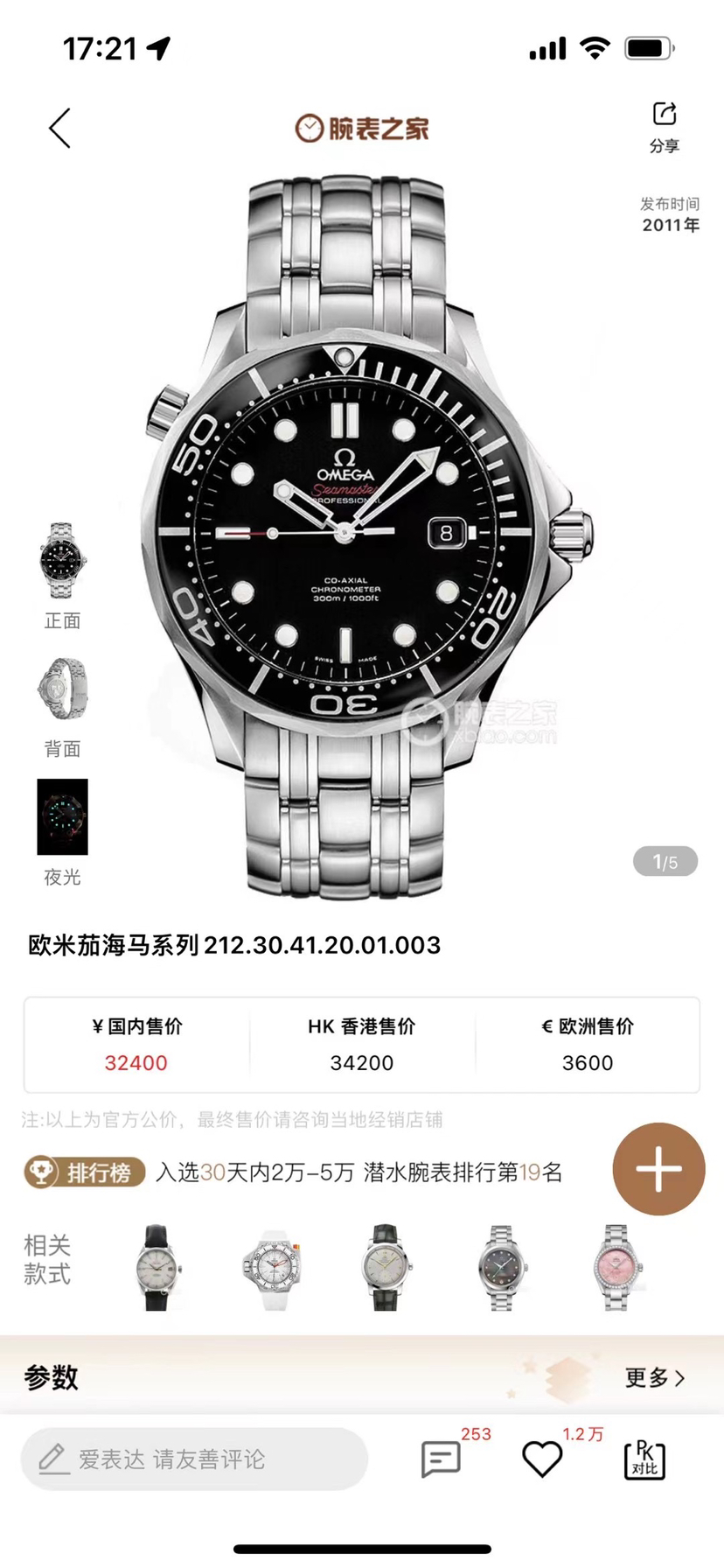 欧米茄海马 海马300米 212.30.41.20.01.003机械男性