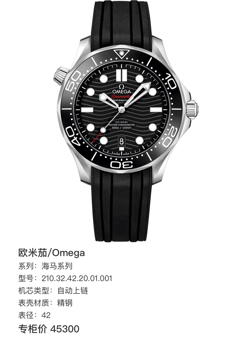 OMEGA/欧米茄 海马系列 210.32.42.20.01.001 300米潜水表 自动机械机芯 夜光 天文台认证 男表 瑞表 42mm 黑色表盘 精钢表壳 橡胶表带~ 专柜价45300 全新全套25年