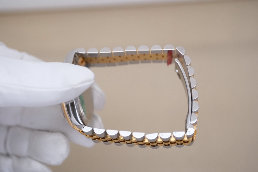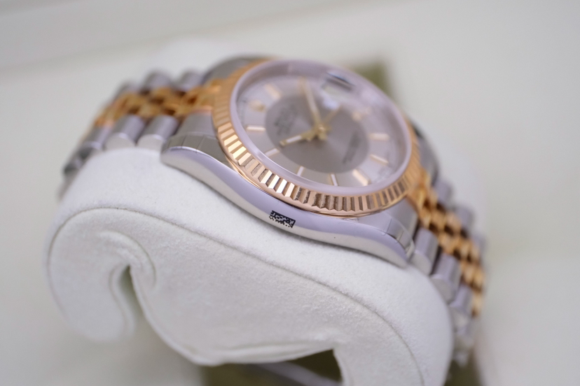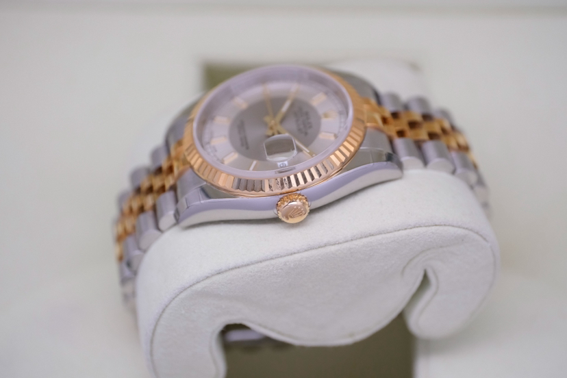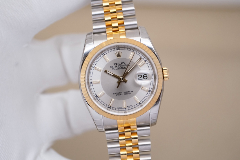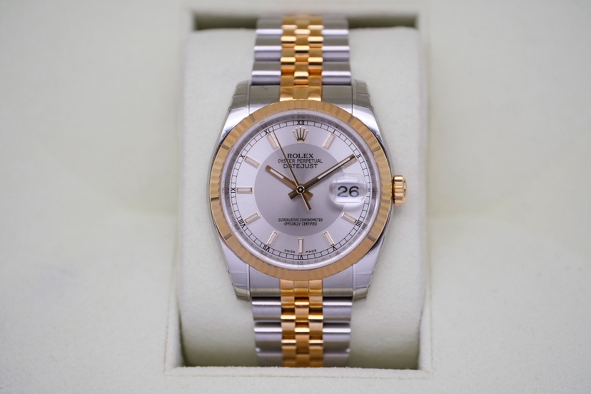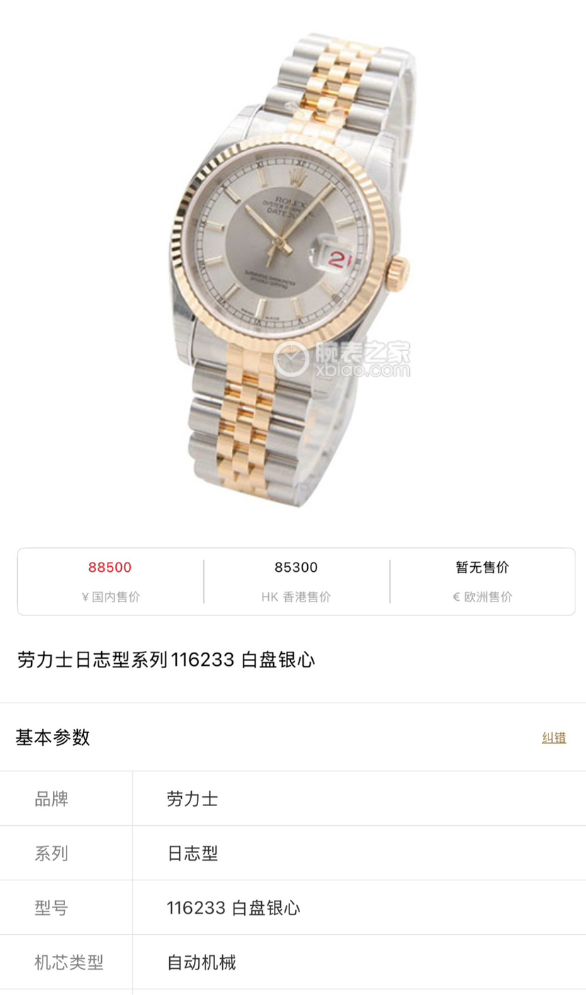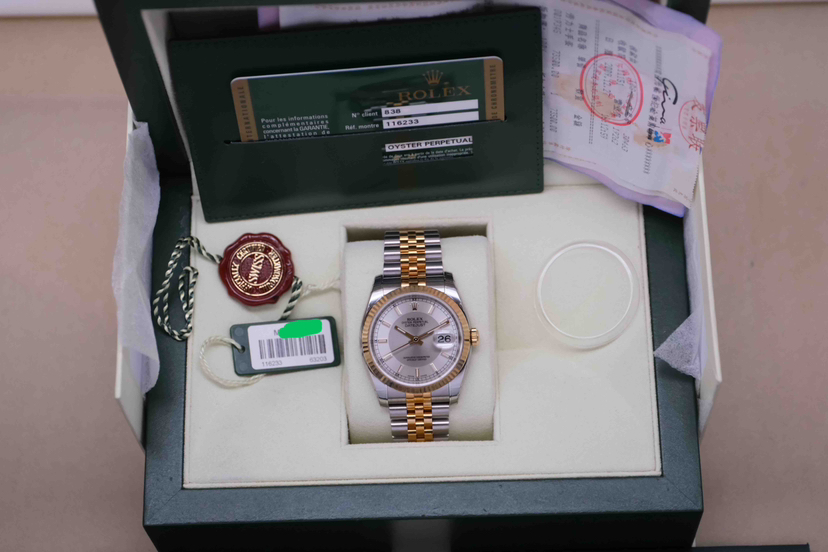 劳力士 日志型系列116233 白盘银心,库存未使用品2009年全套全膜/发票/吊牌,自动机械,表经36毫米,18K黄金/不锈钢,功能:日期显示,专柜价:88500