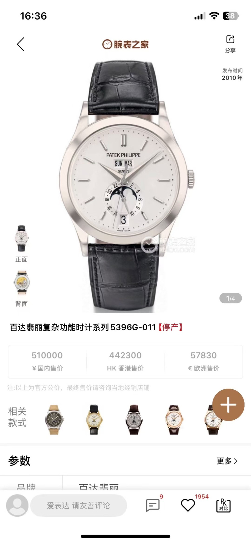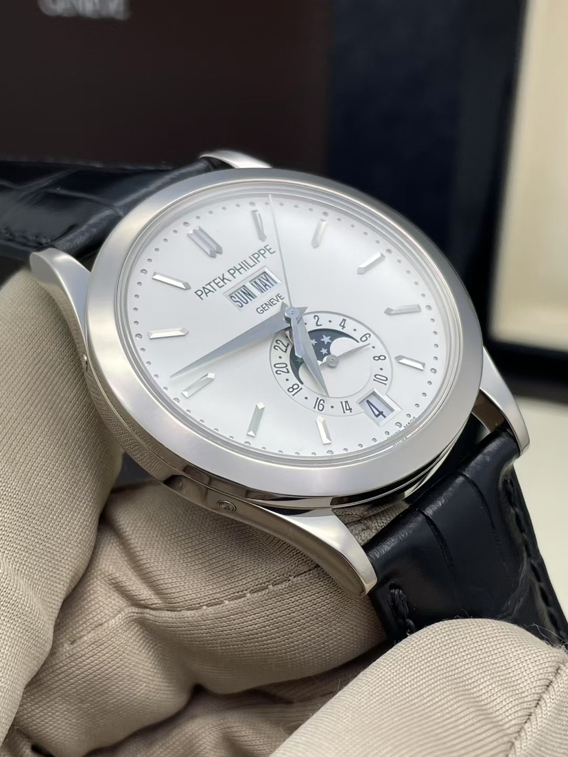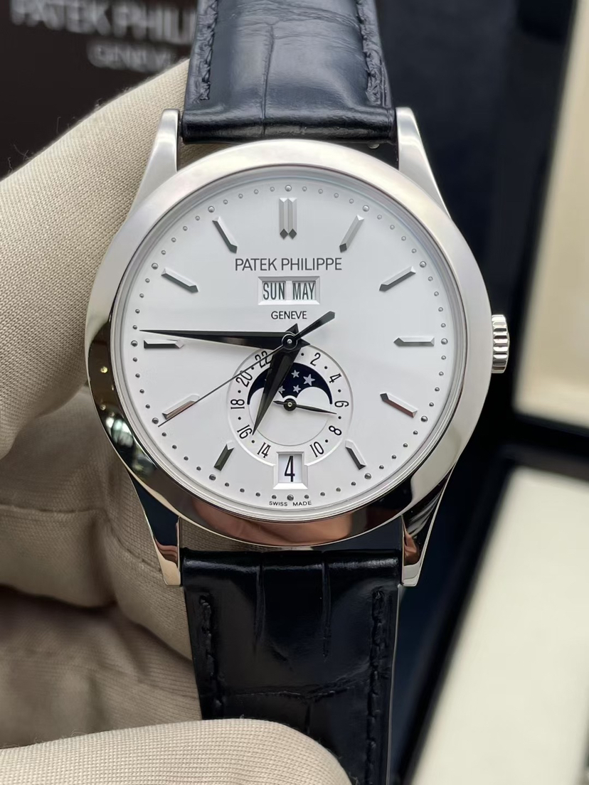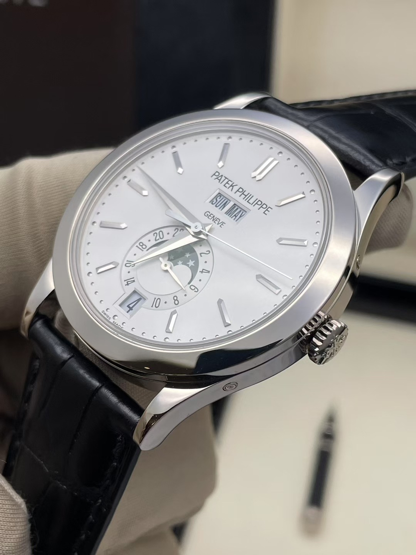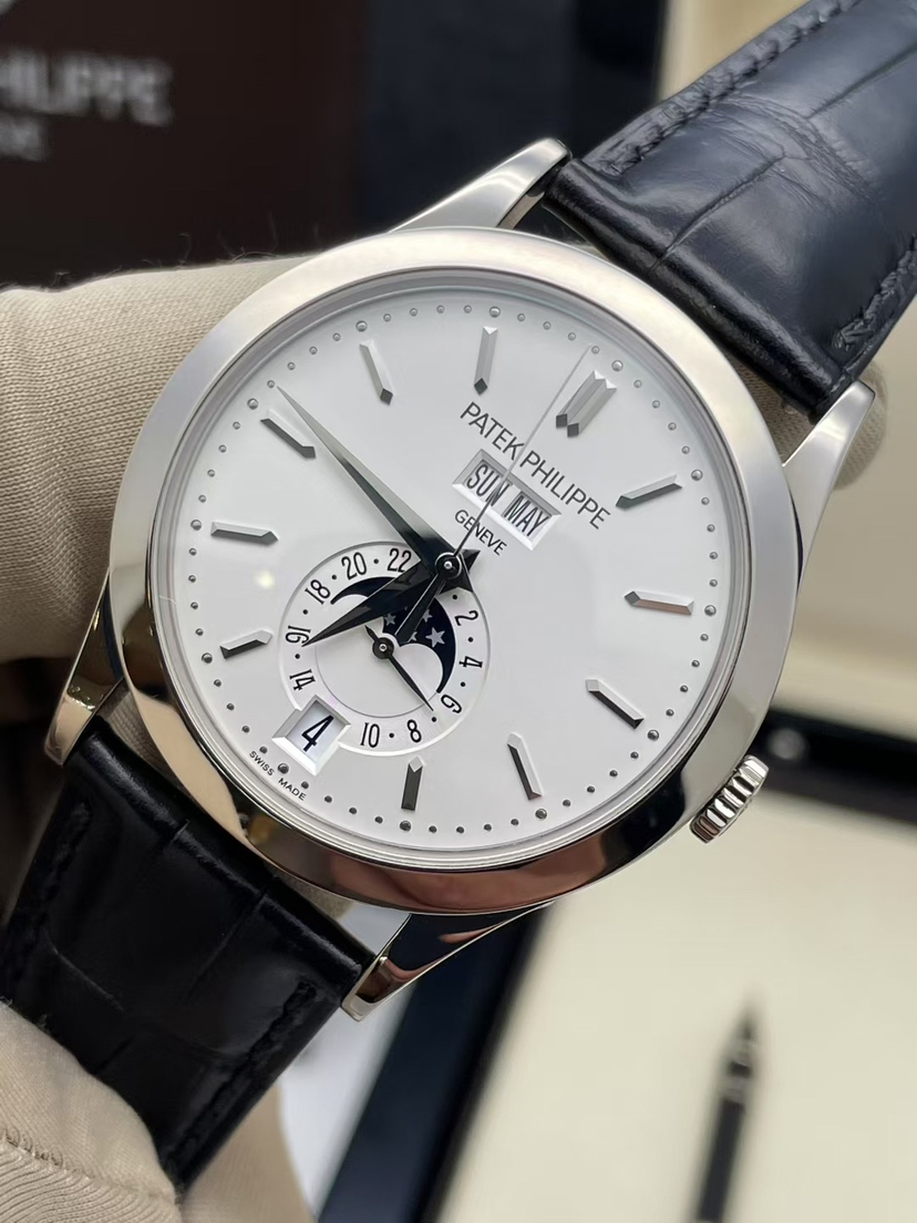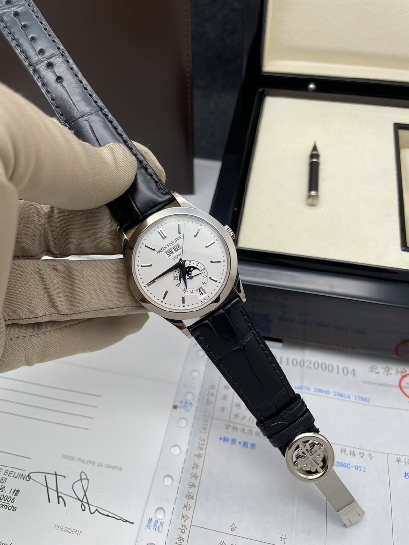 百达翡丽5396G-011、18k白金象牙白表盘年历月相功能、39口径 专柜公价510000