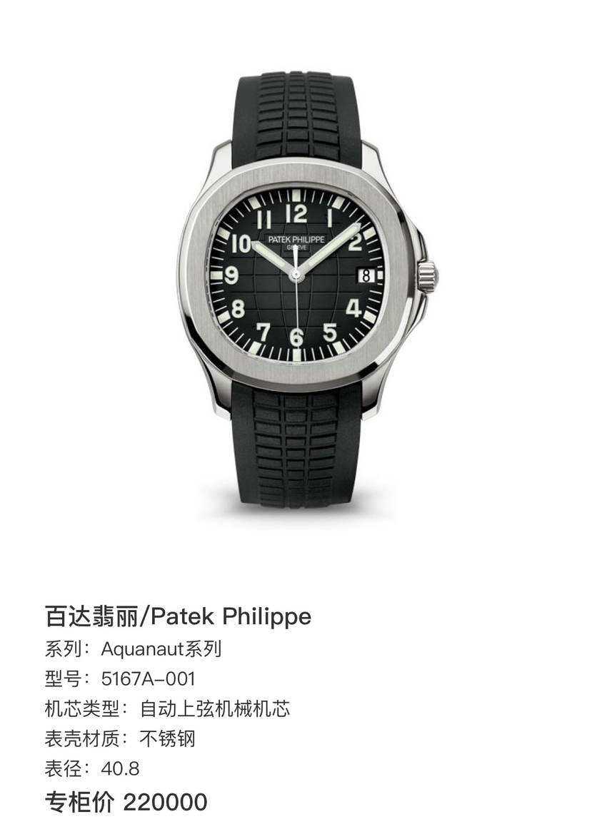 百达翡丽/Patek Philippe Aquanaut系列 5167A-001 自动上弦机械机芯 不锈钢 40.8 专柜价220000