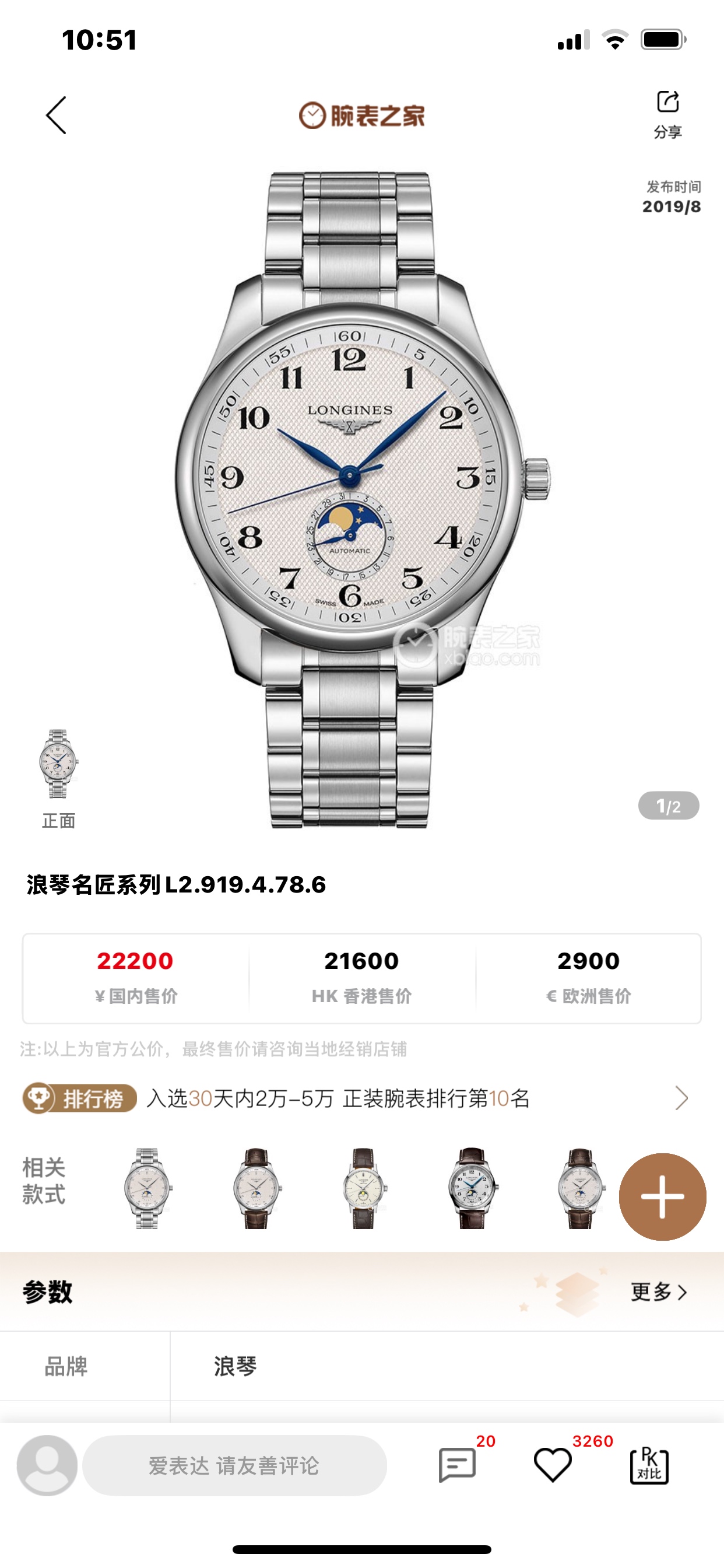 浪琴名匠L2.919.4.78.6机械男性